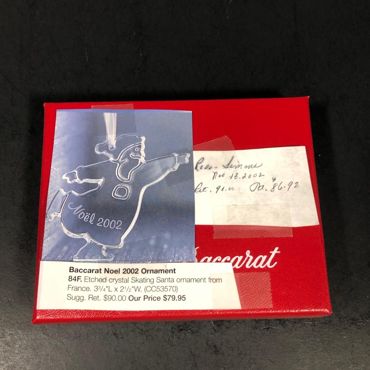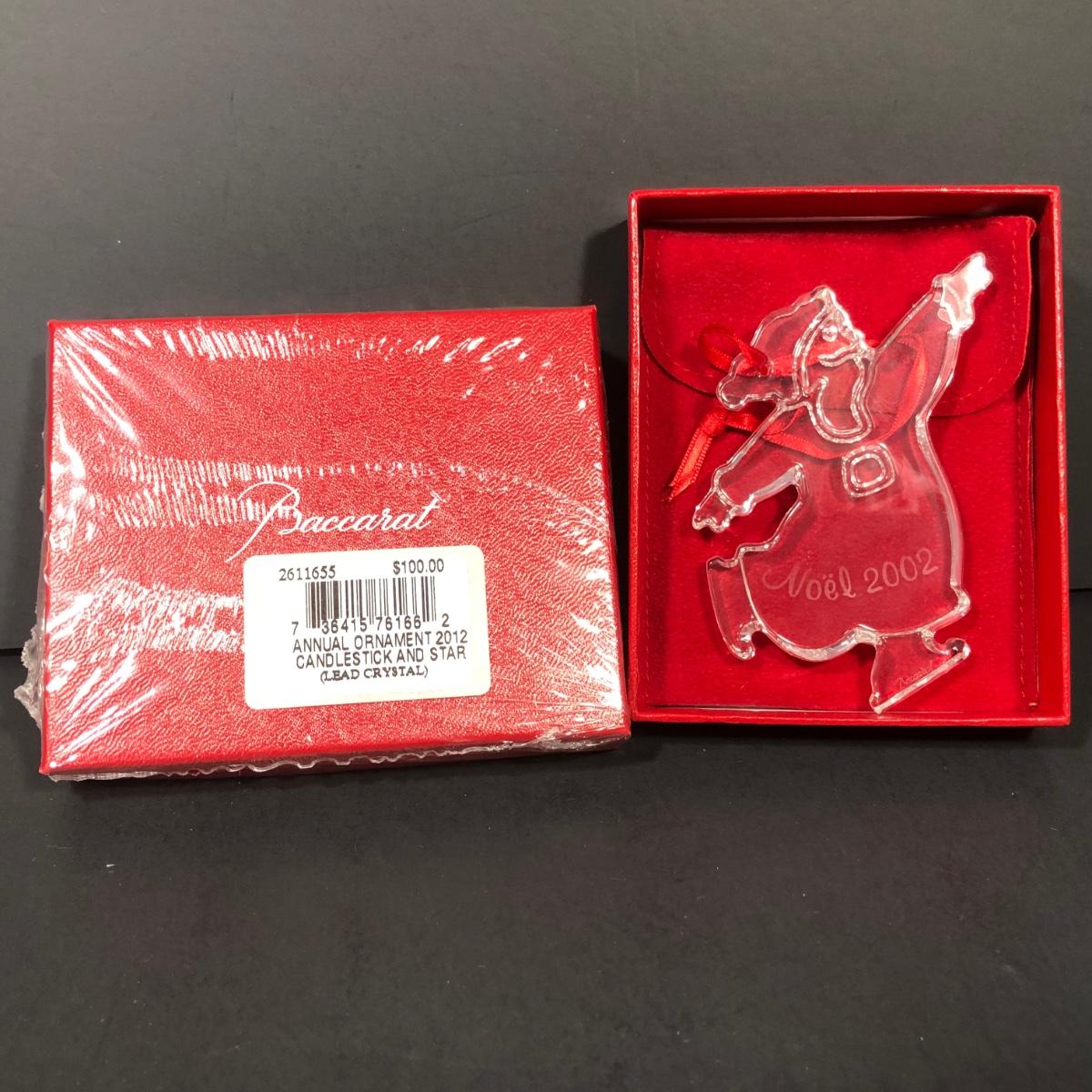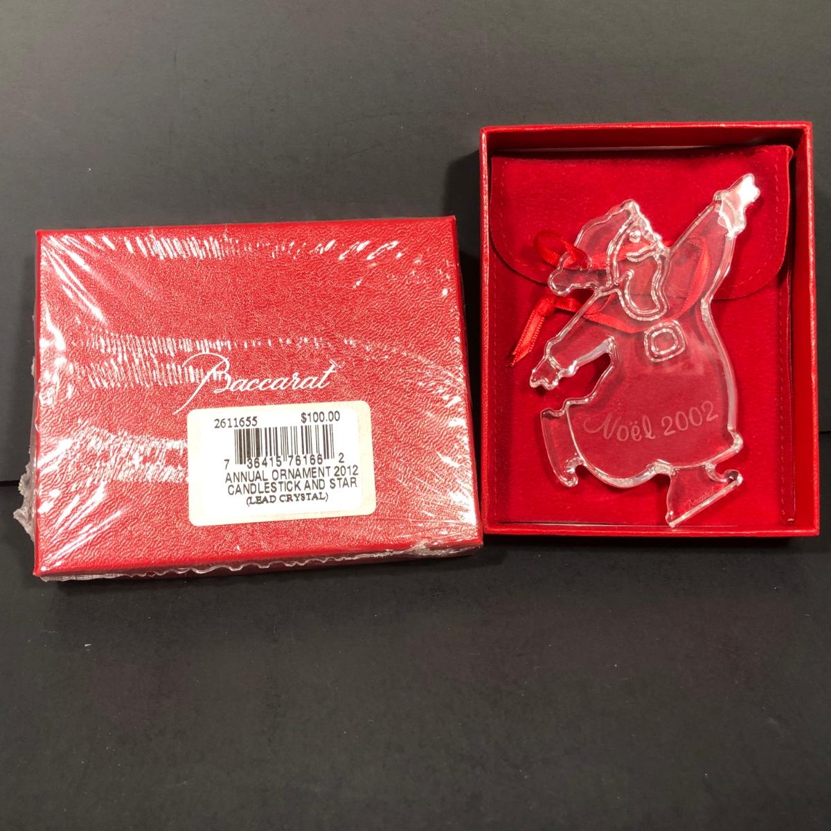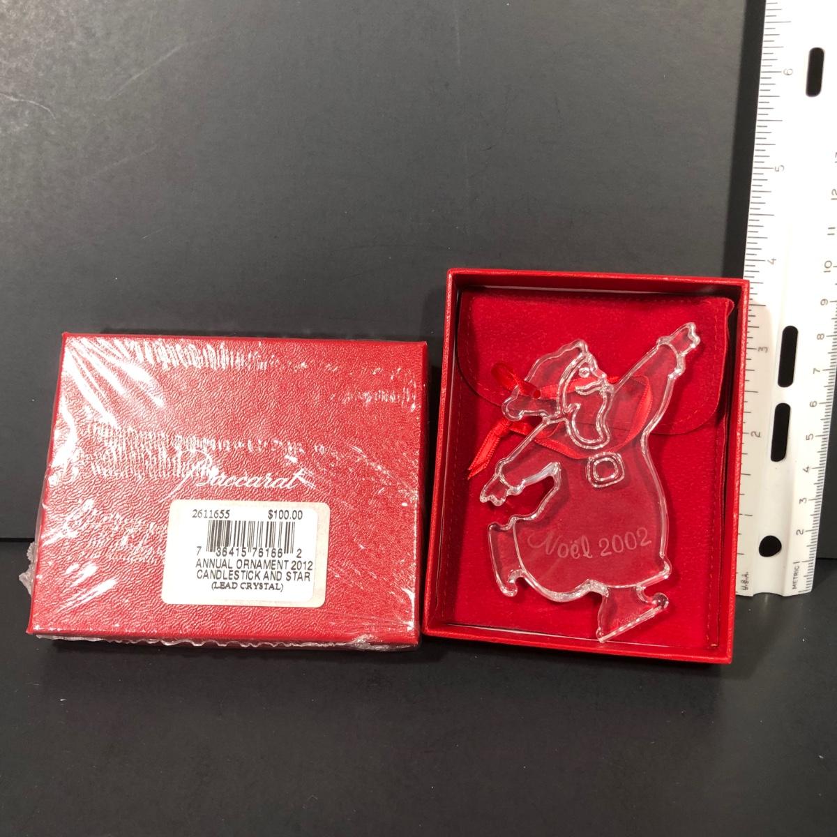 Includes 2 boxed Baccarat crystal ornaments. 2012 Annual Ornament Candlestick & Star is packaged and unopened. 2002 Noel Ornament is an etched crystal skating Santa ornament made in France.