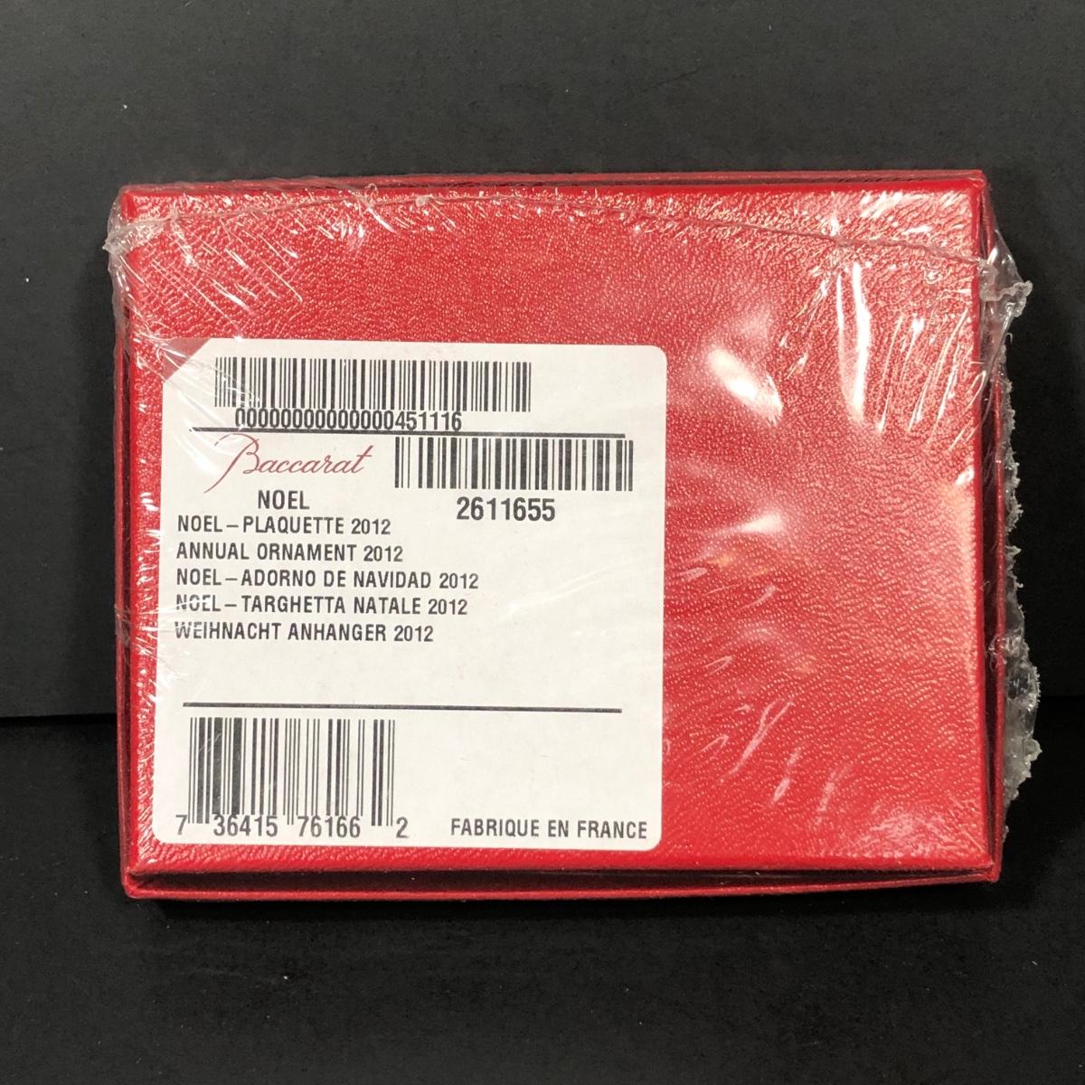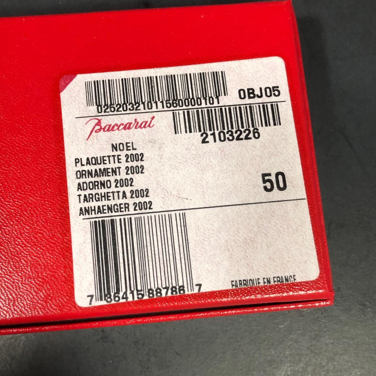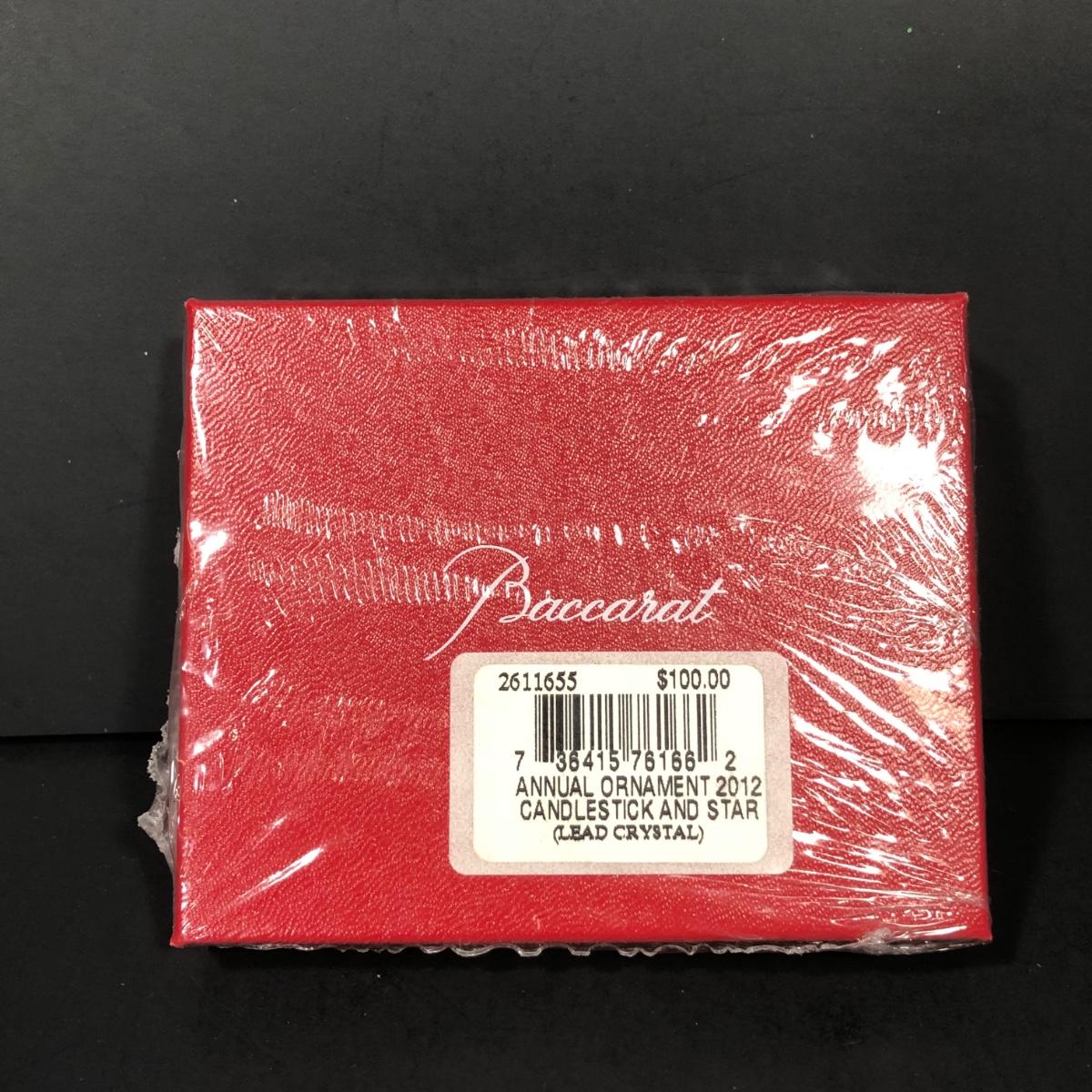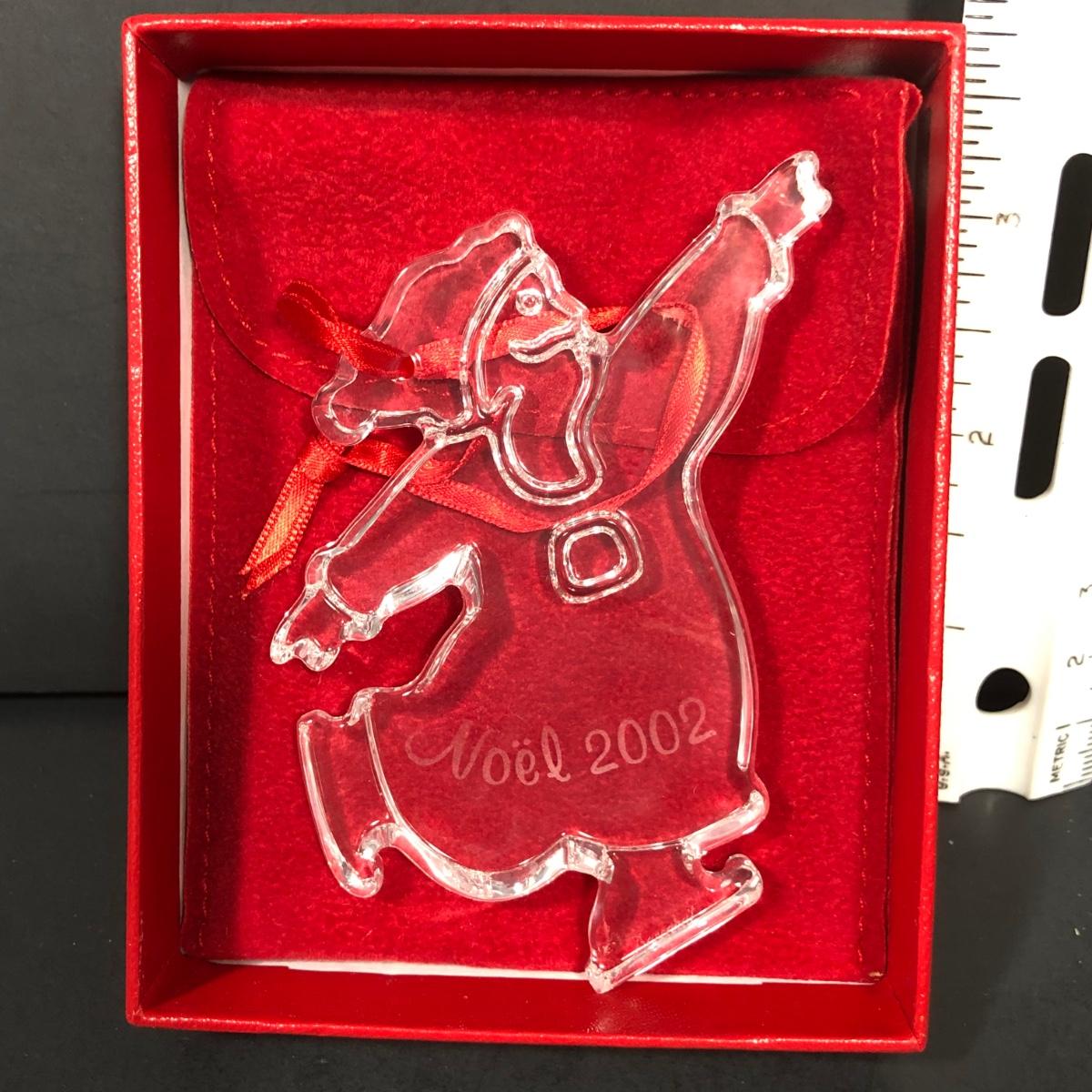 Includes 2 boxed Baccarat crystal ornaments. 2012 Annual Ornament Candlestick & Star is packaged and unopened. 2002 Noel Ornament is an etched crystal skating Santa ornament made in France.