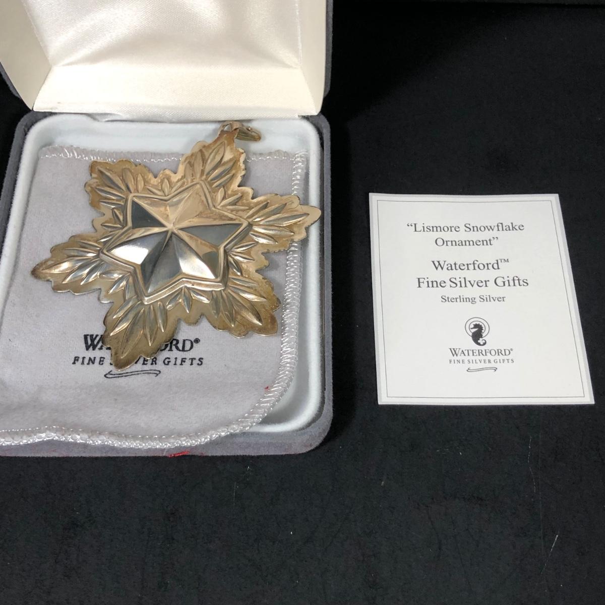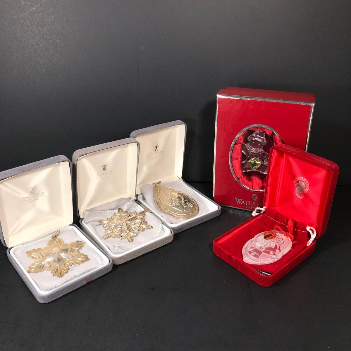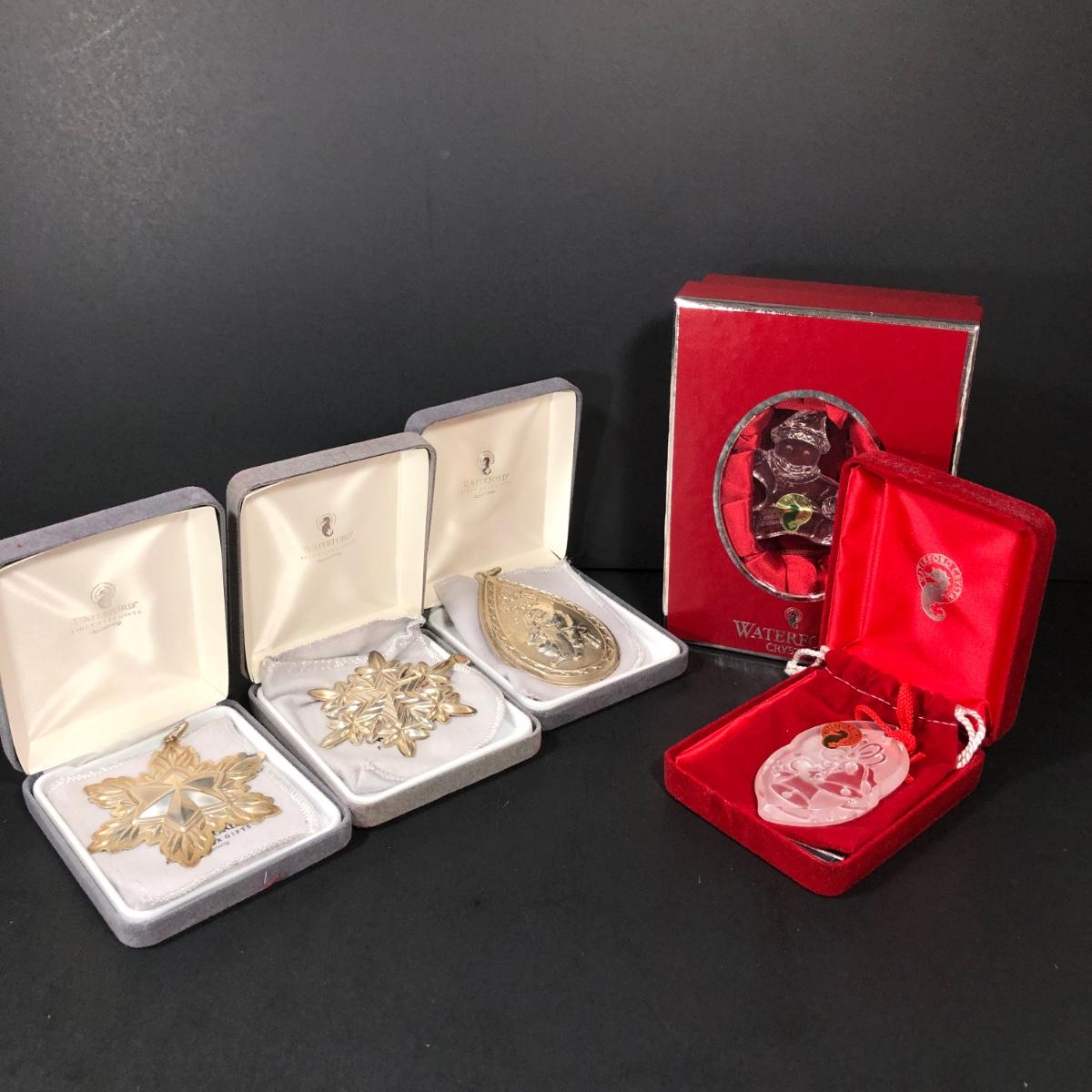 Includes 3 sterling silver ornaments and 2 crystal ornaments made by Waterford.