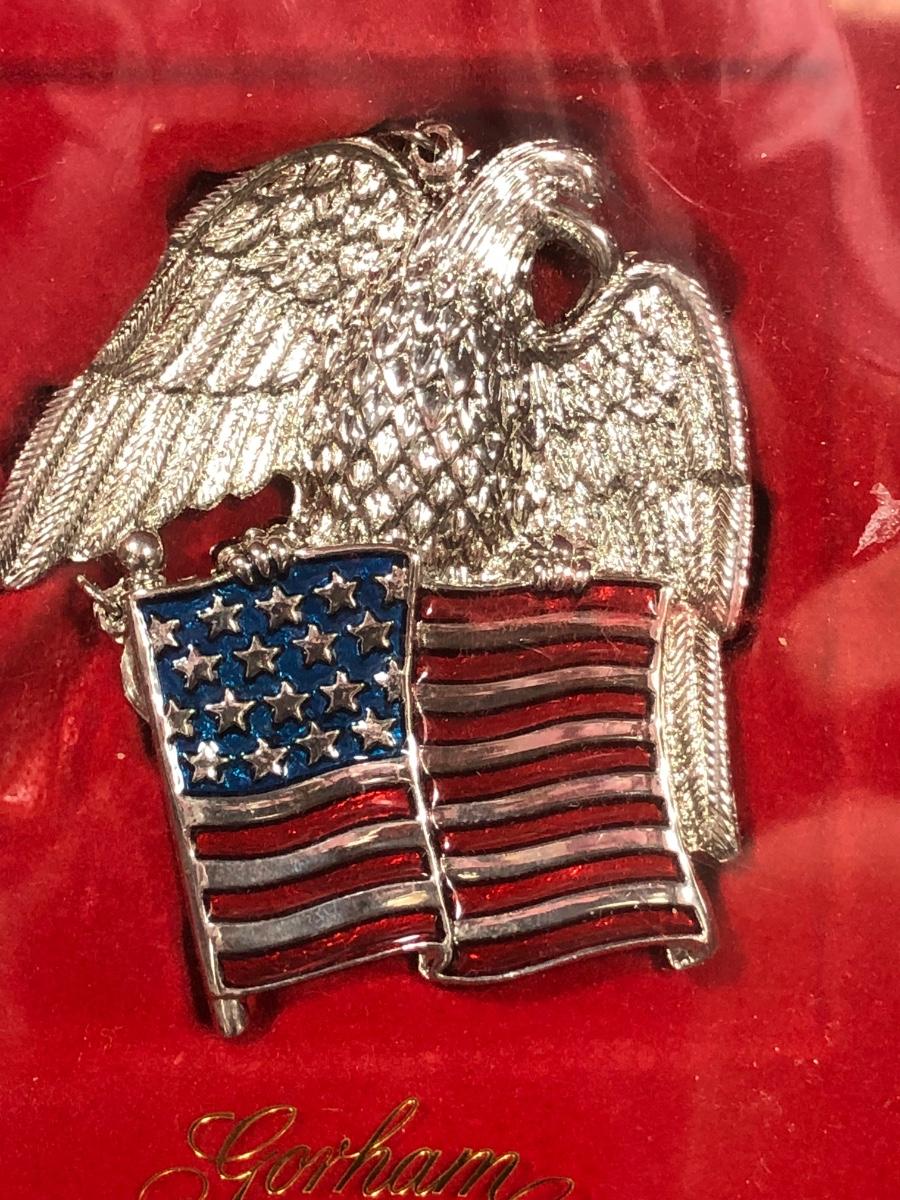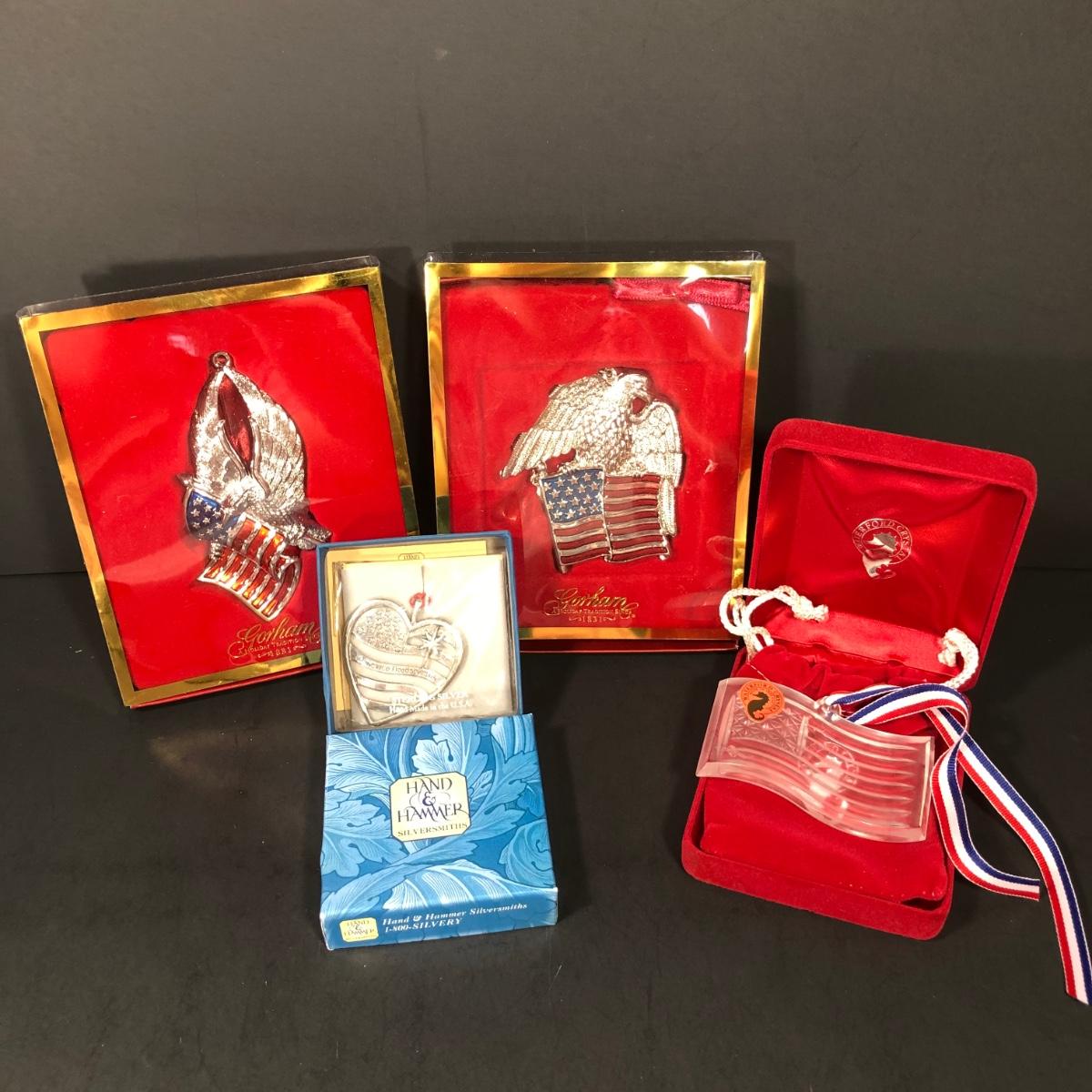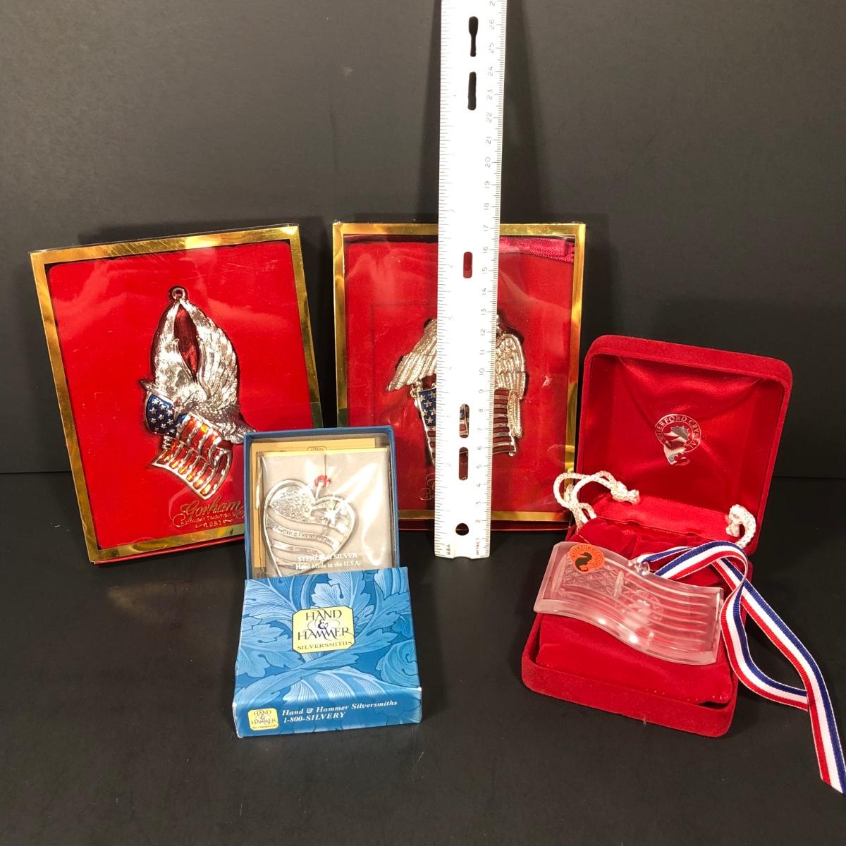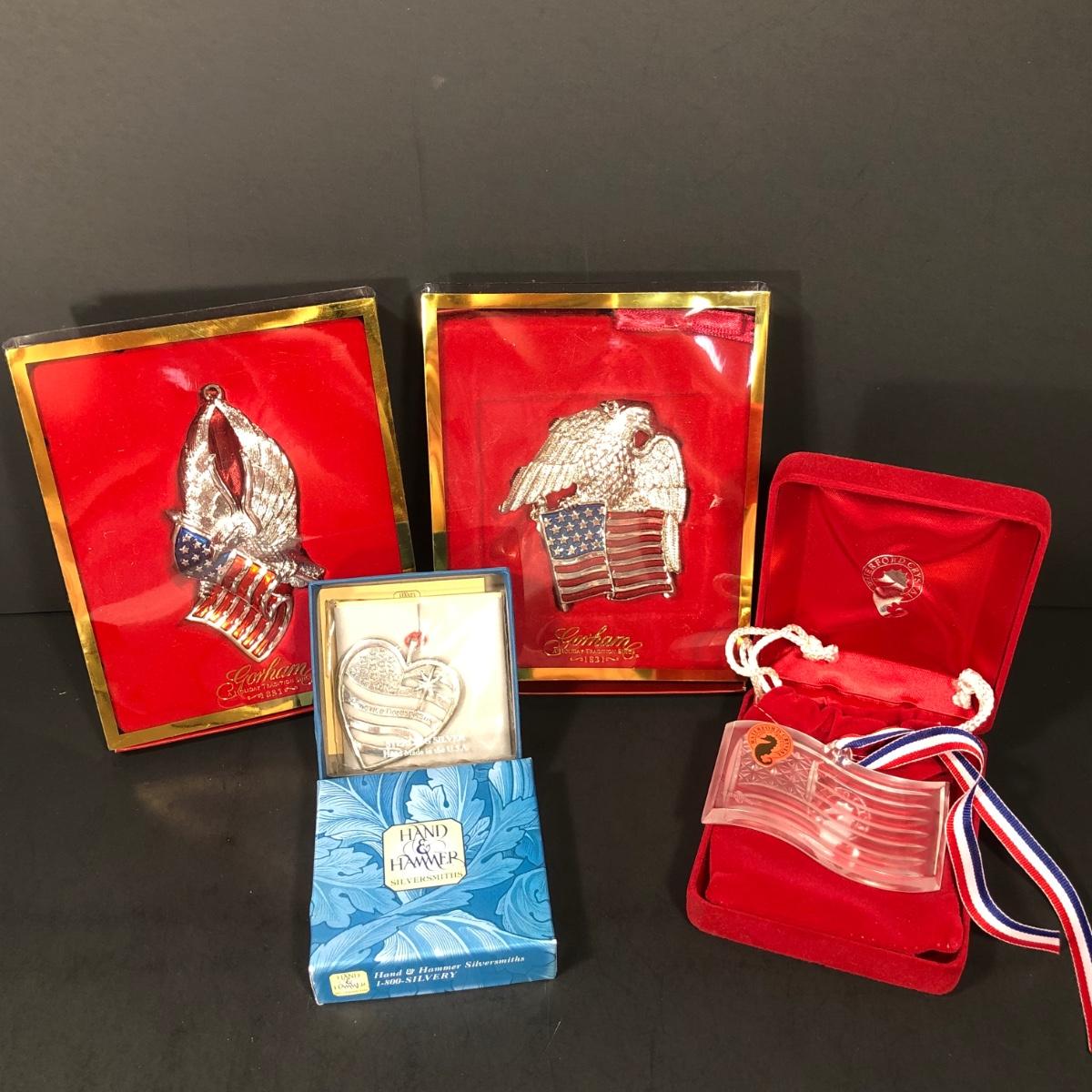 A collection of patriotic ornaments including two sterling silver eagles by Gorham, a sterling heart American flag ornament by Hand & Hammer, and a Waterford Crystal flag with a red, white, & blue ribbon.
