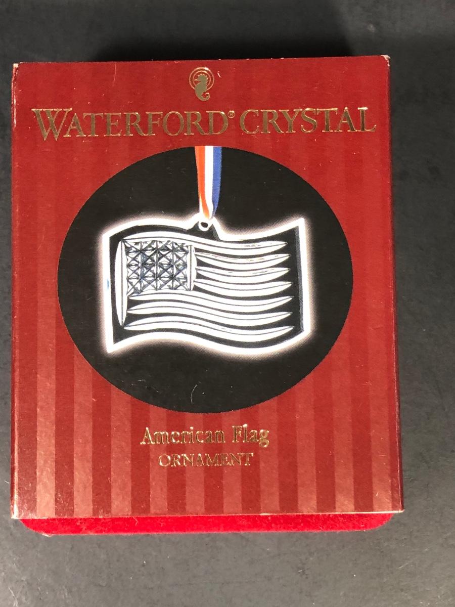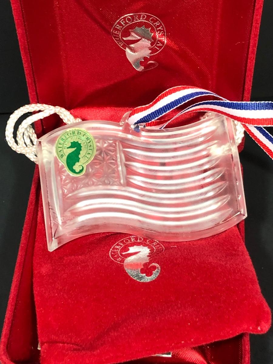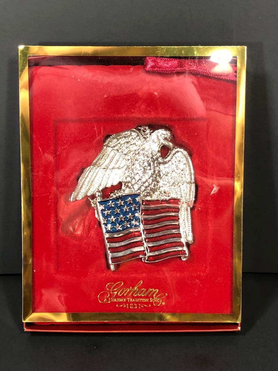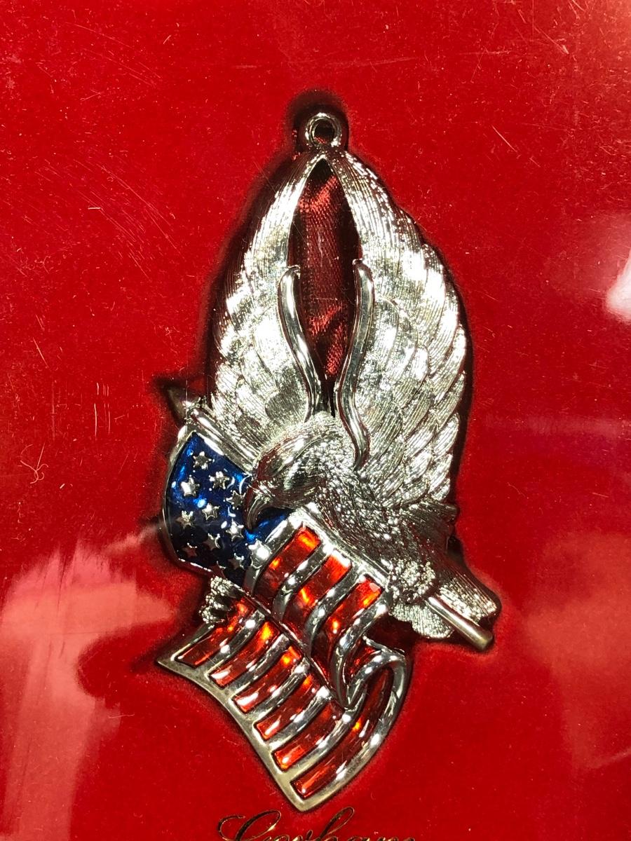 A collection of patriotic ornaments including two sterling silver eagles by Gorham, a sterling heart American flag ornament by Hand & Hammer, and a Waterford Crystal flag with a red, white, & blue ribbon.
