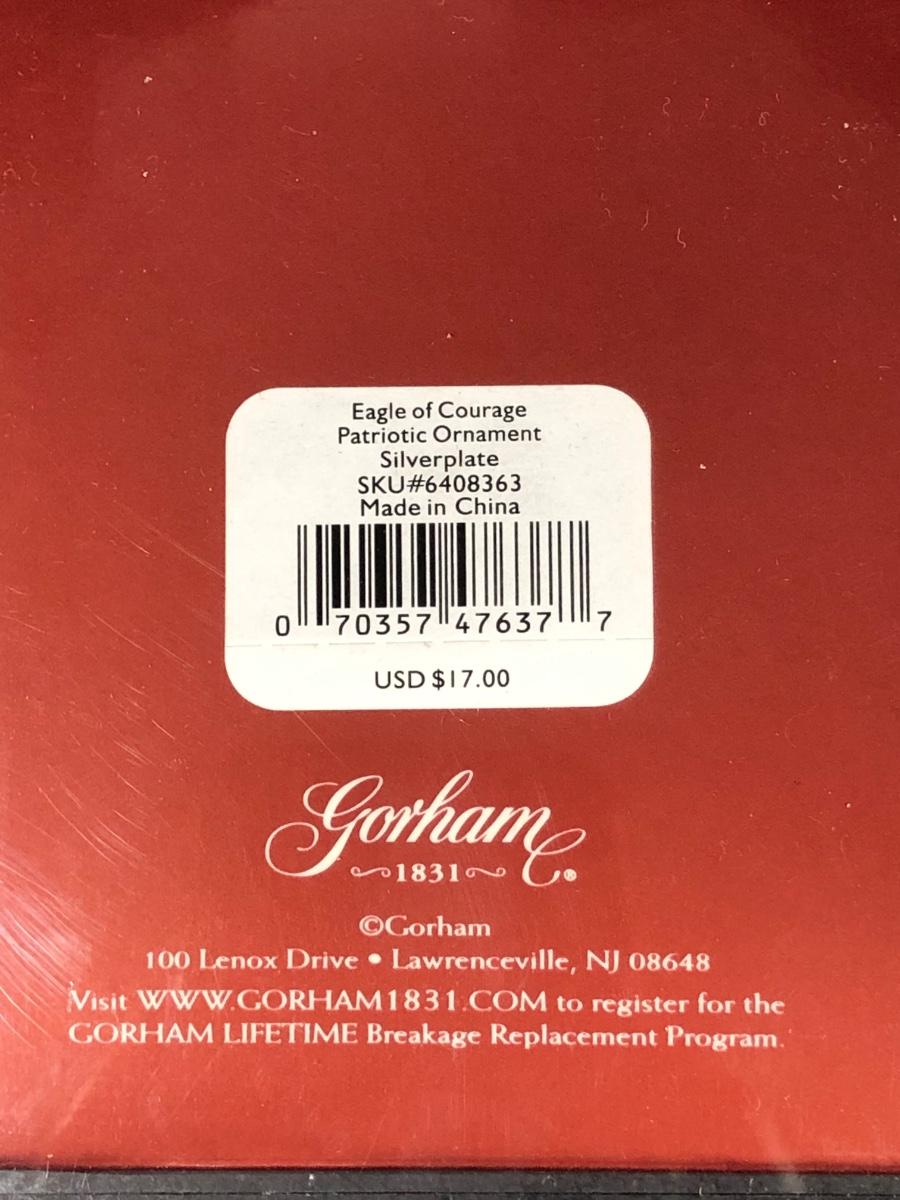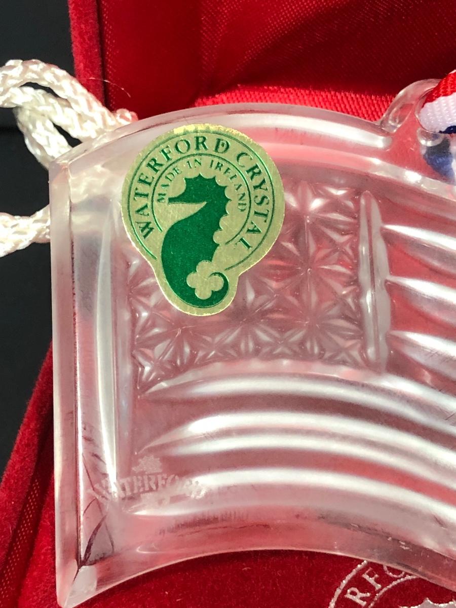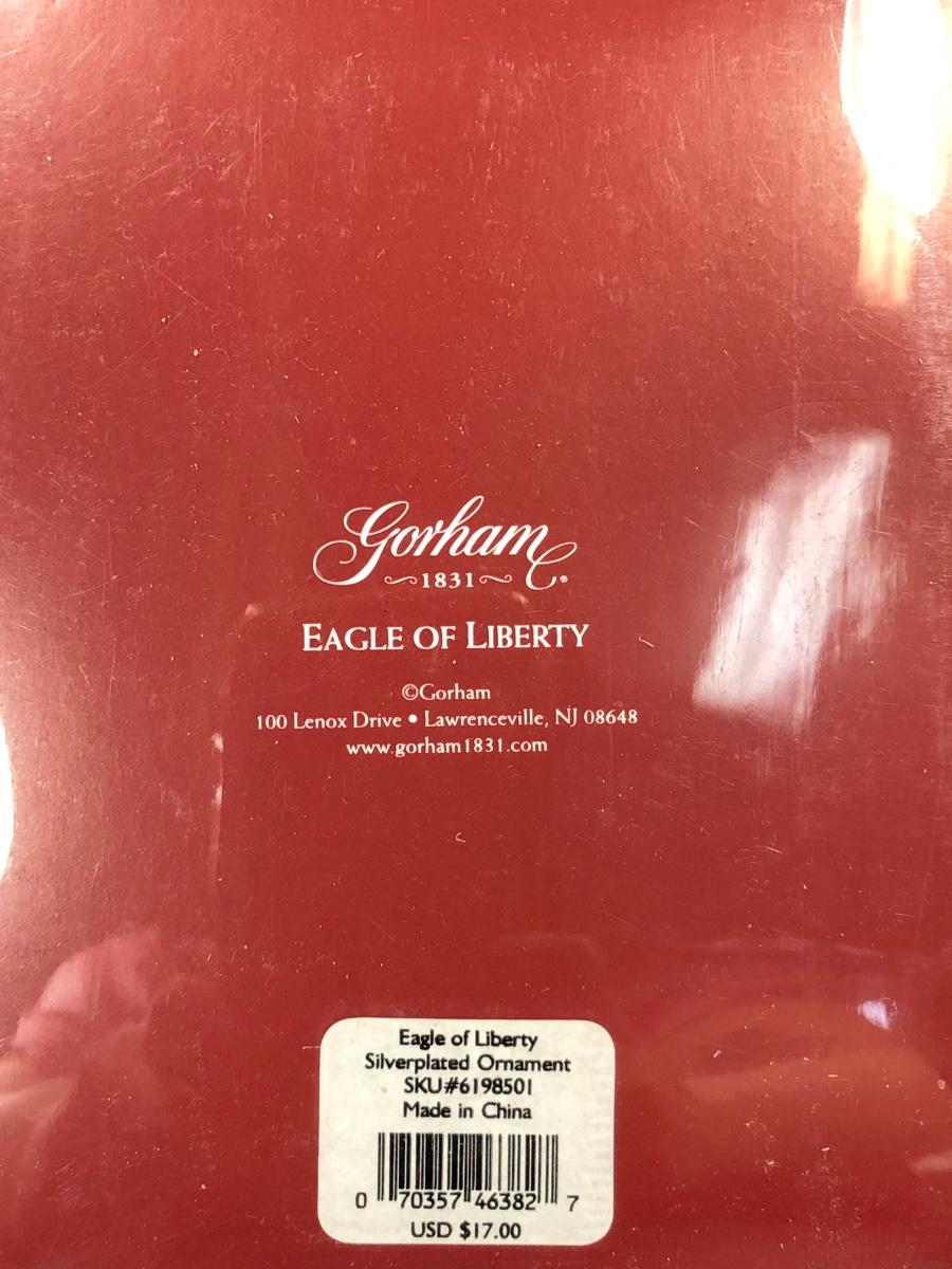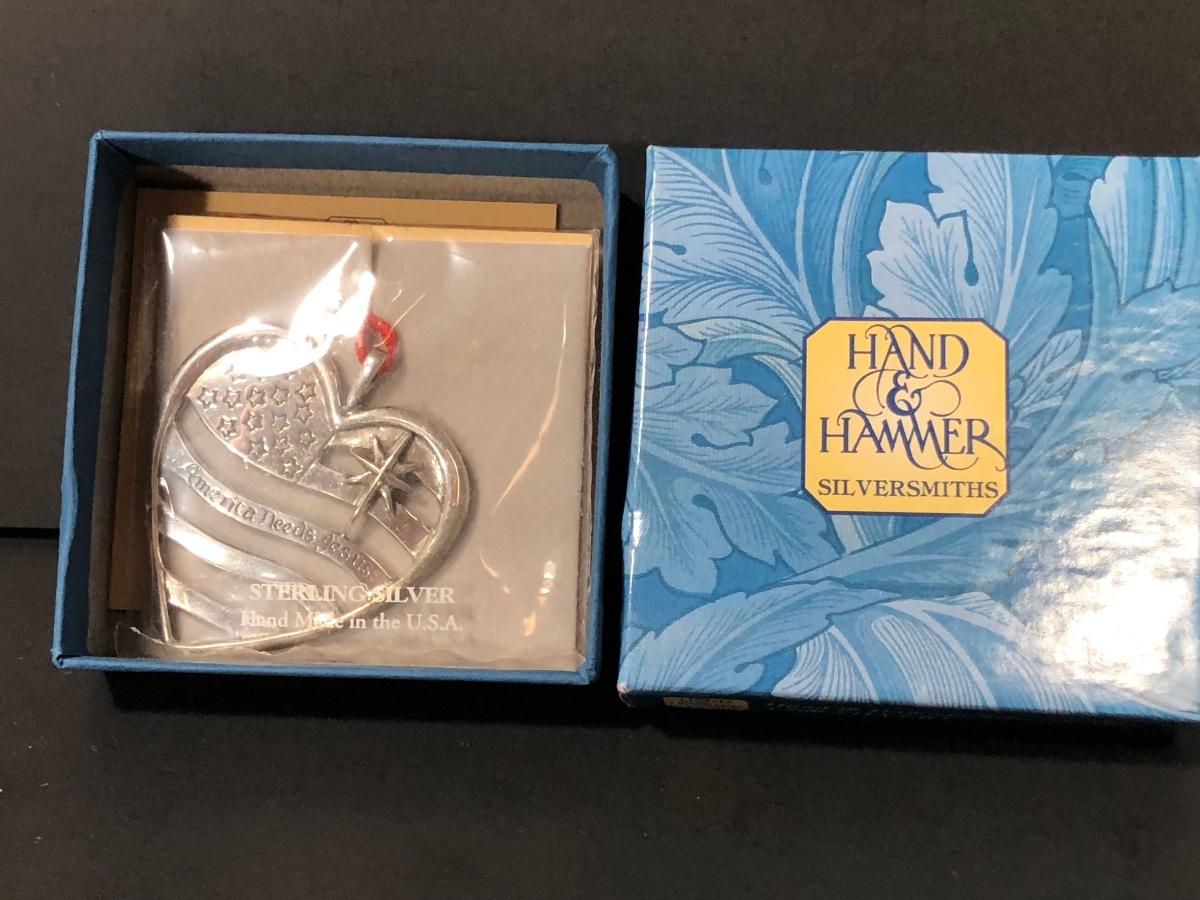 A collection of patriotic ornaments including two sterling silver eagles by Gorham, a sterling heart American flag ornament by Hand & Hammer, and a Waterford Crystal flag with a red, white, & blue ribbon.