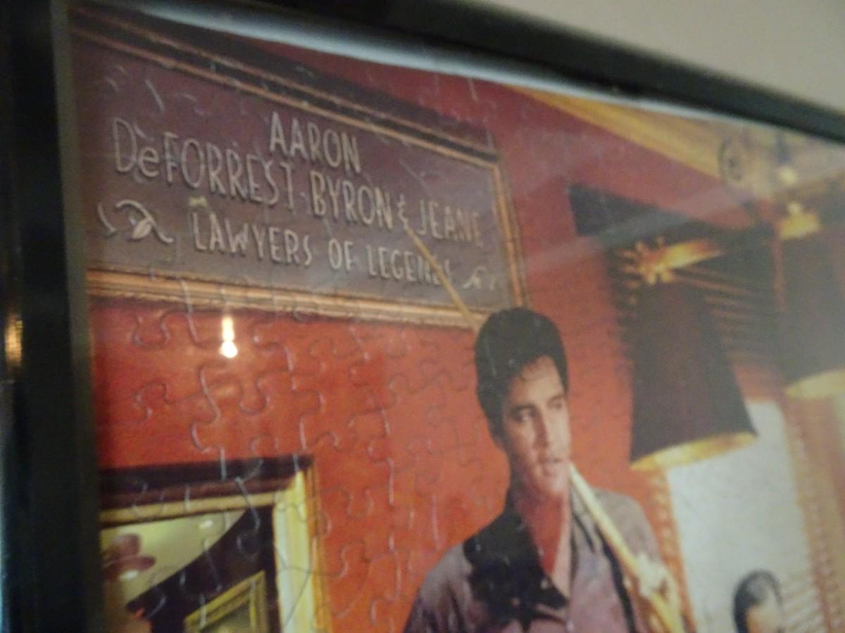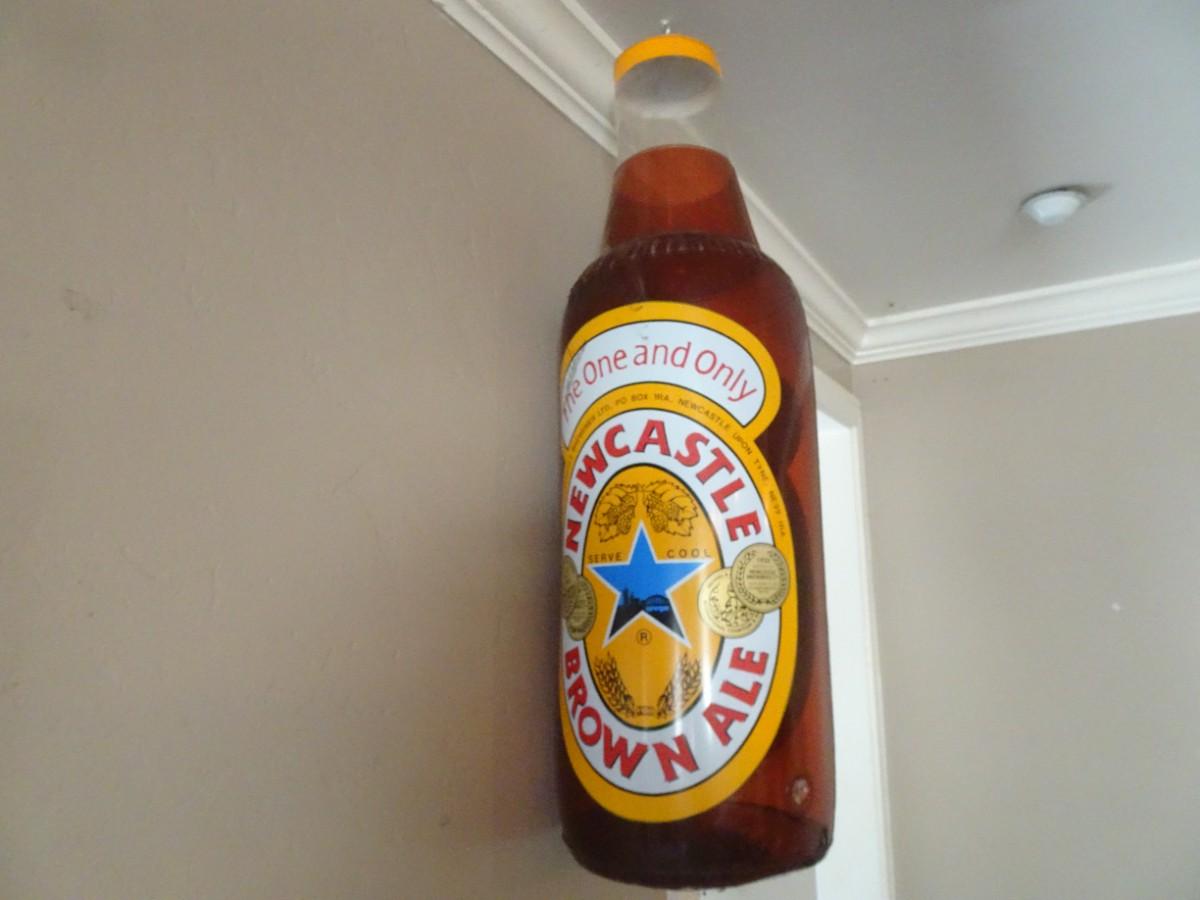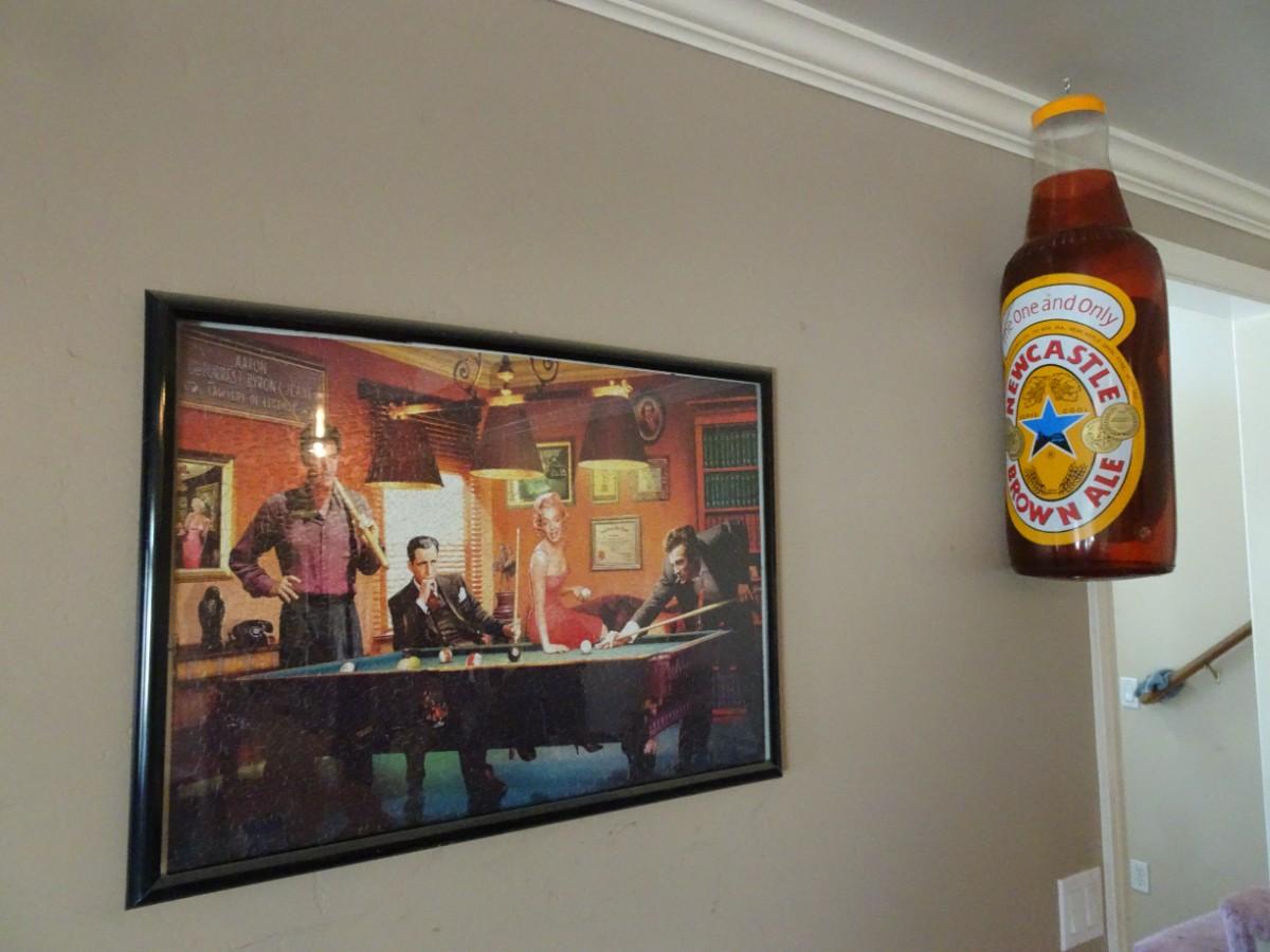 LOT 834. FRAMED PUZZLE AND BLOW UP BEER BOTTLE DECOR