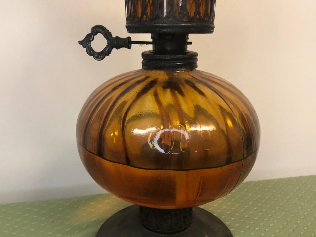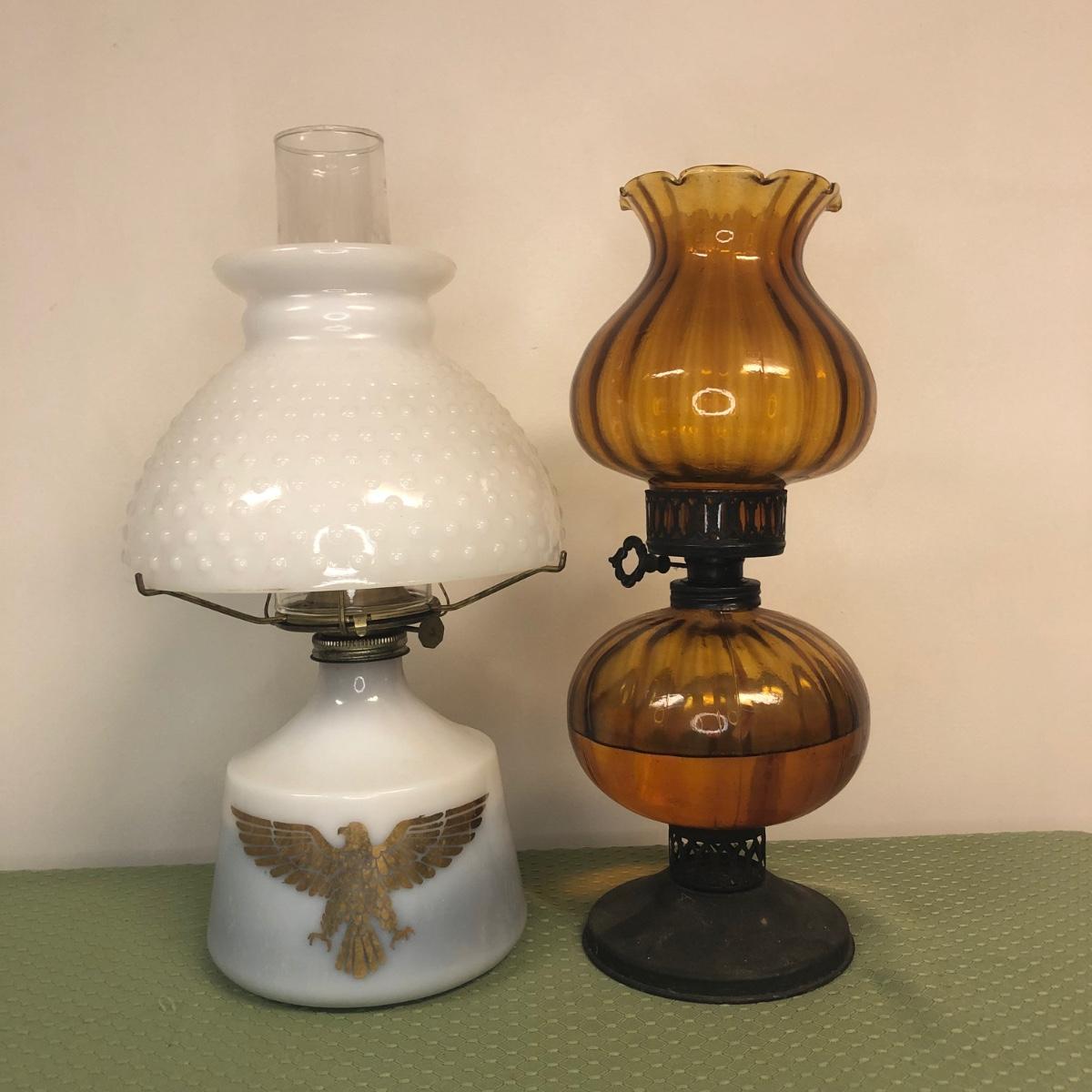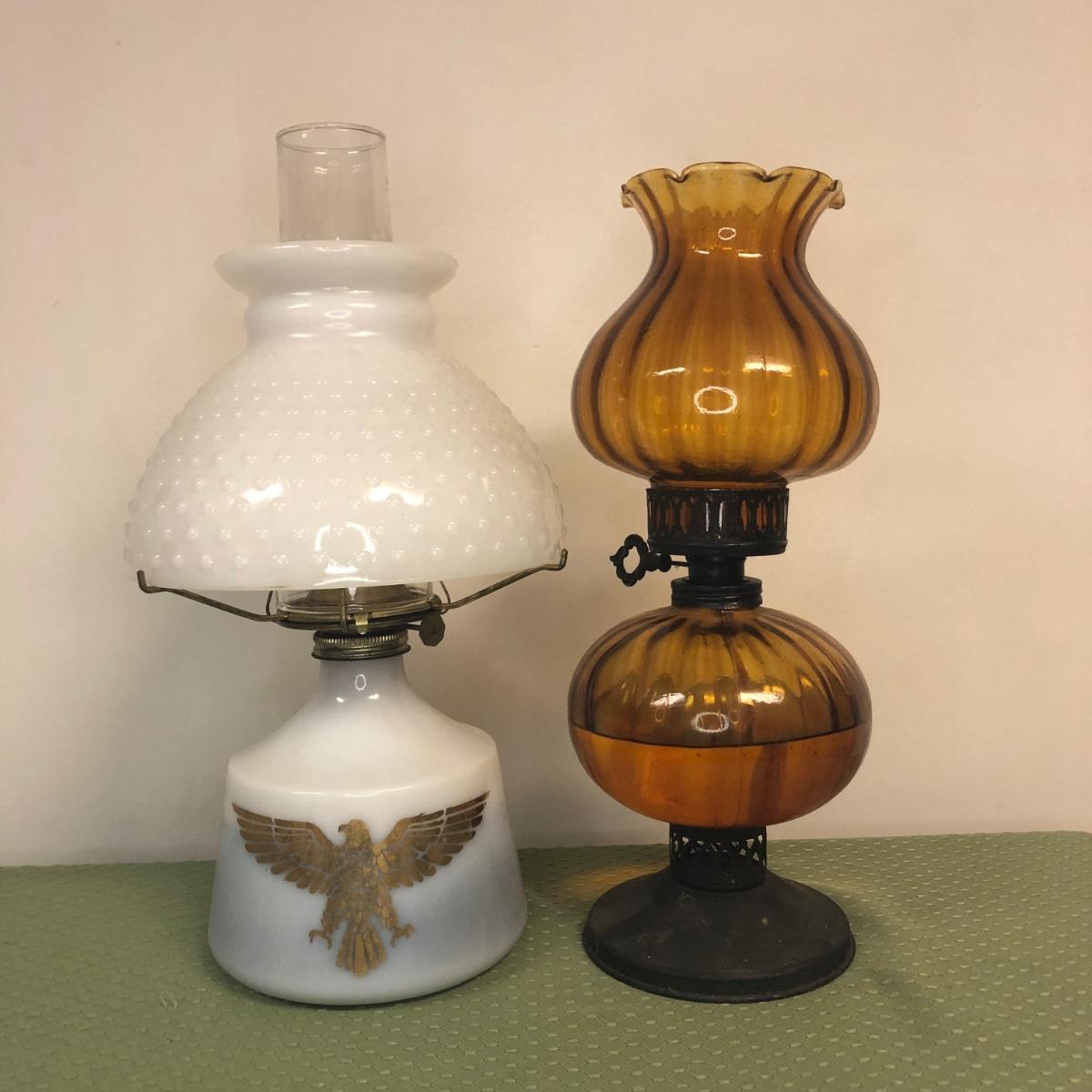 Two hurricane style oil lamps. Note - both lamps still have liquid in them.