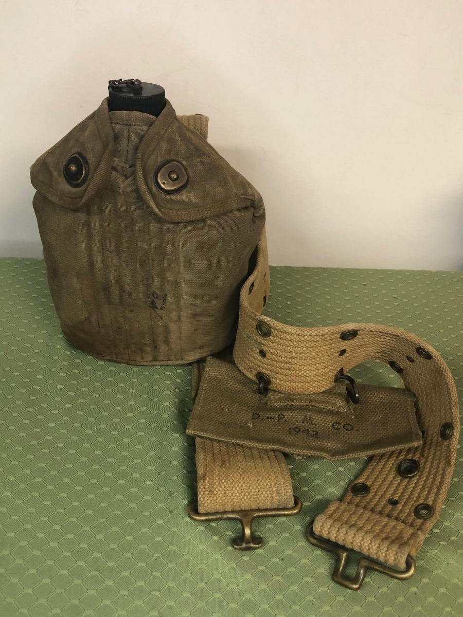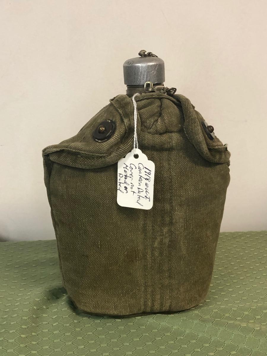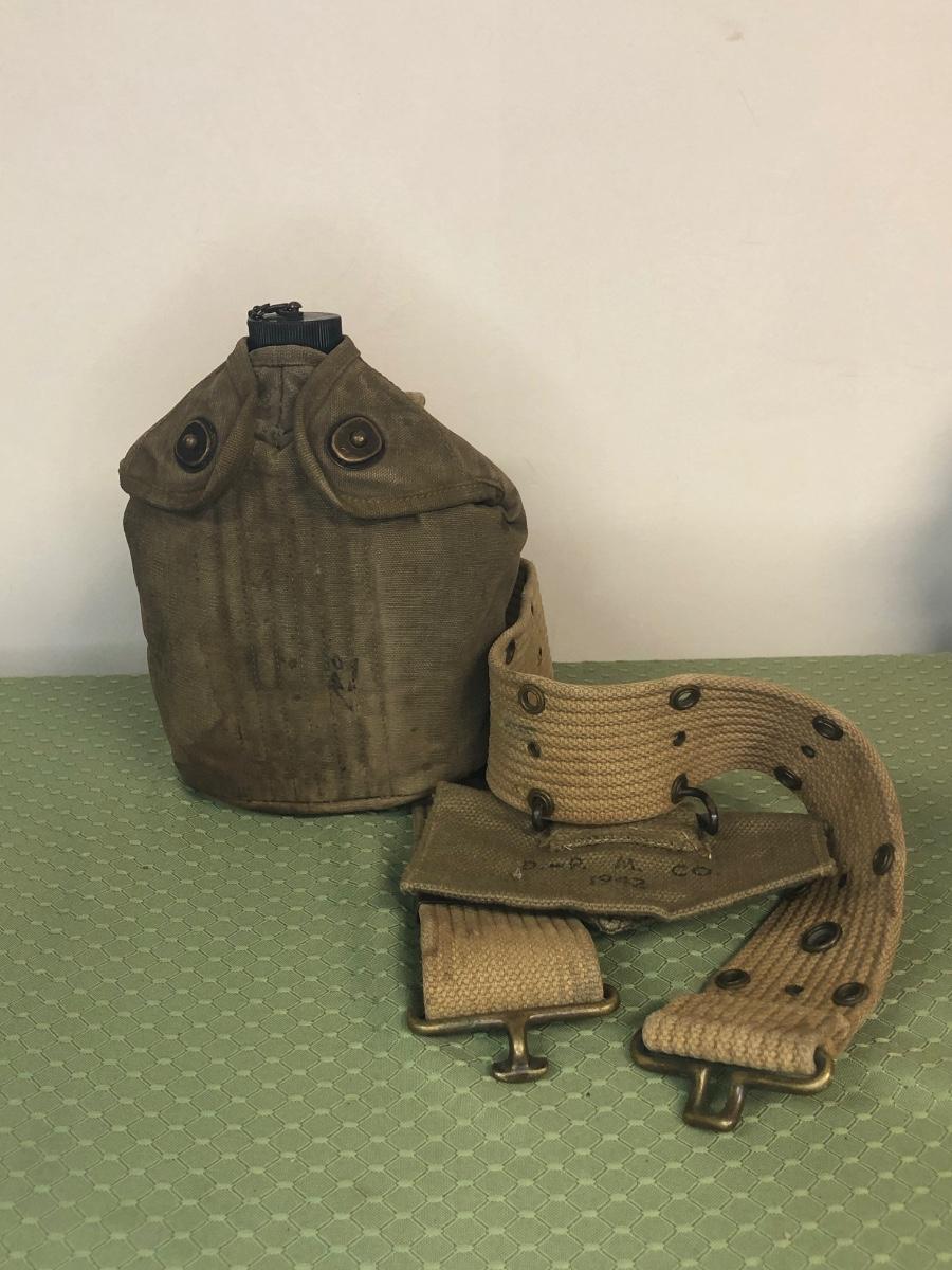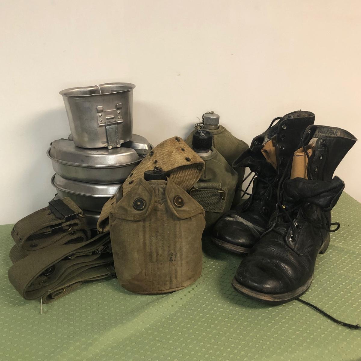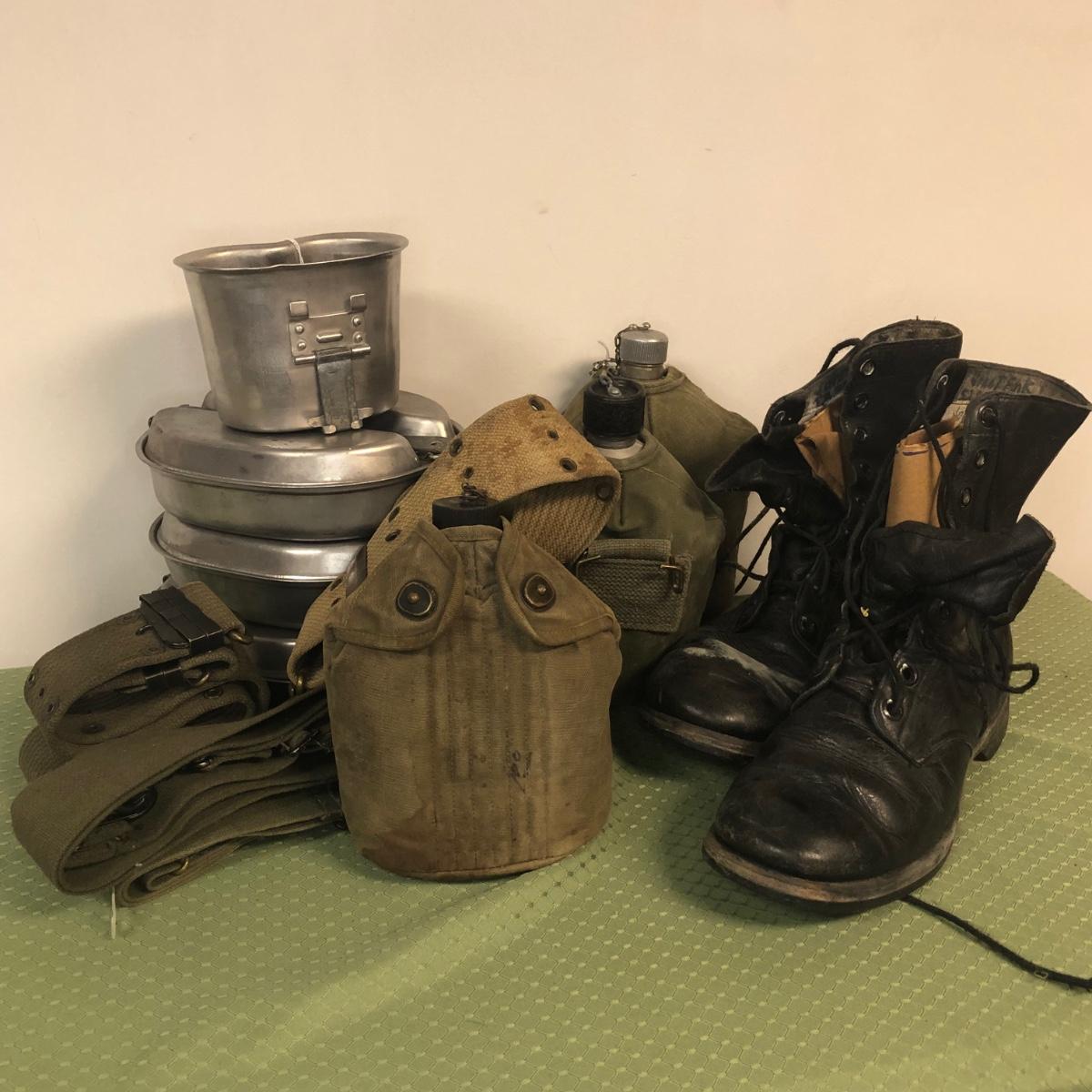 Includes three canteens (one dated 1918), a canteen cup (dated 1945), and three mess kits (dated World War II era). A pair of Biltrite boots (no size) and some military style belts.