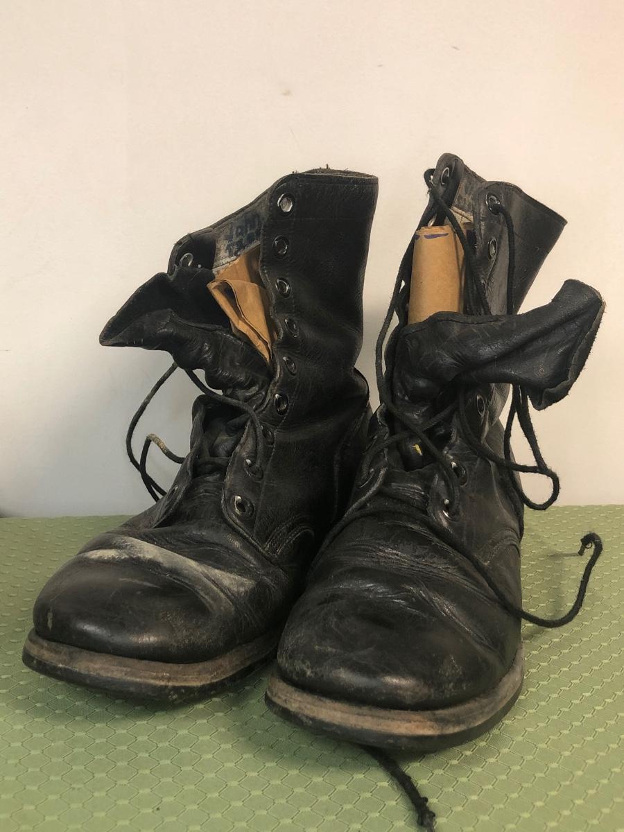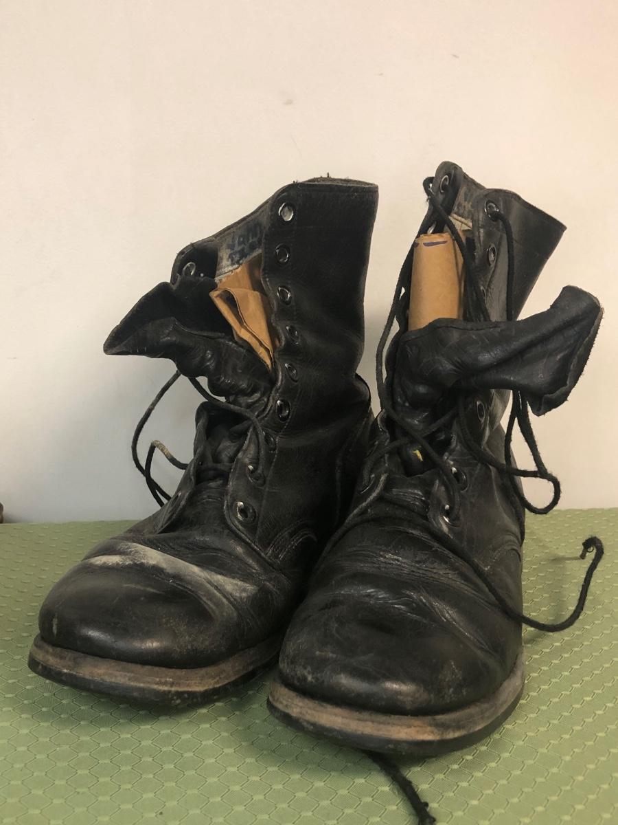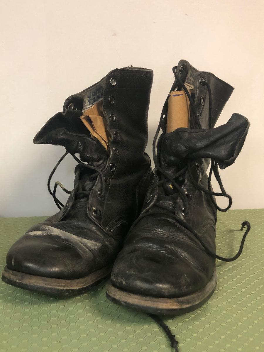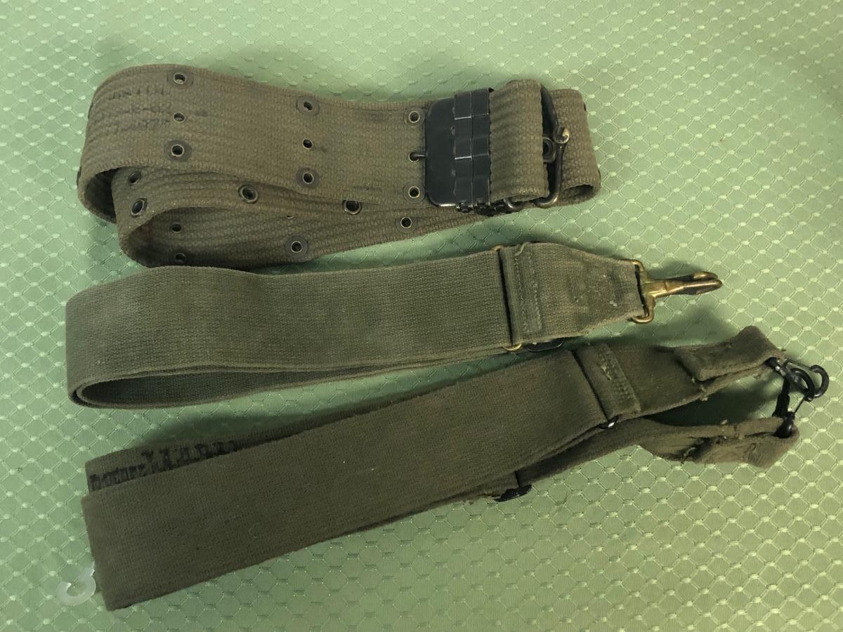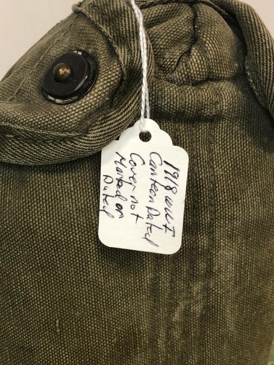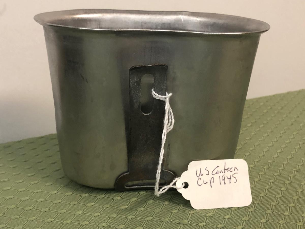 Includes three canteens (one dated 1918), a canteen cup (dated 1945), and three mess kits (dated World War II era). A pair of Biltrite boots (no size) and some military style belts.