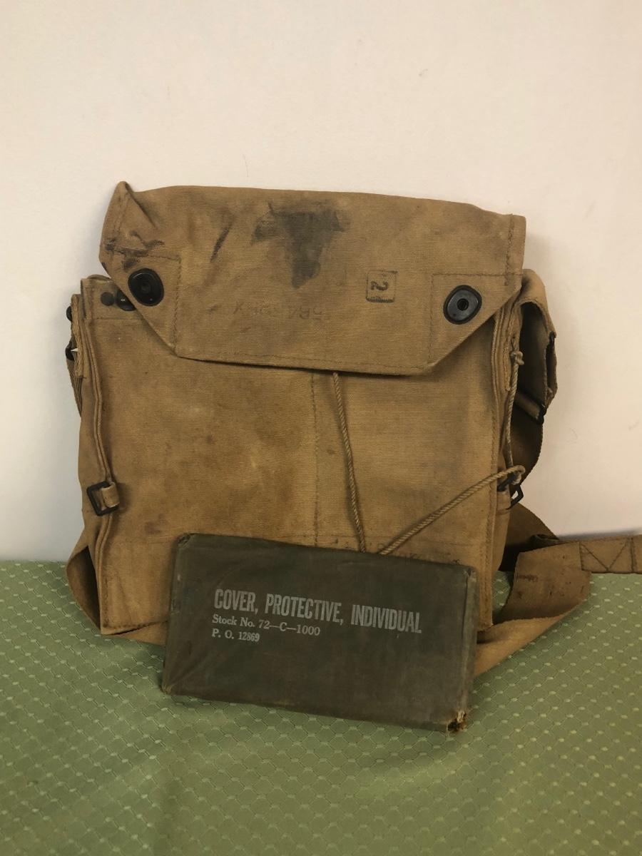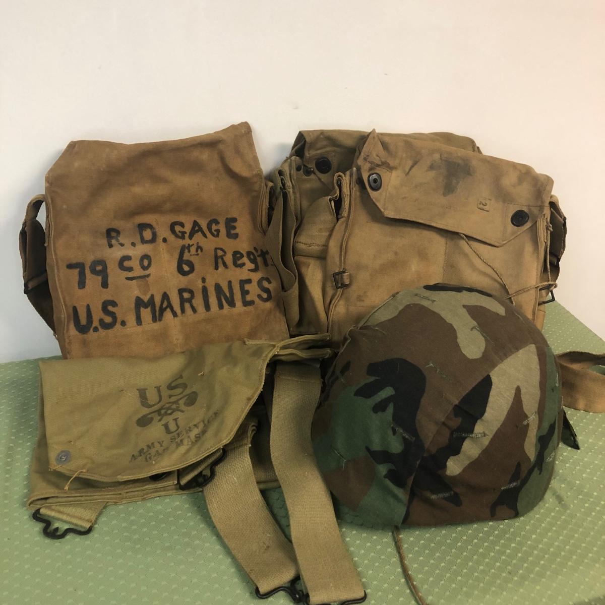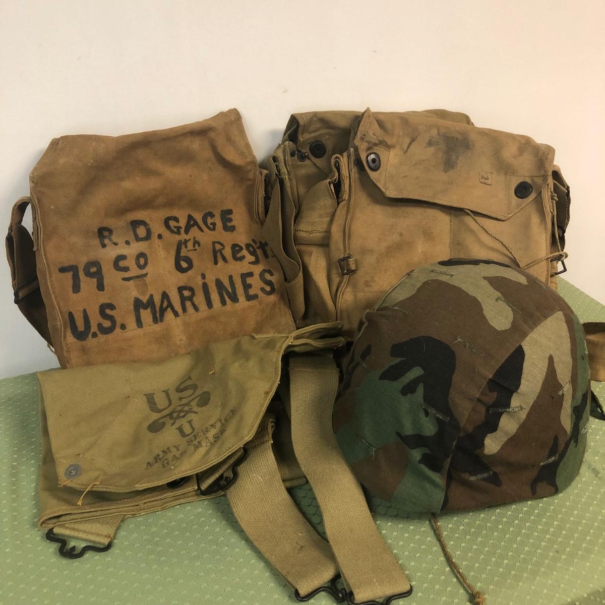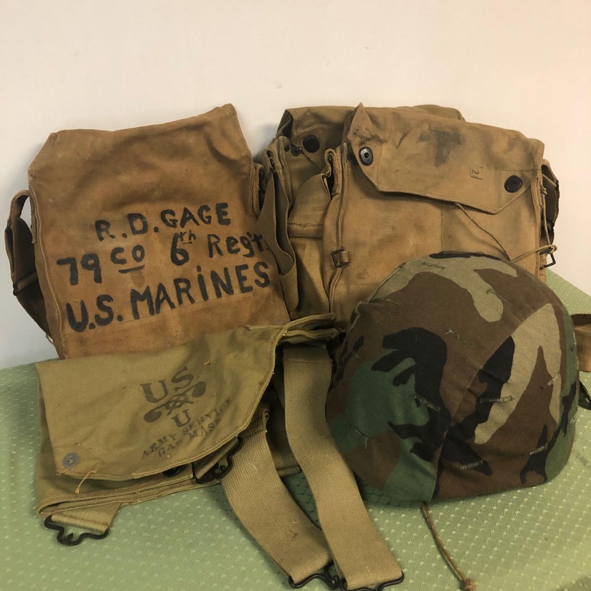 Includes a gas mask in bag from a US Marine. Also includes various military bags and a covered helmet with a liner.