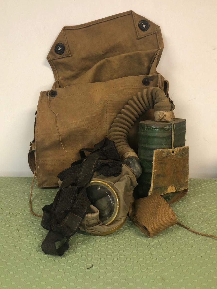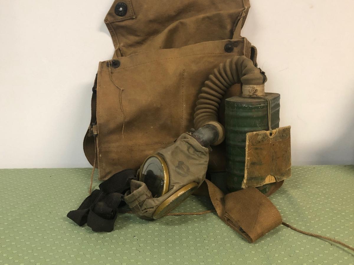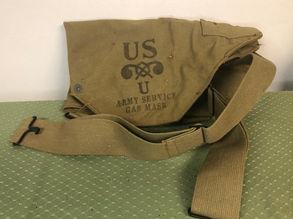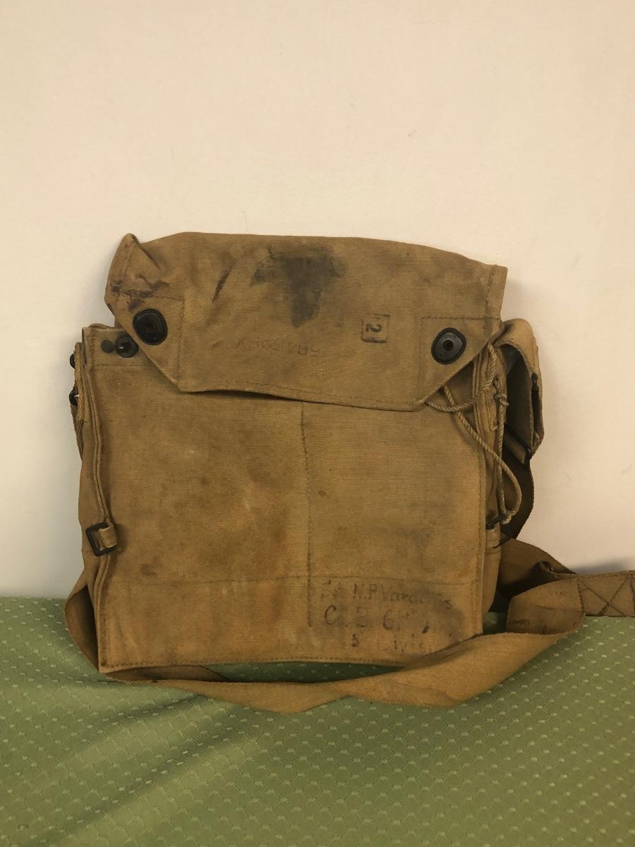 Includes a gas mask in bag from a US Marine. Also includes various military bags and a covered helmet with a liner.