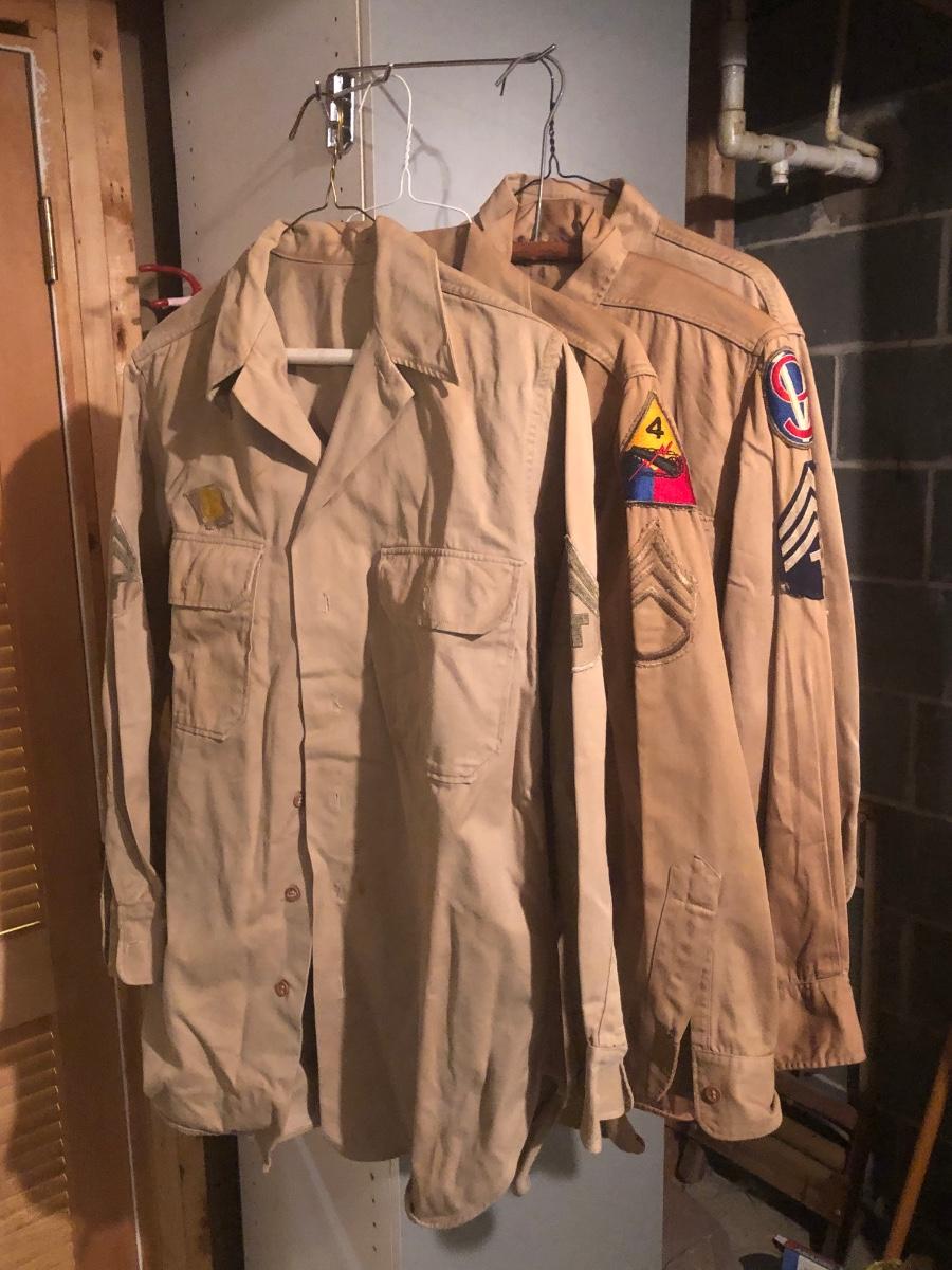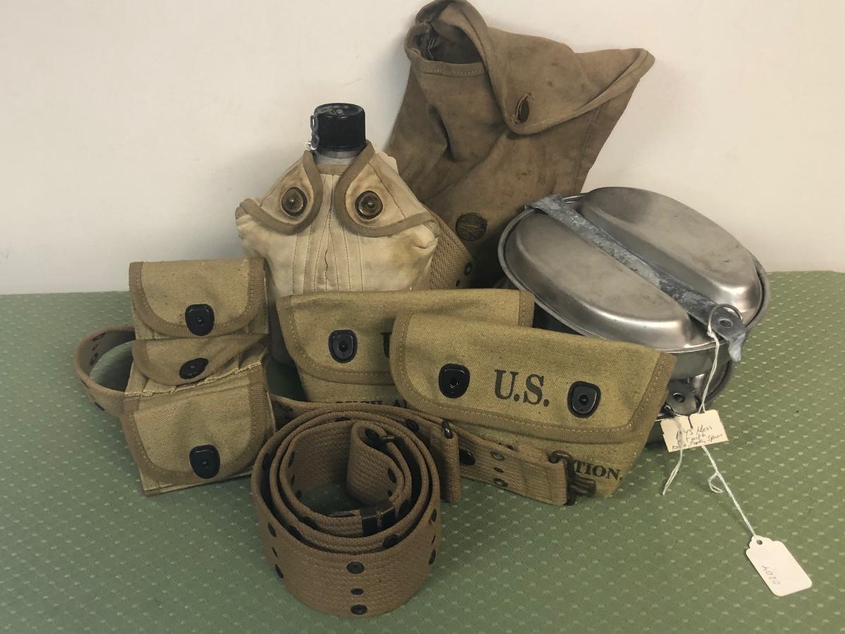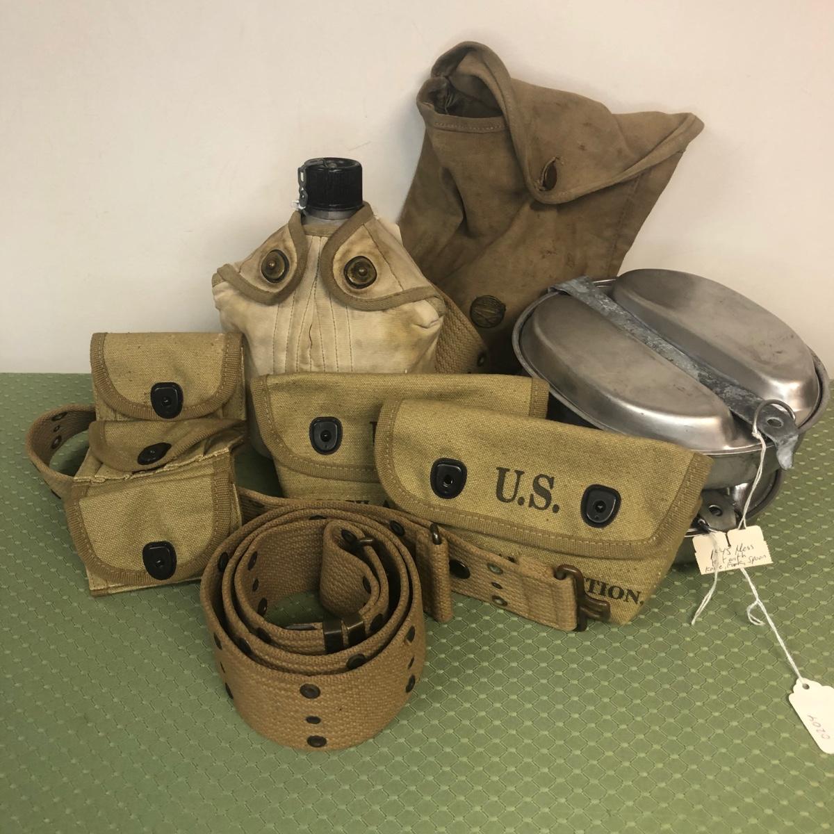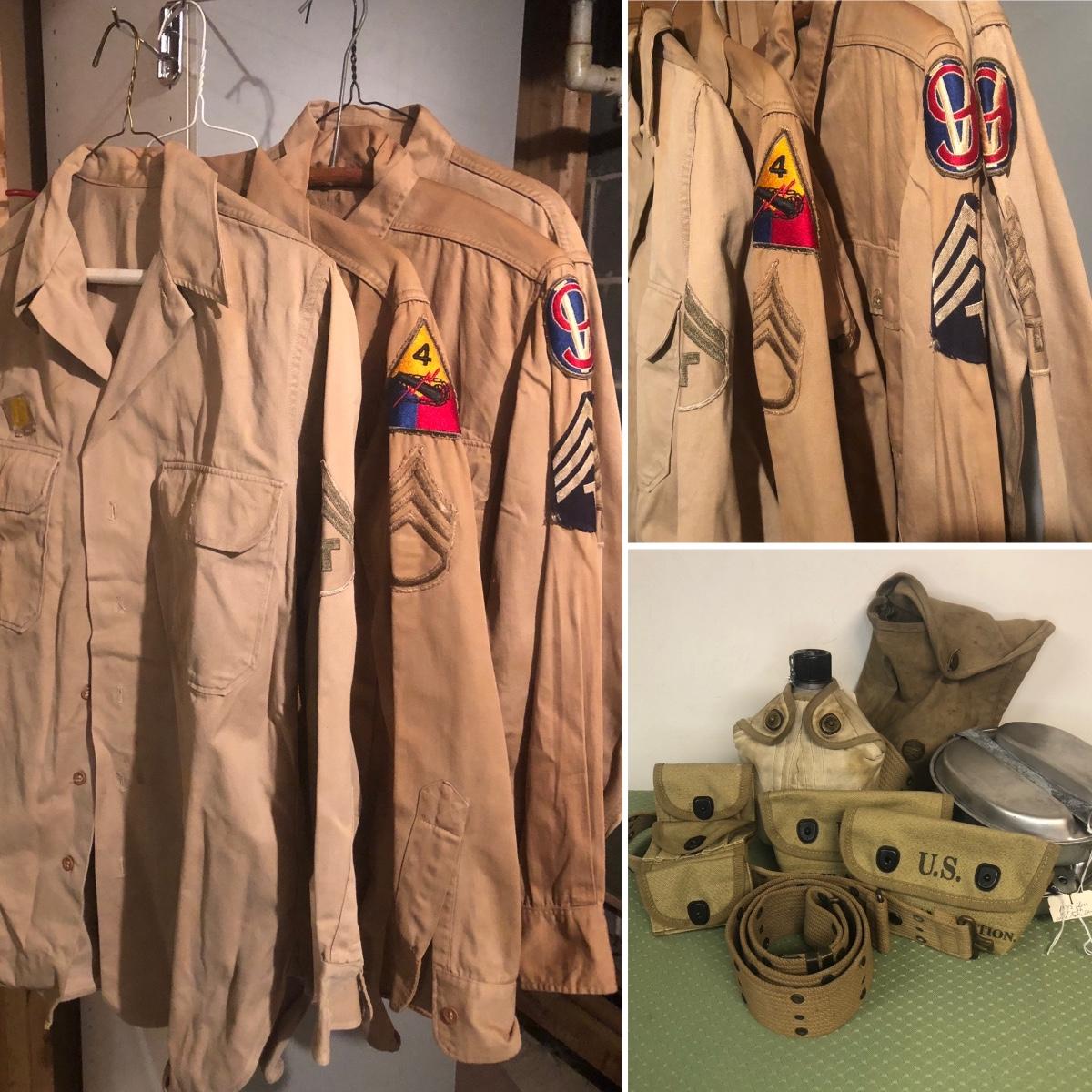 Includes four United States Army Shirts. Two have a V9 patch representing the 95th Infantry Division, and they include a technicians patch. Also included is a World War I mess kit holder with a battalion button, World War II pistol belt & empty ammunition pouches. World War II mess kits & canteen.