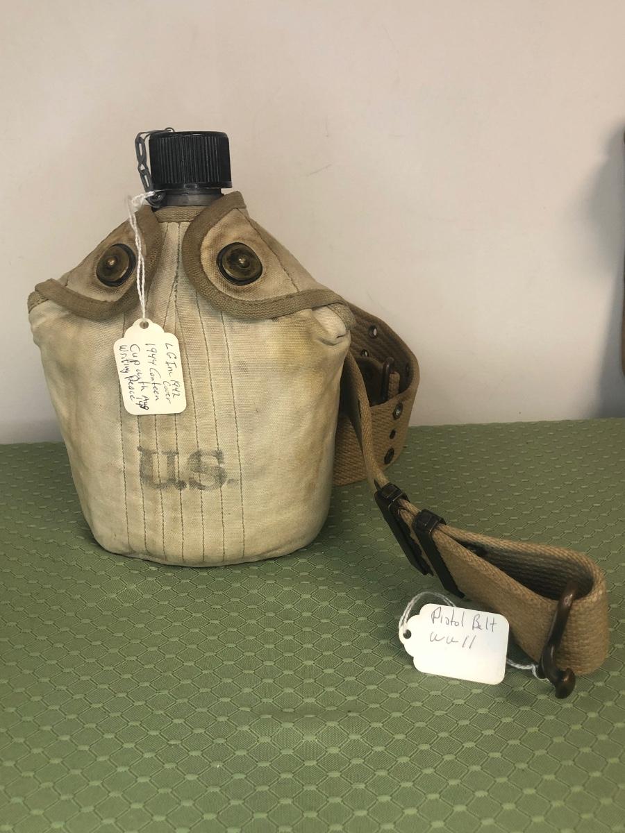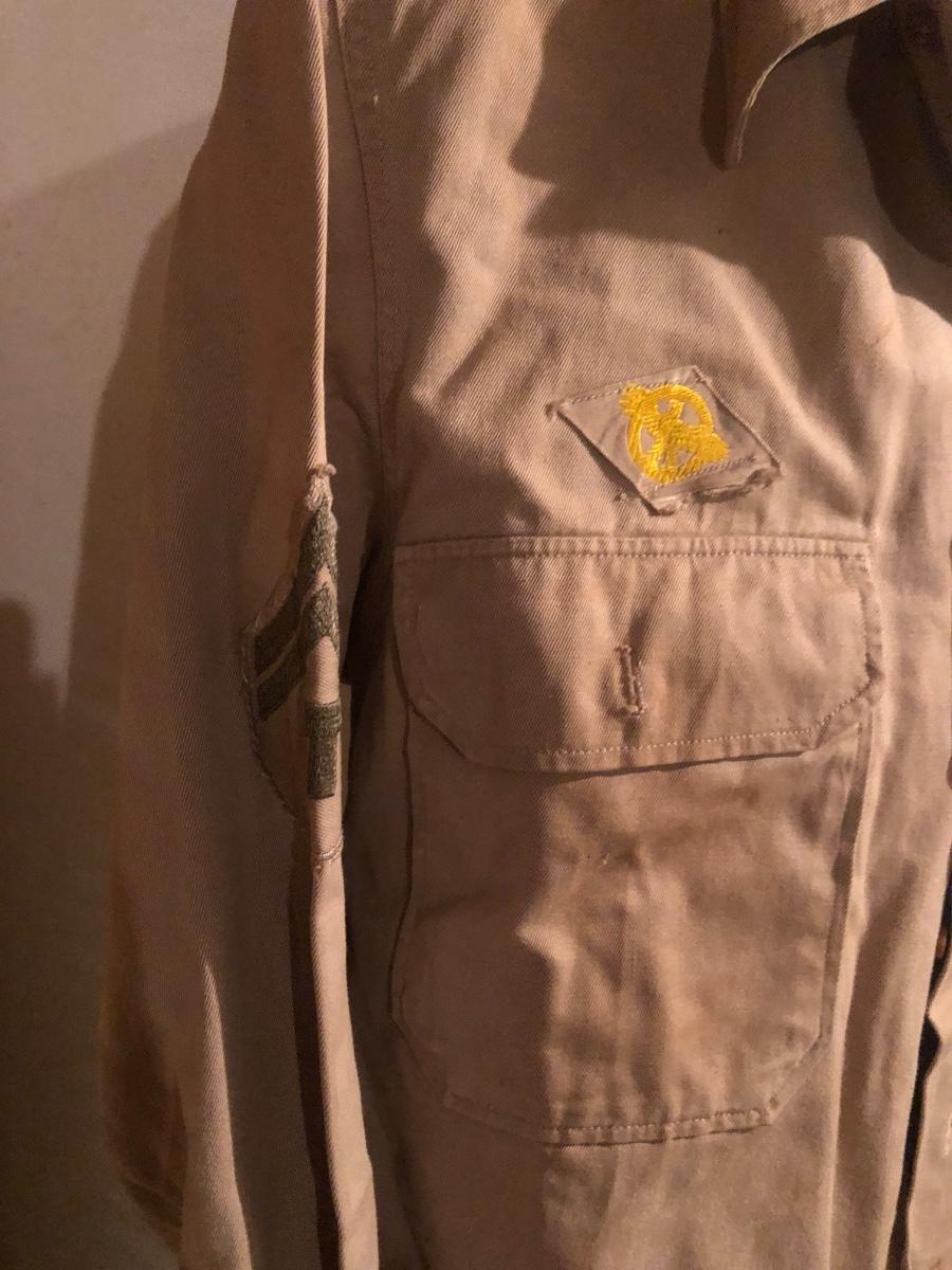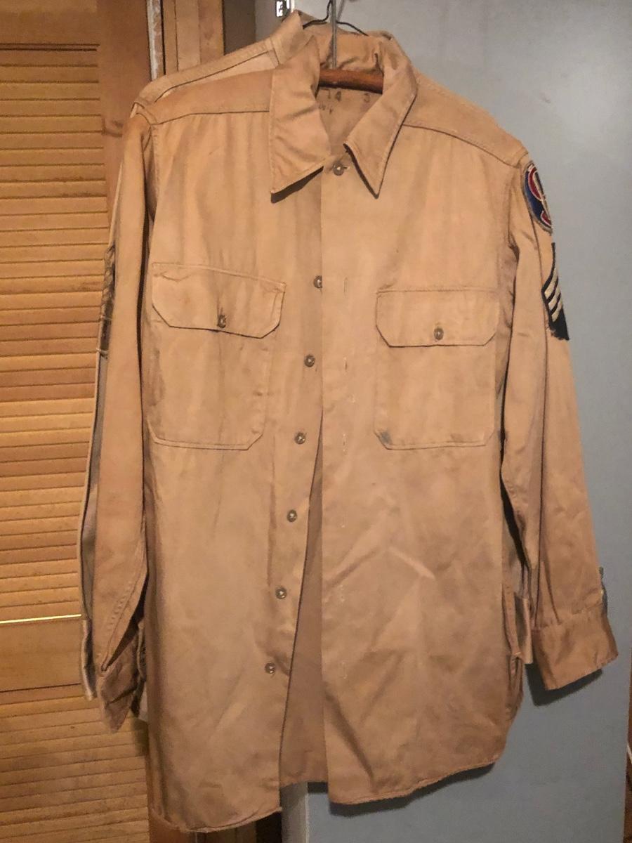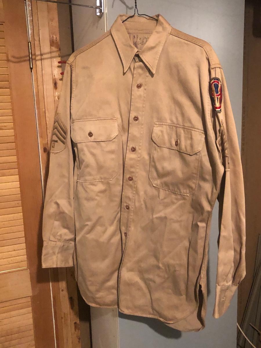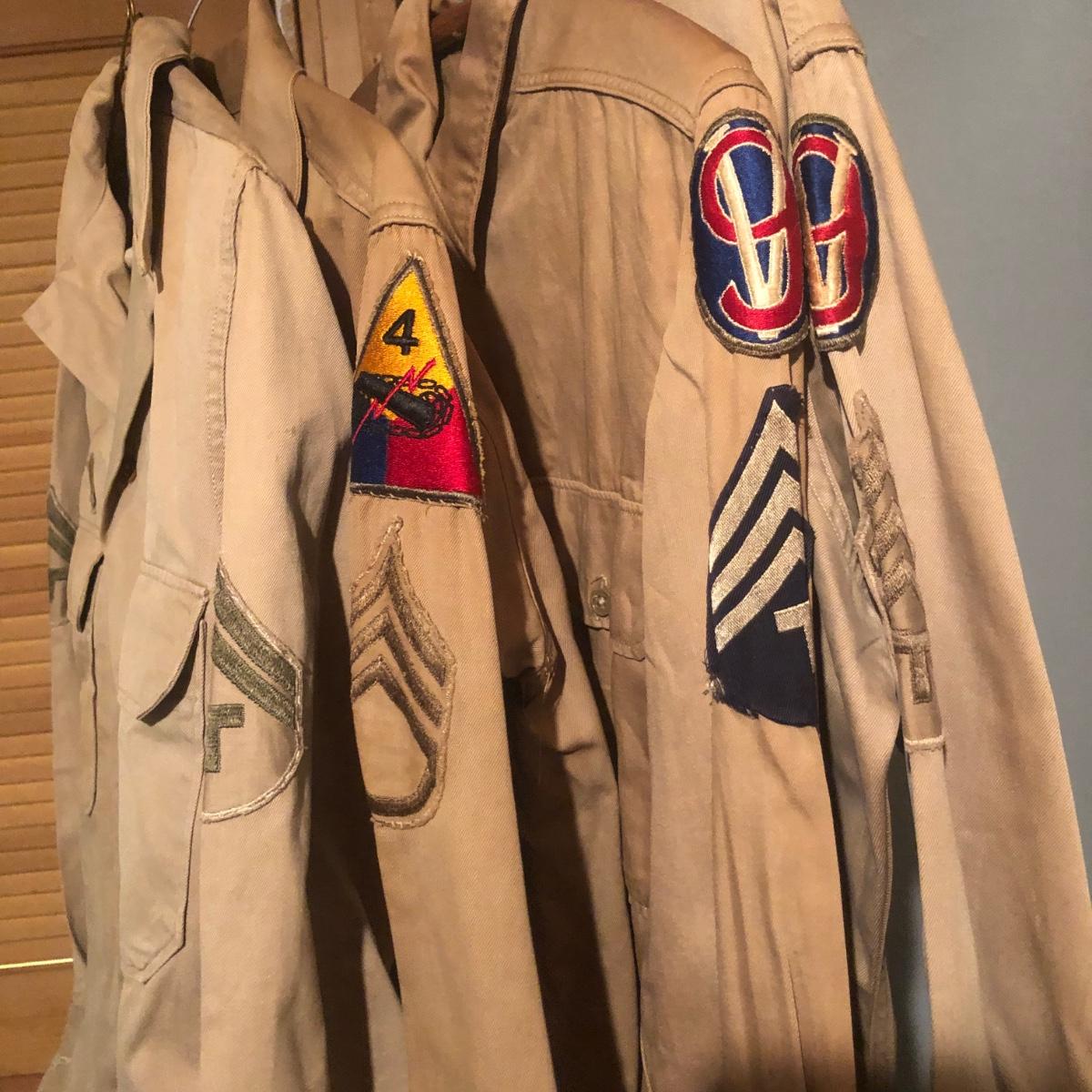 Includes four United States Army Shirts. Two have a V9 patch representing the 95th Infantry Division, and they include a technicians patch. Also included is a World War I mess kit holder with a battalion button, World War II pistol belt & empty ammunition pouches. World War II mess kits & canteen.
