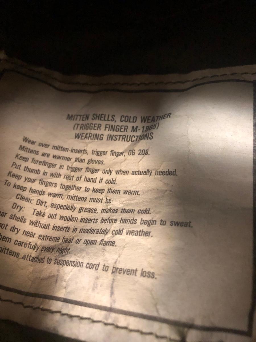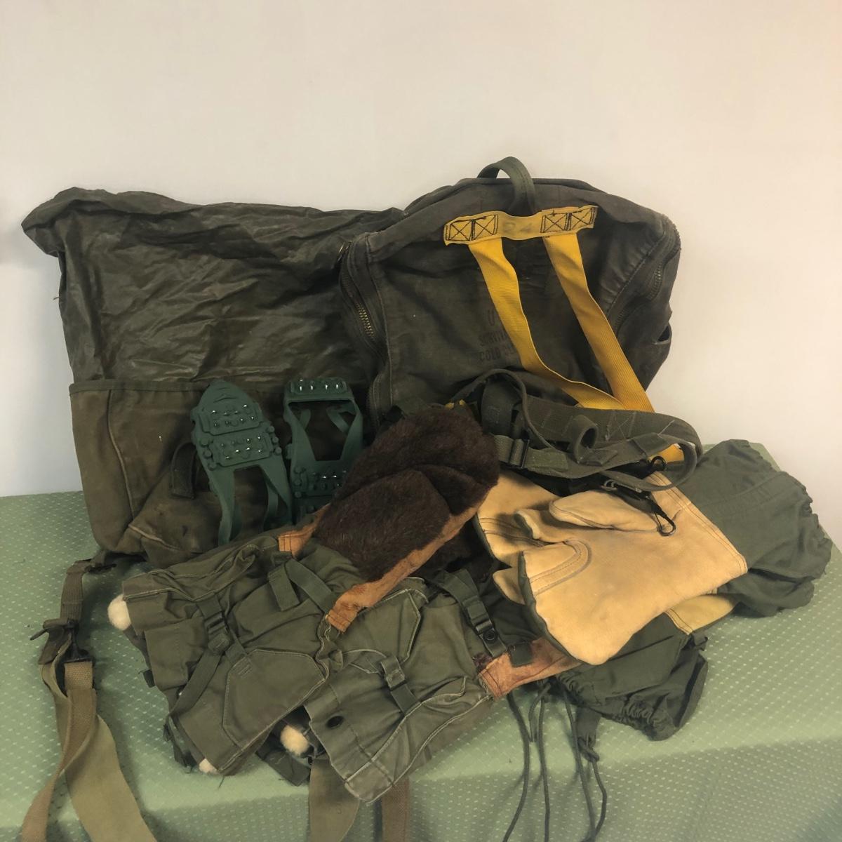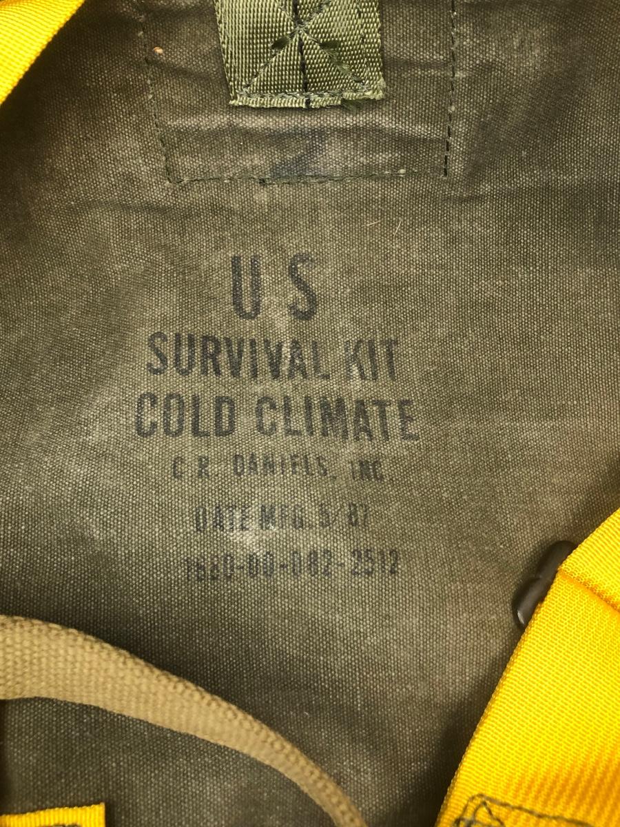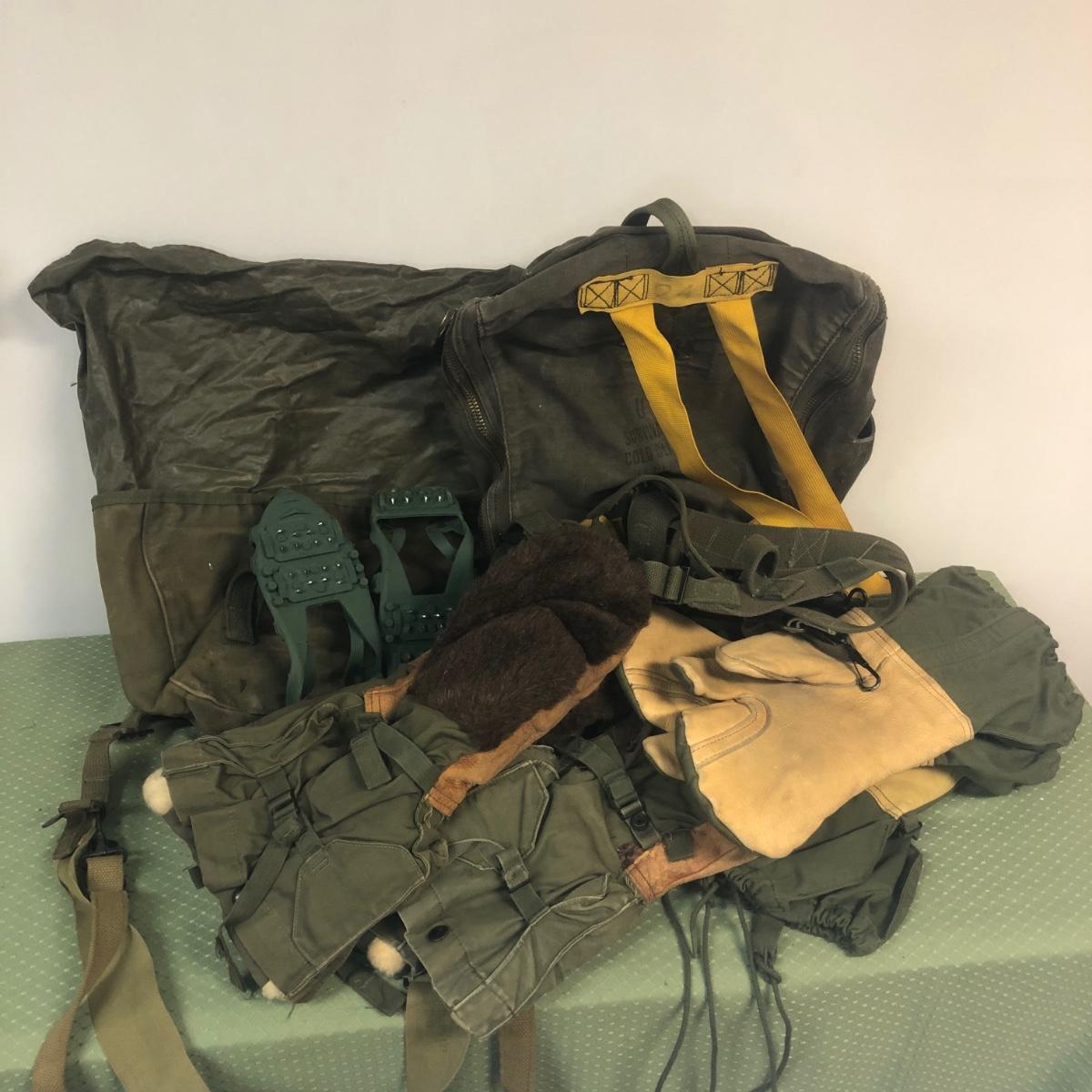 Includes an empty bag labeled US Survival Kit Cold Climate, two pairs of mitten liners, two pairs of cold weather gloves and snow shoe covers.