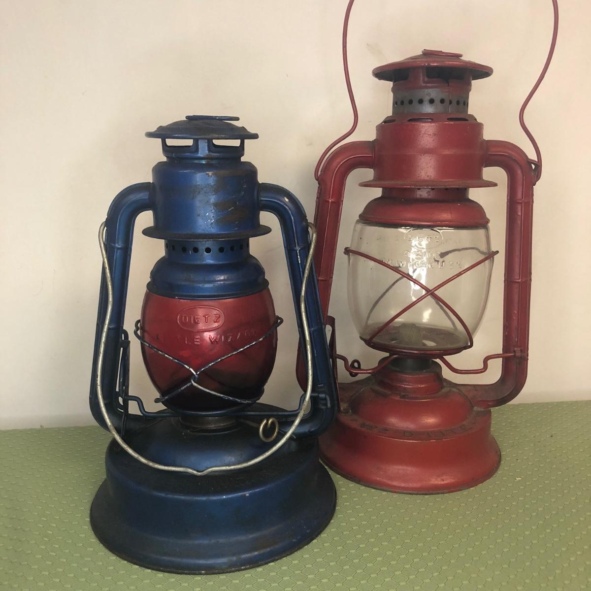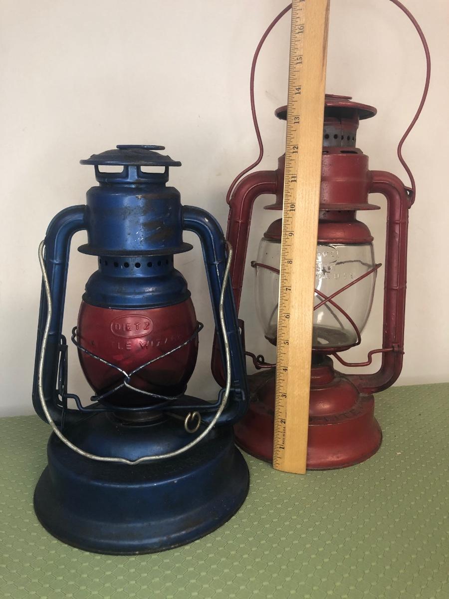 Two metal oil lanterns with glass globes made by Dietz in New York, USA.