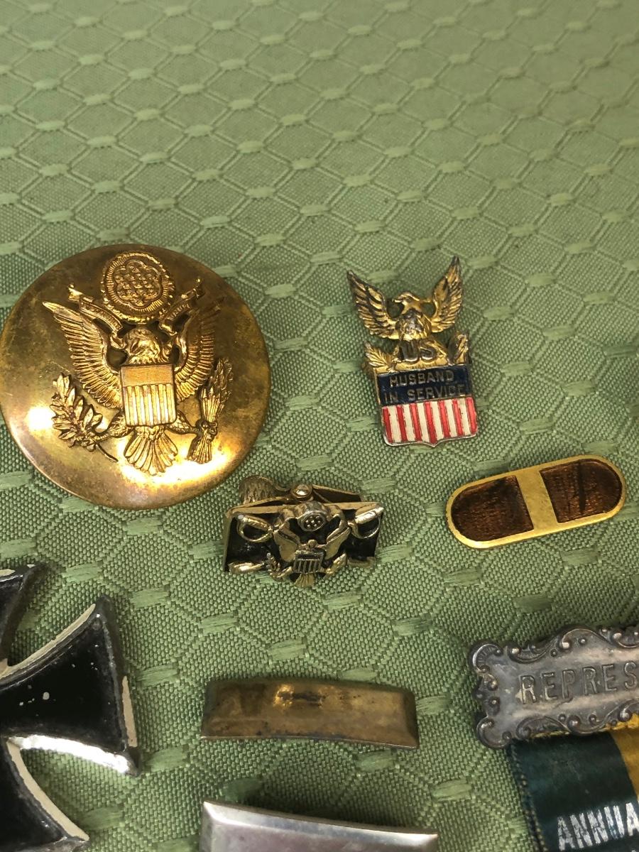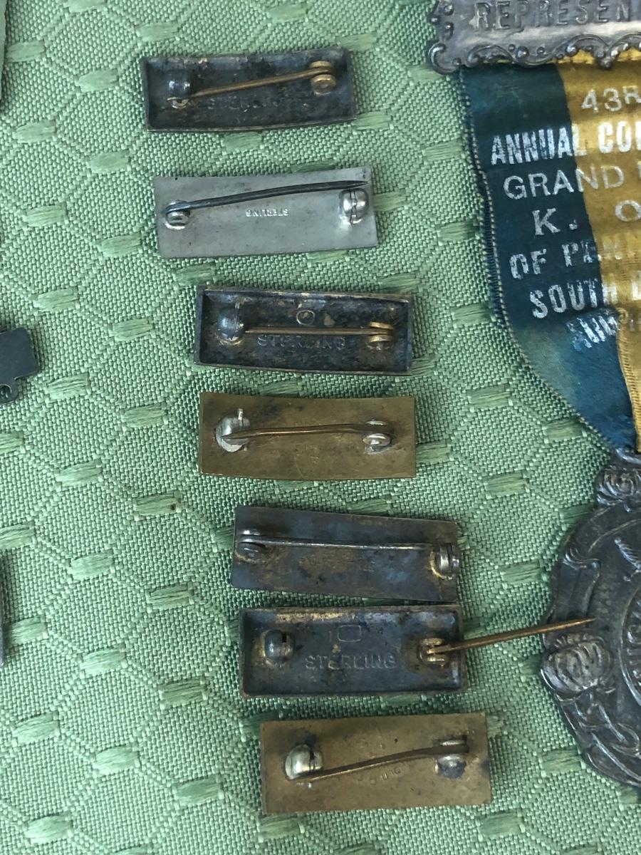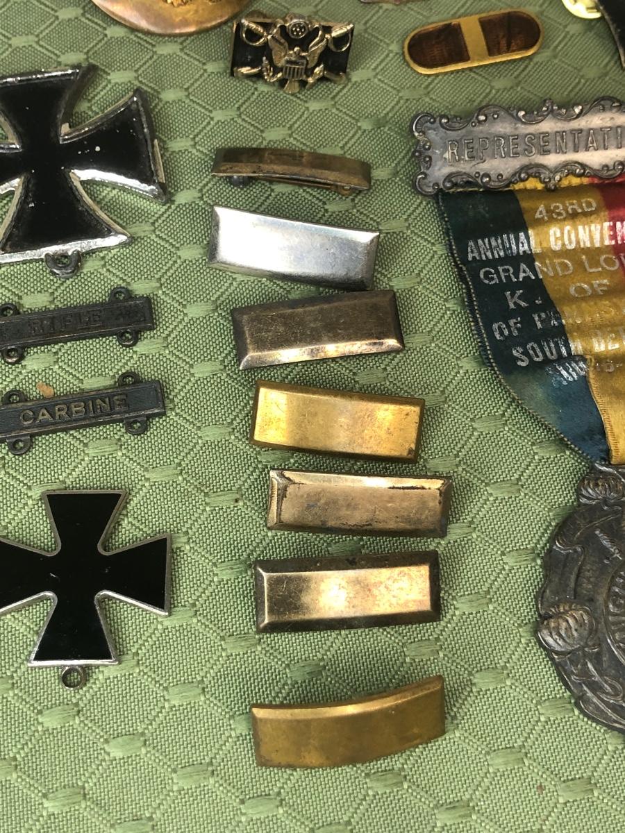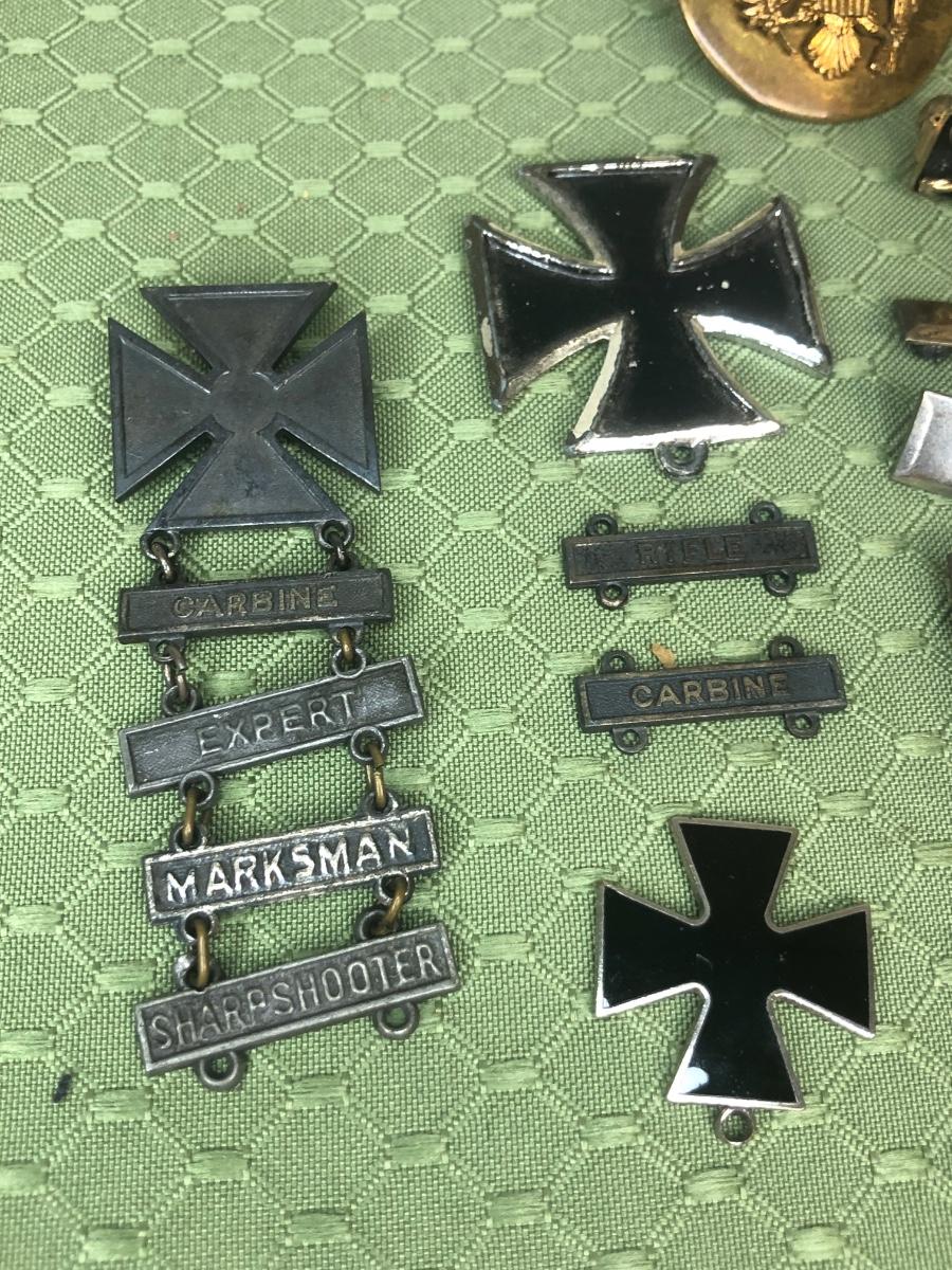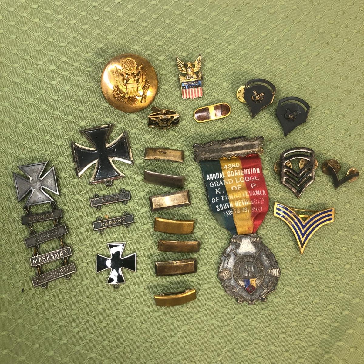 Includes various military pins for different things including rank, marksmanship, and more. Some pins are sterling silver and note so on the back.