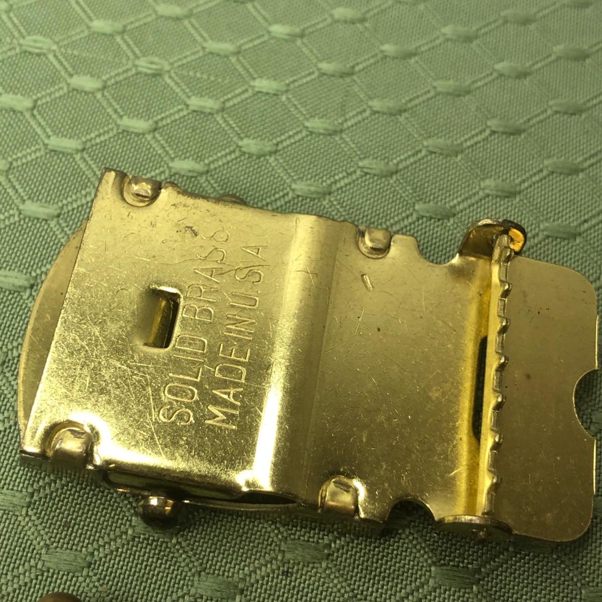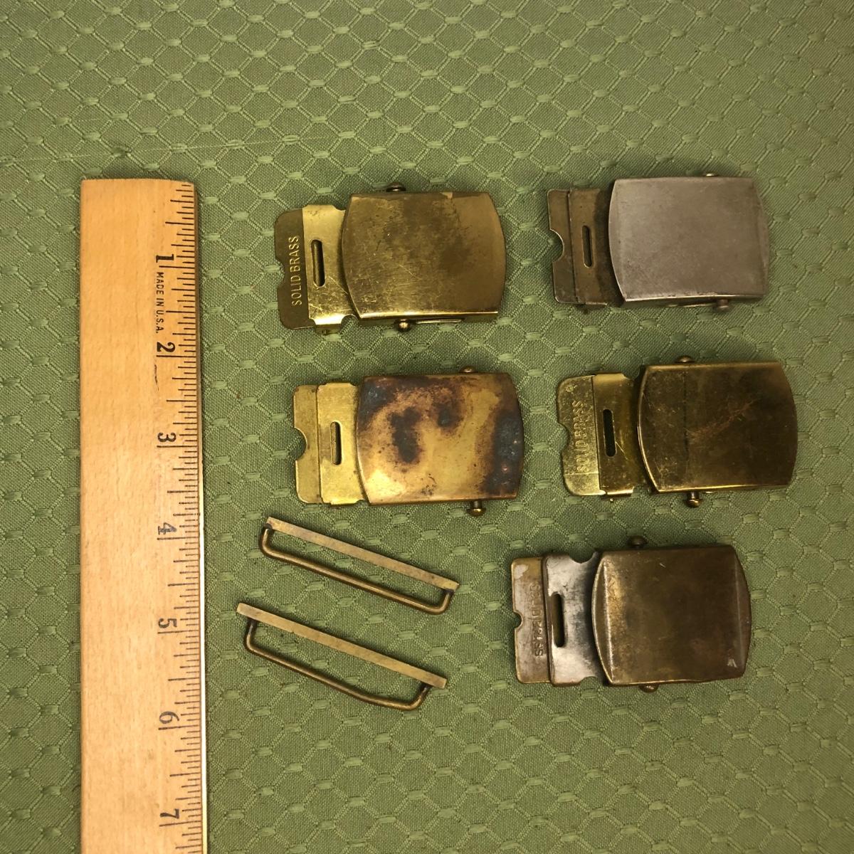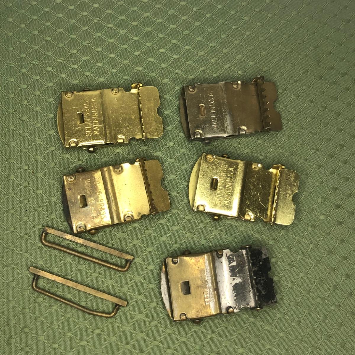 Five brass belt buckles made in the USA.