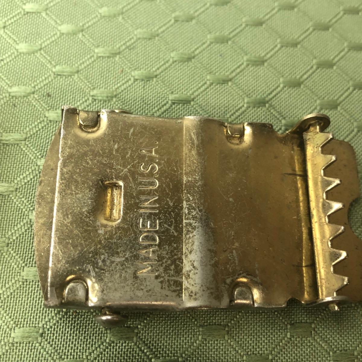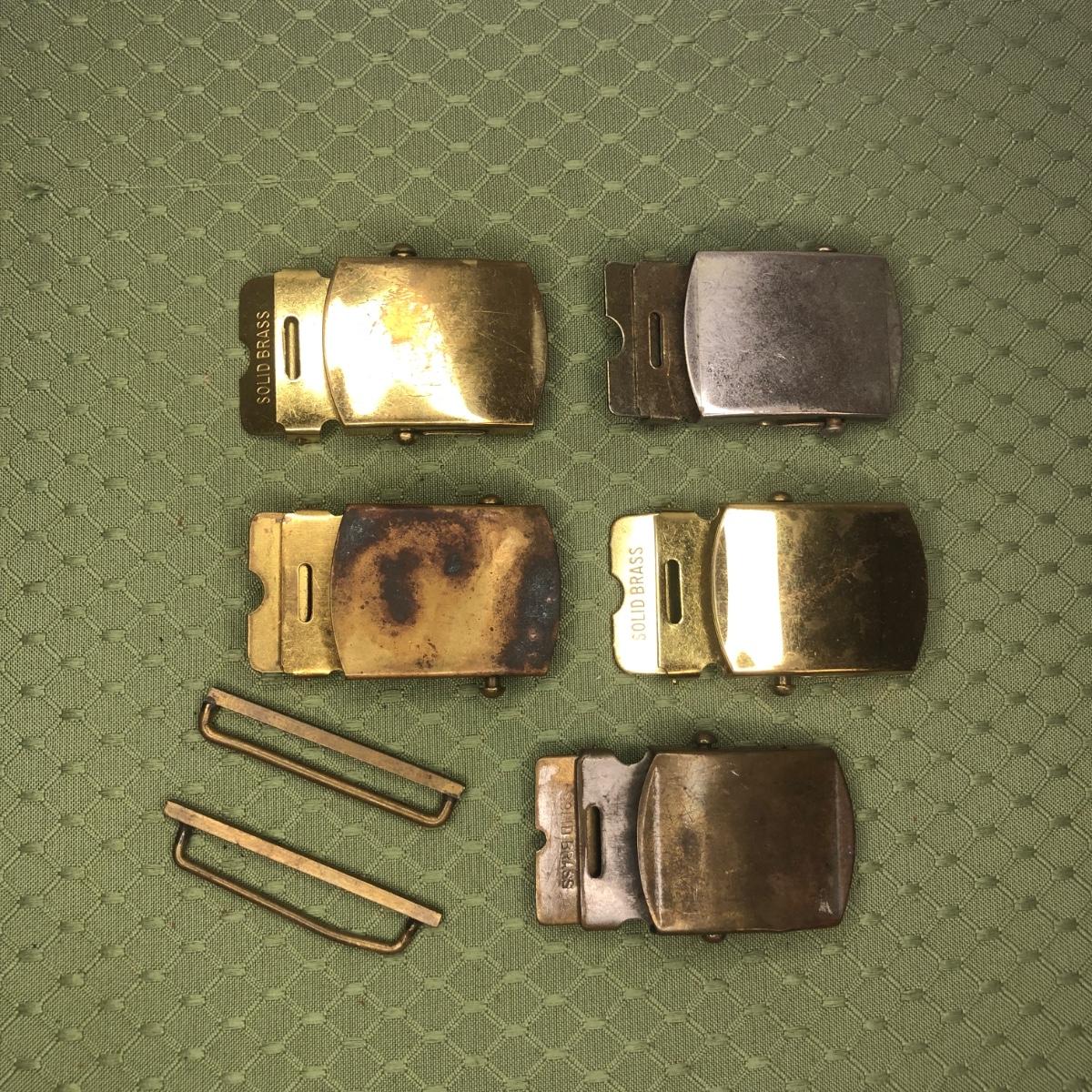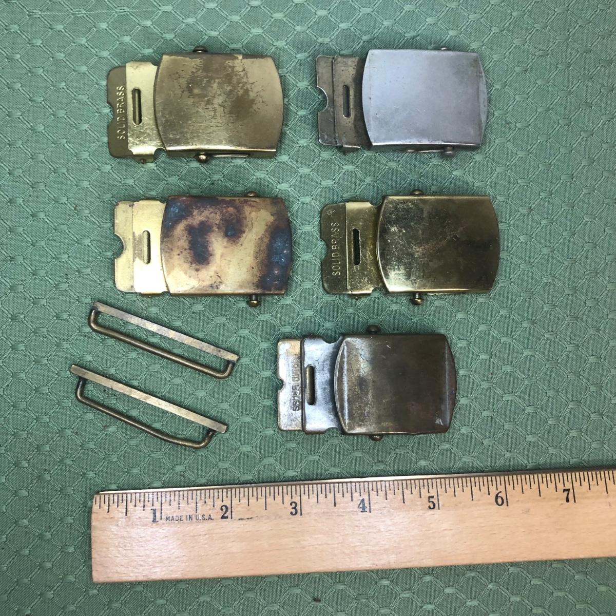 Five brass belt buckles made in the USA.
