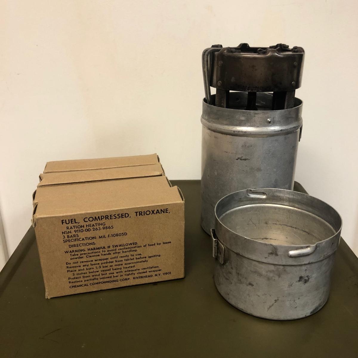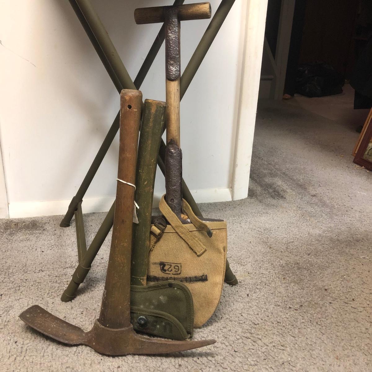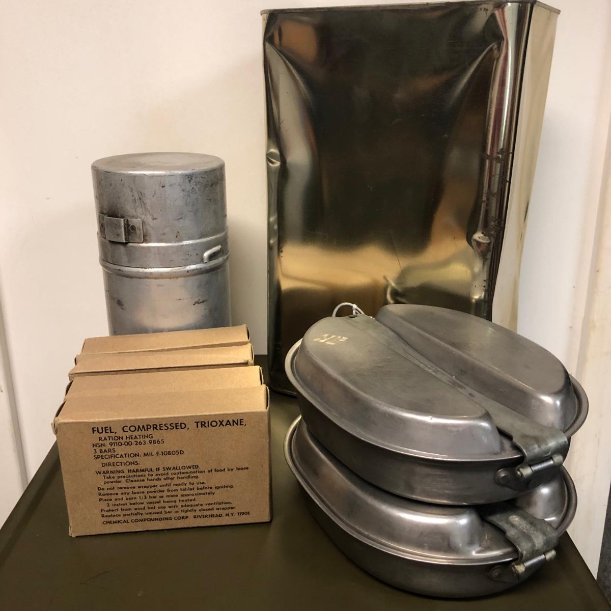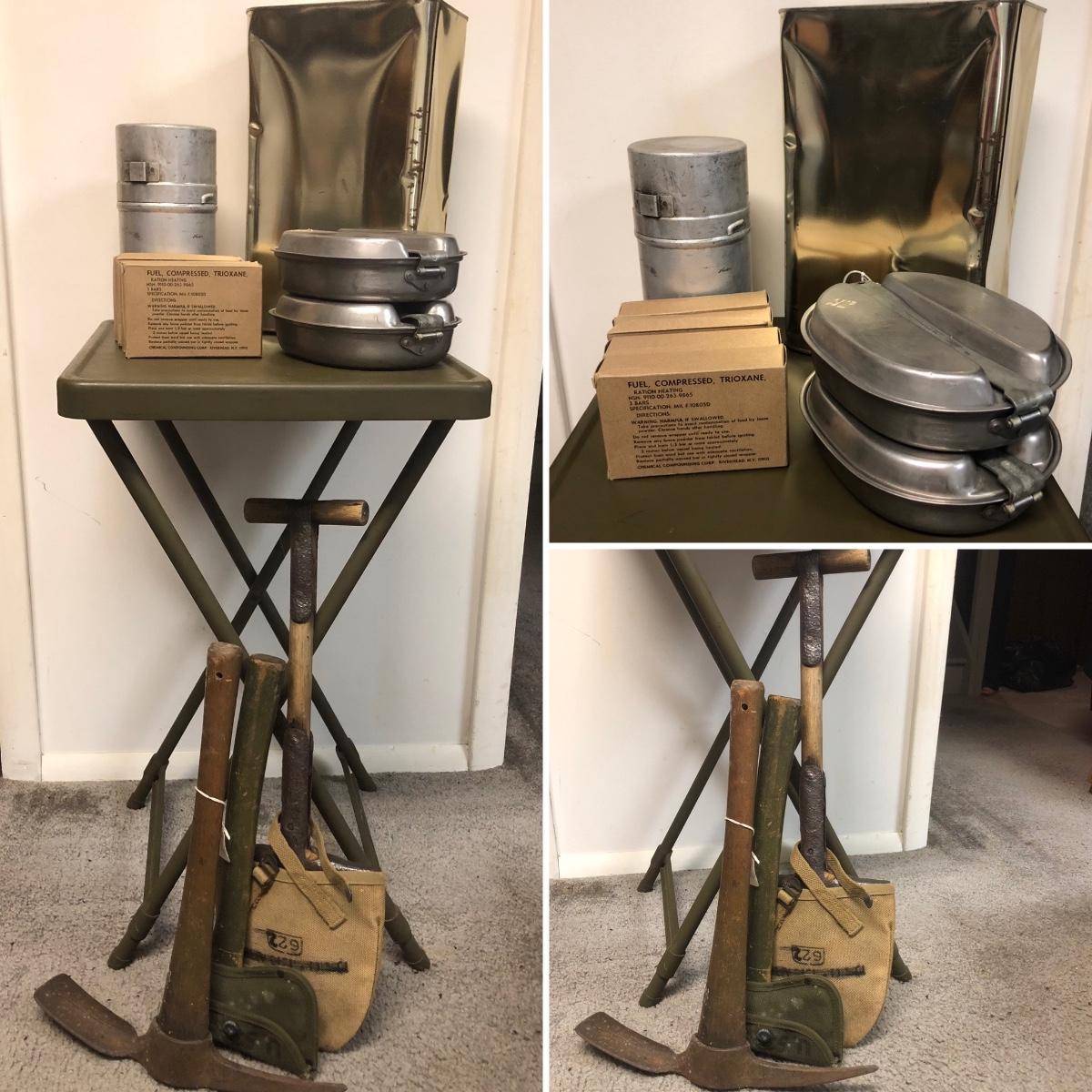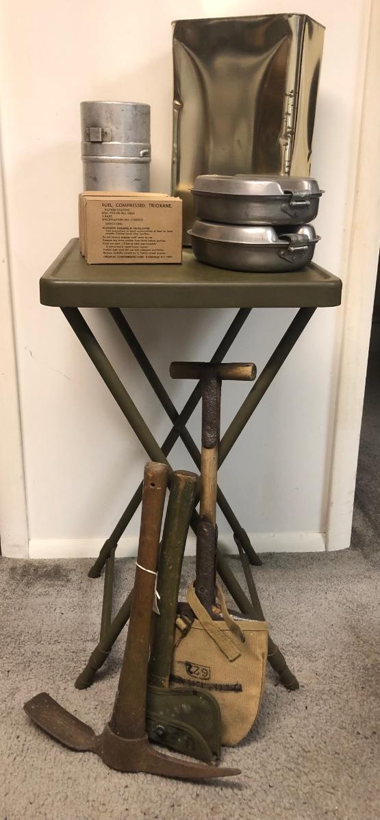 Includes a folding army green table, two mess kits from WWII and a stove with boxes of compressed fuel. Also includes a large tin of Civil Defense All Purpose Survival Crackers,, a shovel with a US shovel cover, an axe and a pickaxe.