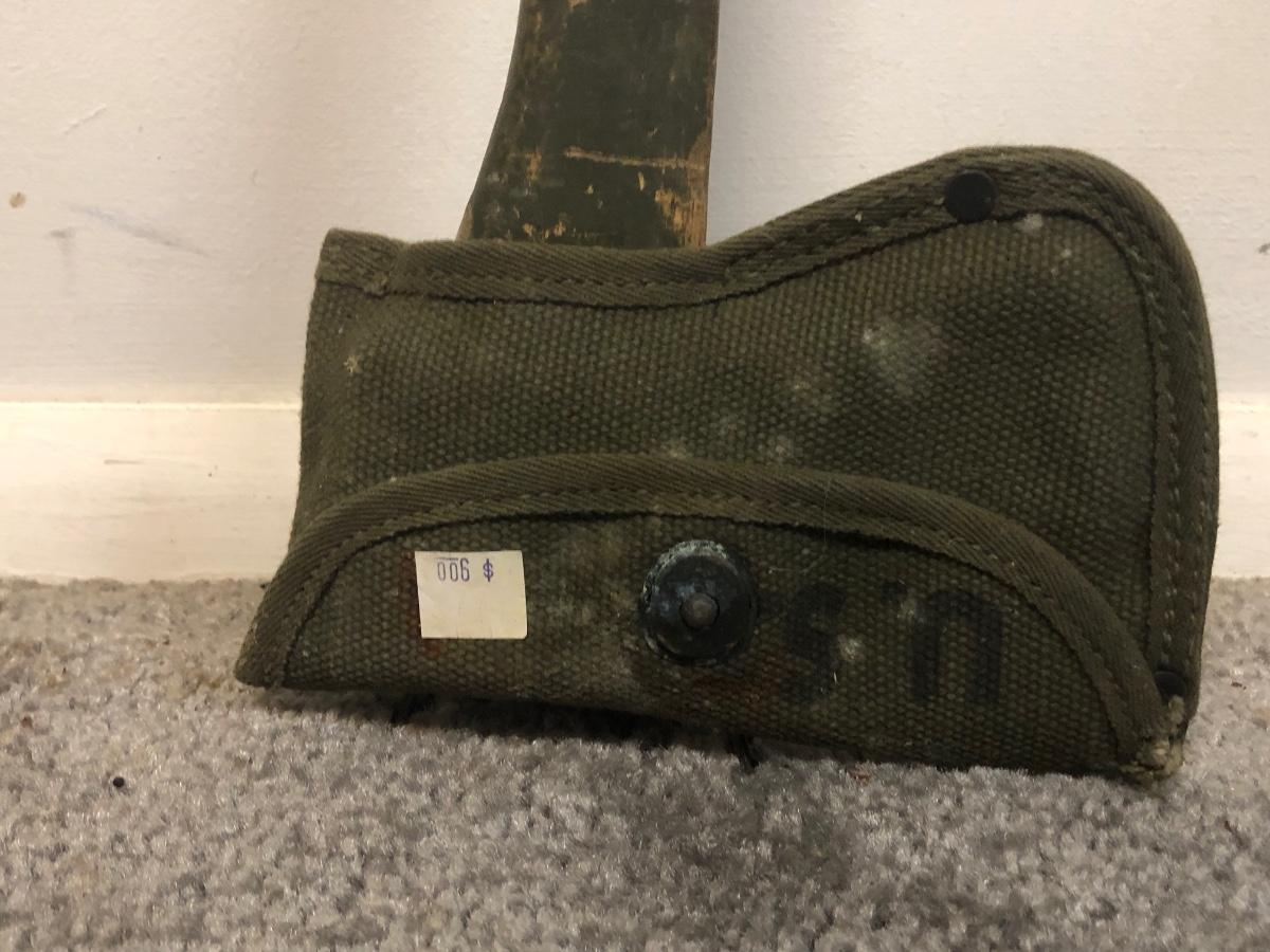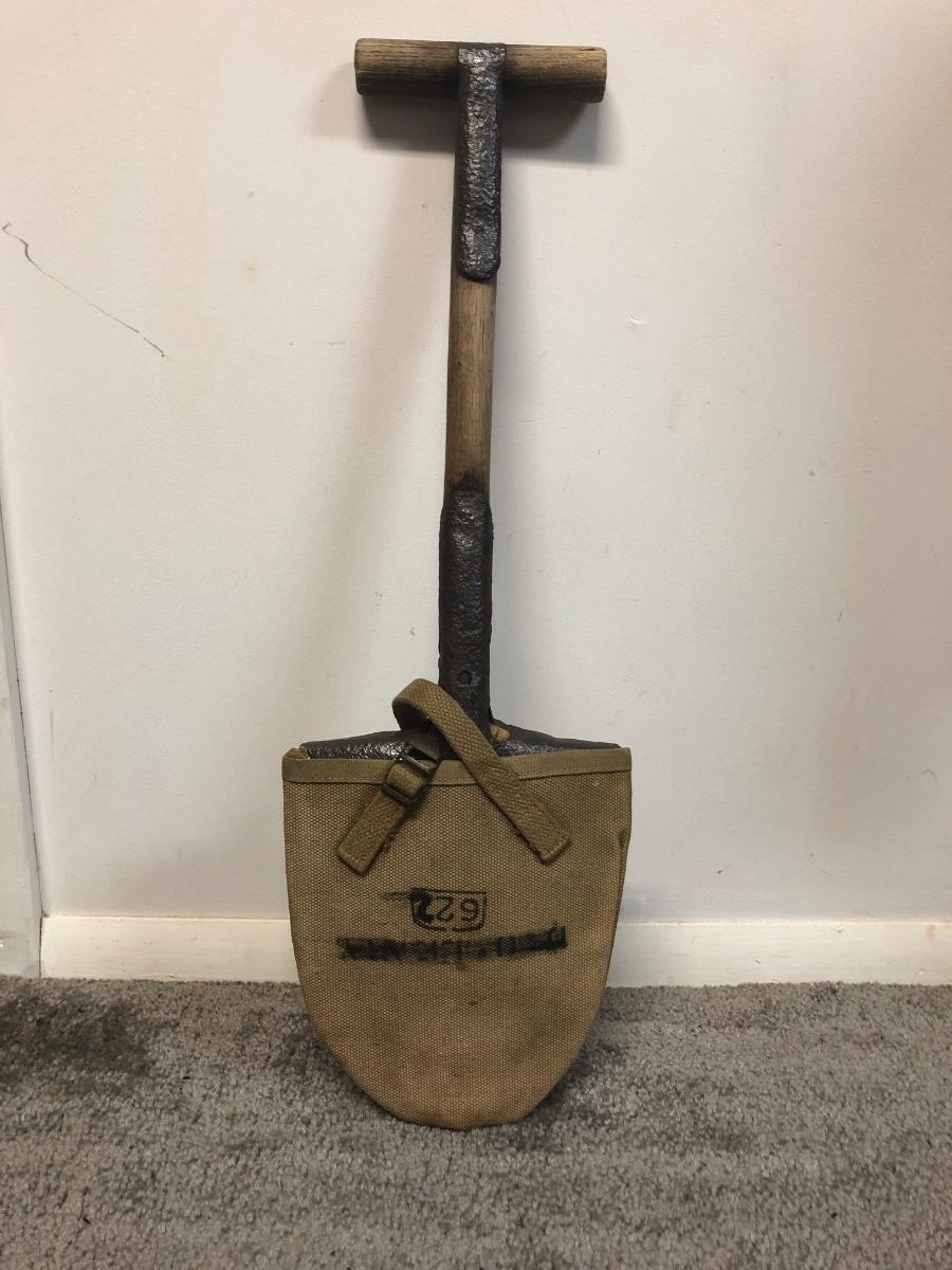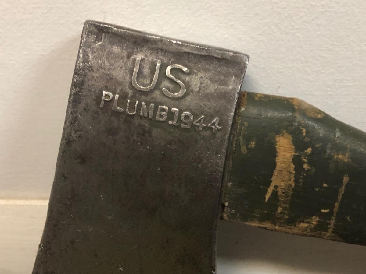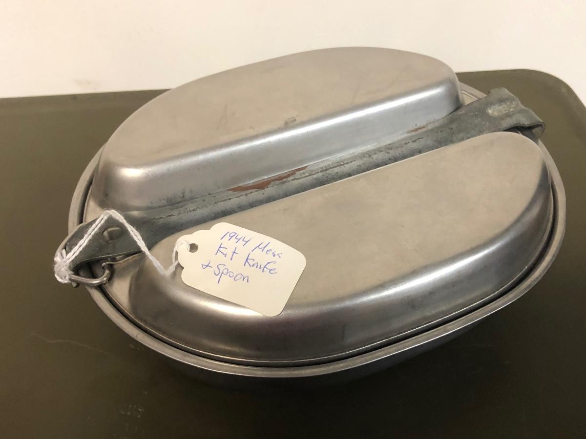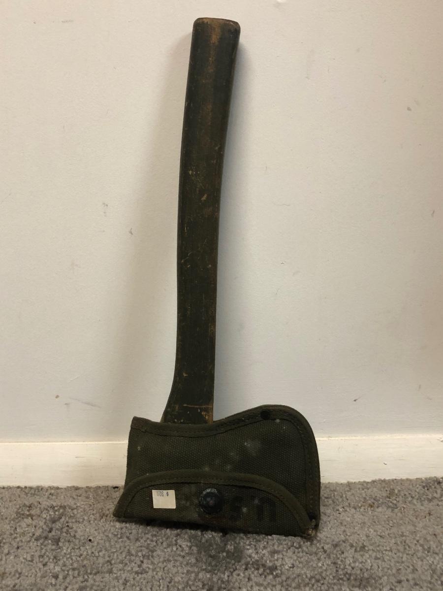 Includes a folding army green table, two mess kits from WWII and a stove with boxes of compressed fuel. Also includes a large tin of Civil Defense All Purpose Survival Crackers,, a shovel with a US shovel cover, an axe and a pickaxe.