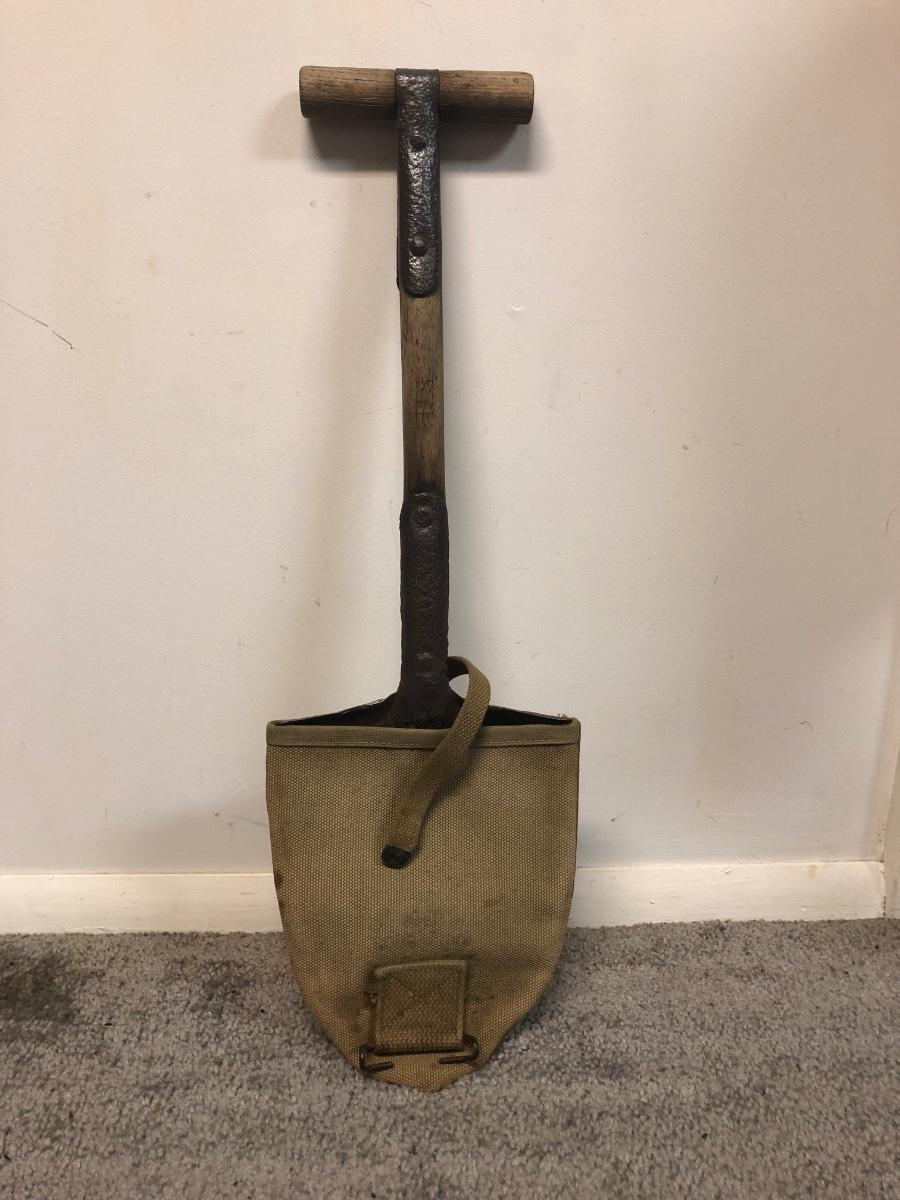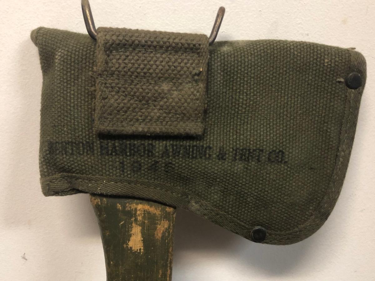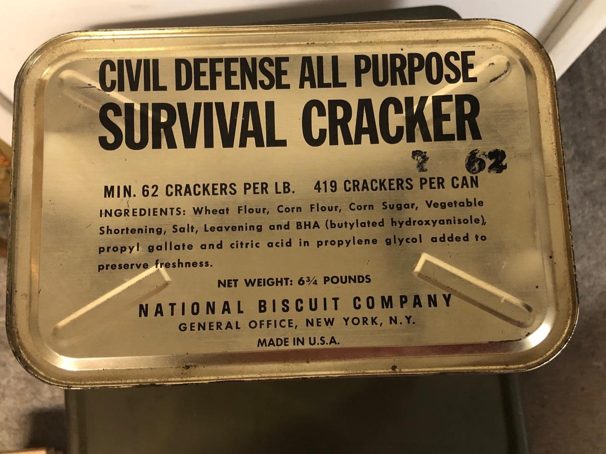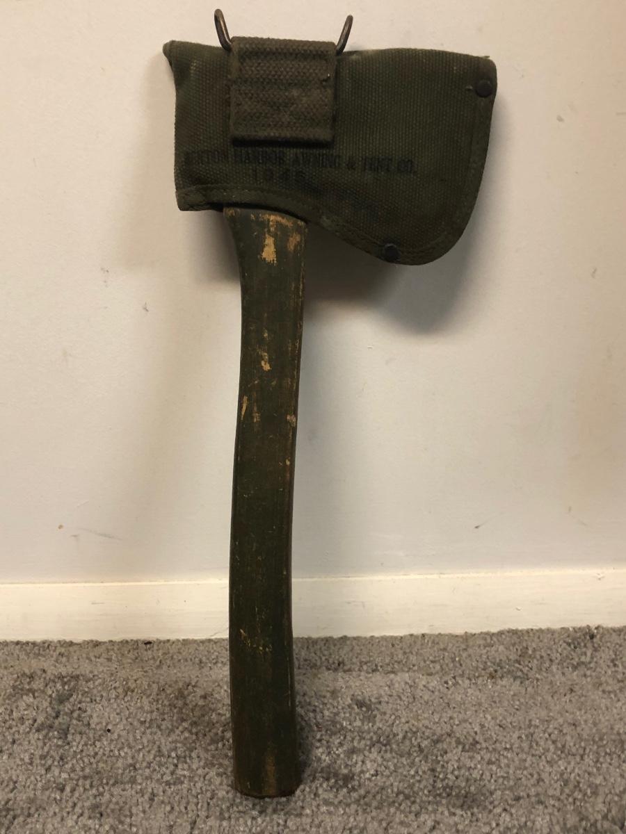 Includes a folding army green table, two mess kits from WWII and a stove with boxes of compressed fuel. Also includes a large tin of Civil Defense All Purpose Survival Crackers,, a shovel with a US shovel cover, an axe and a pickaxe.