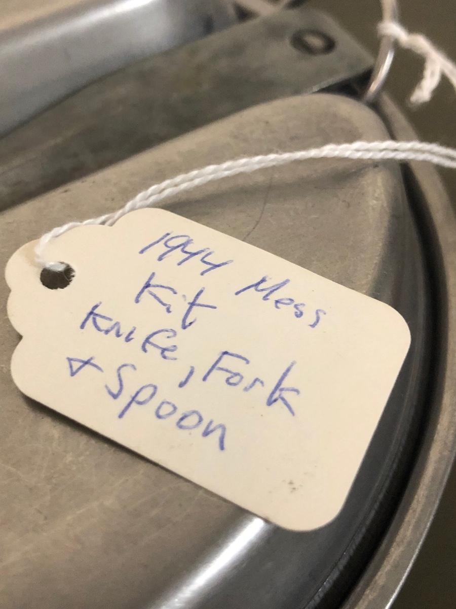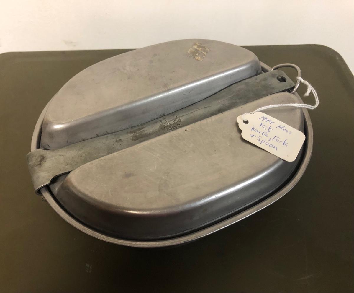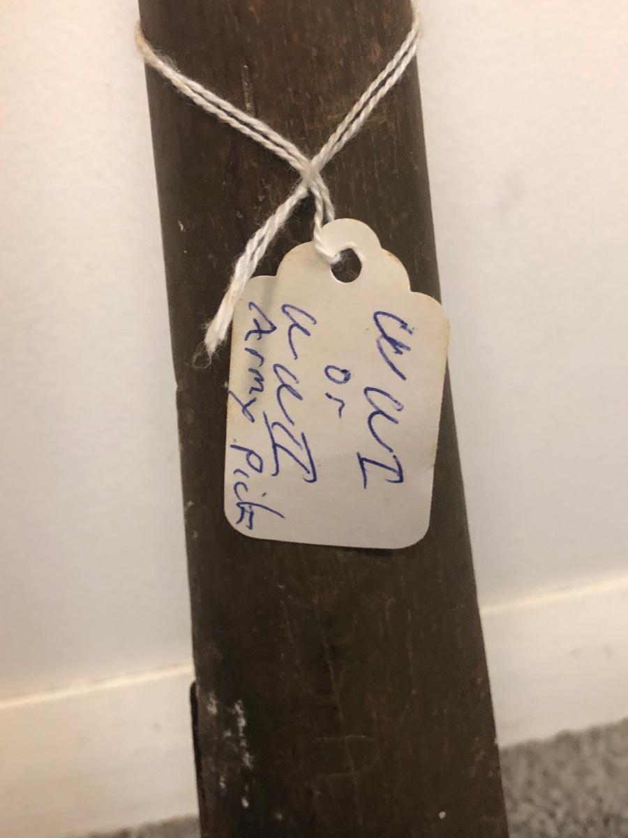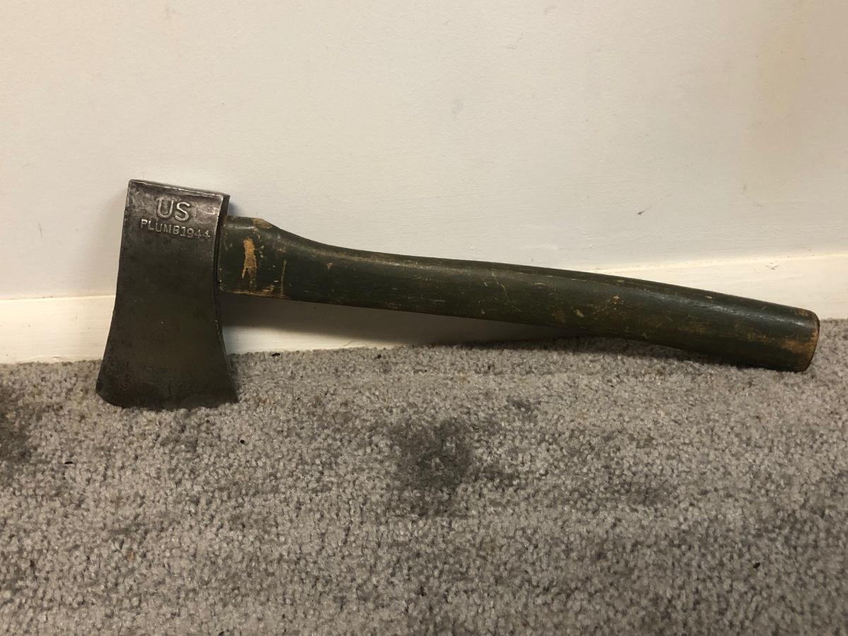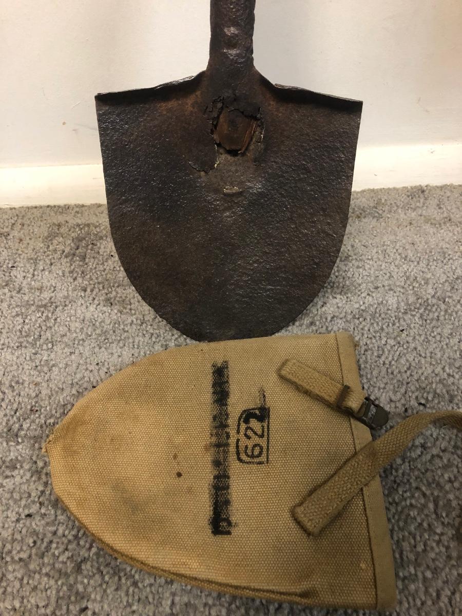 Includes a folding army green table, two mess kits from WWII and a stove with boxes of compressed fuel. Also includes a large tin of Civil Defense All Purpose Survival Crackers,, a shovel with a US shovel cover, an axe and a pickaxe.