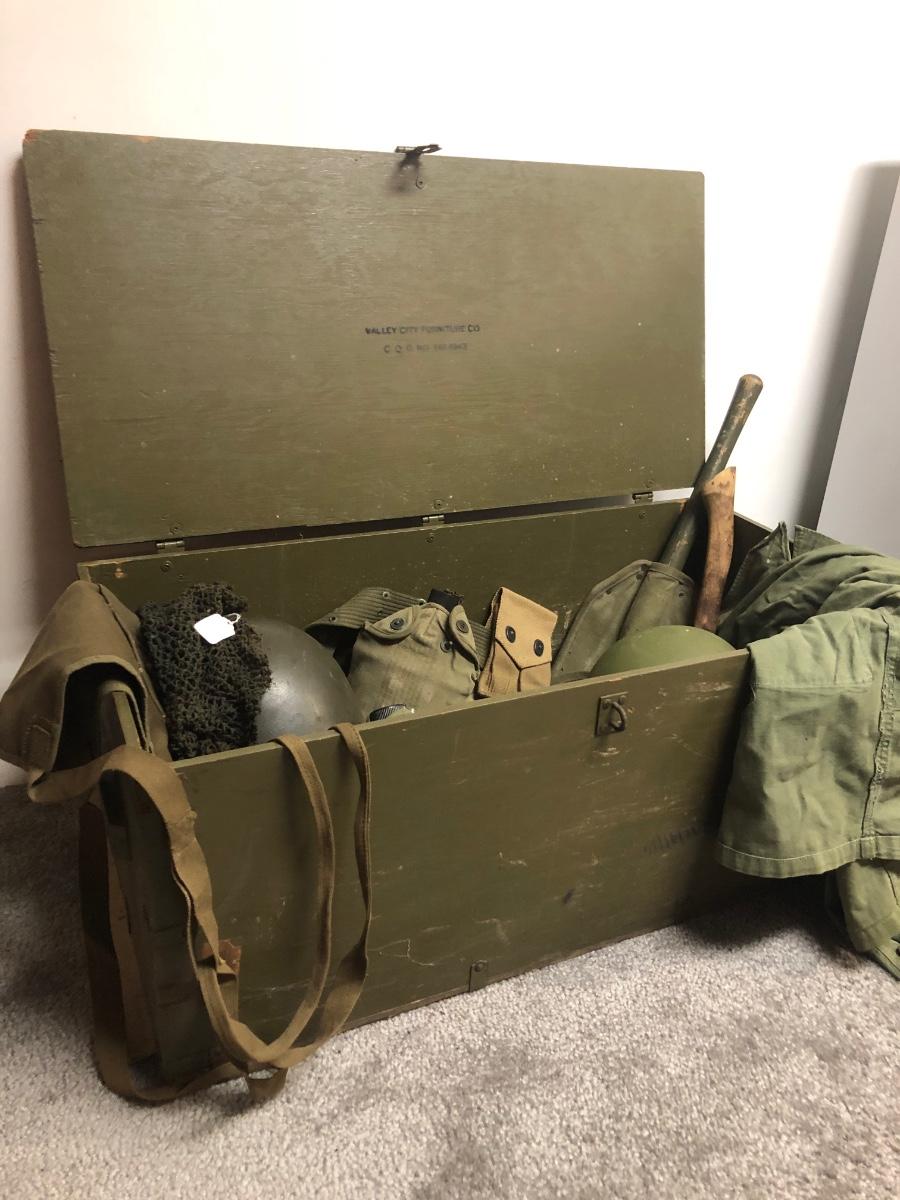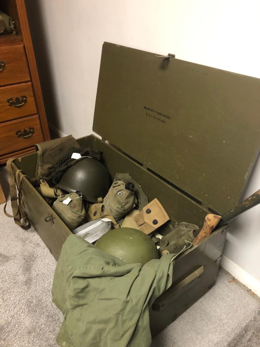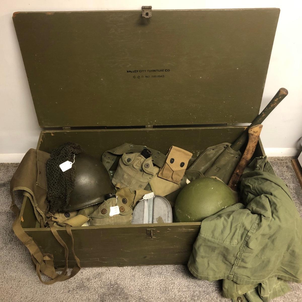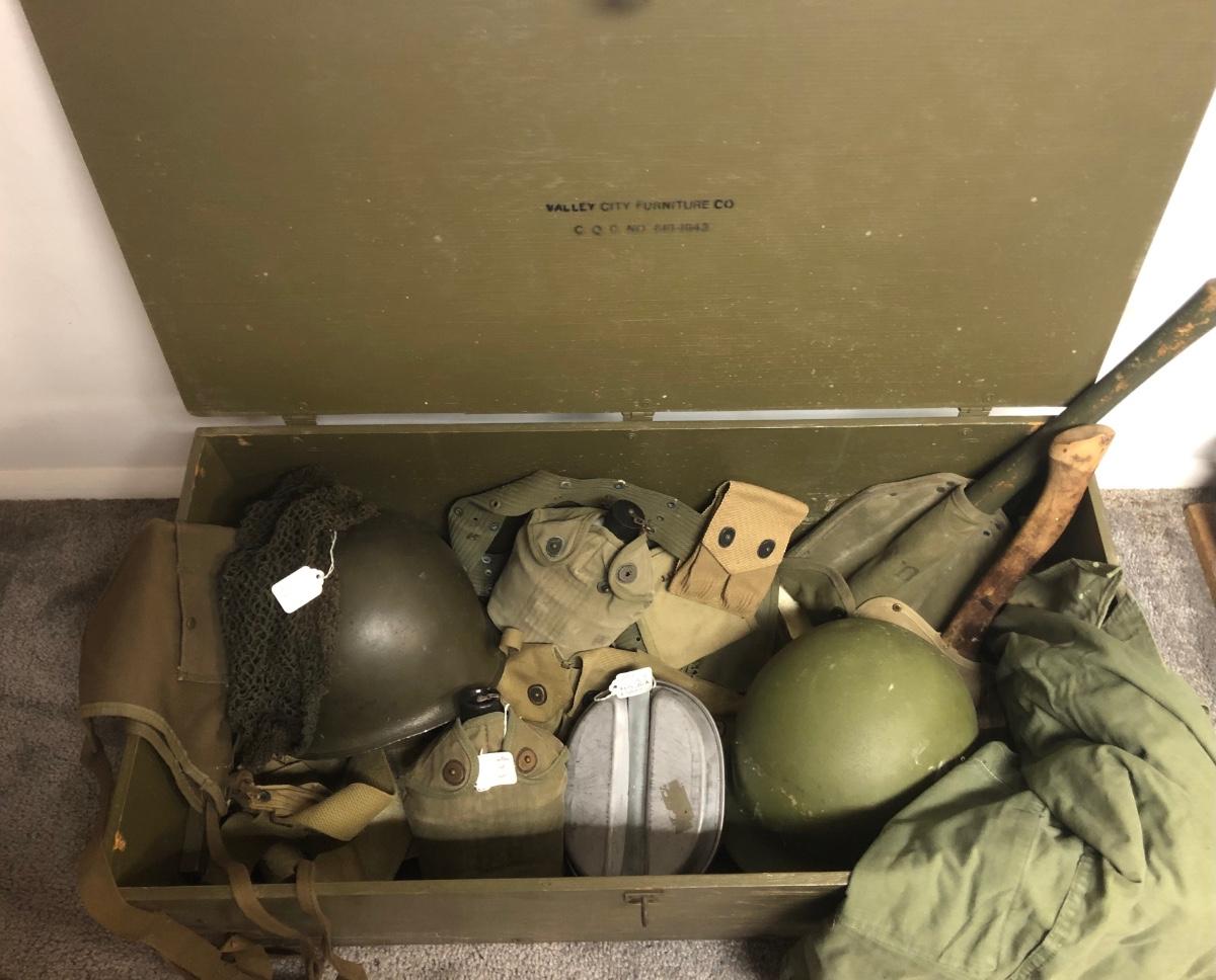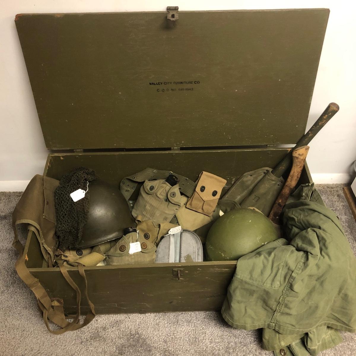 Includes the locker and all its contents. Contents include helmets, belts, mess kits & more. Footlocker measures 32W x 16D x 14H.