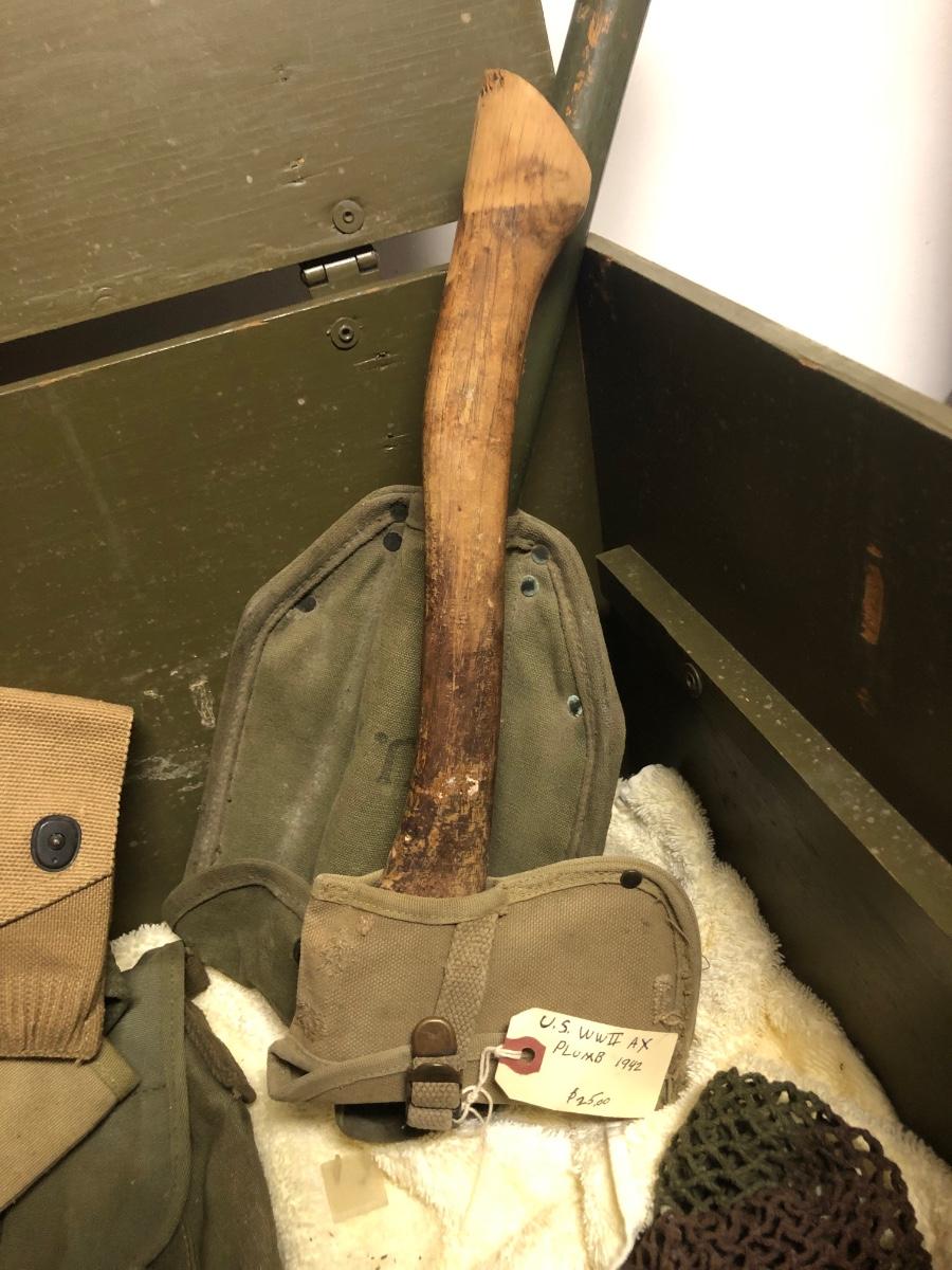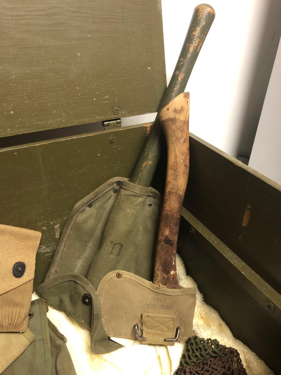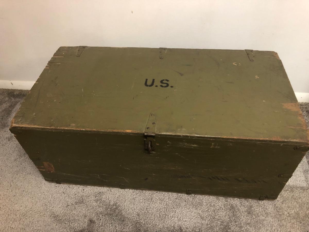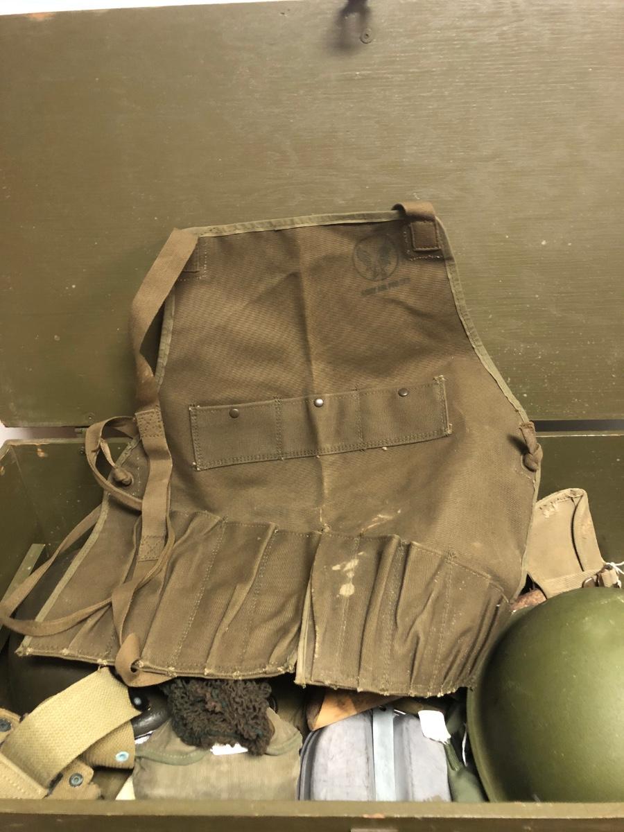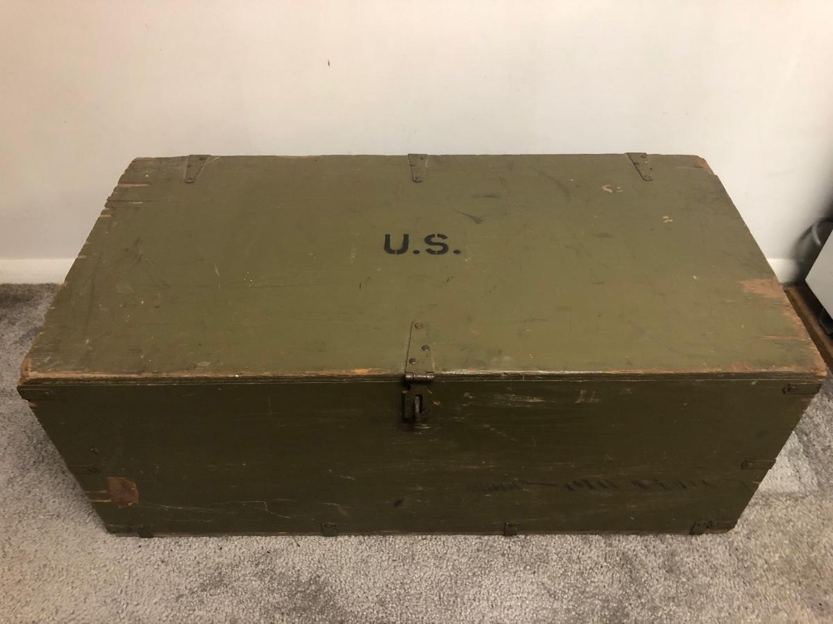 Includes the locker and all its contents. Contents include helmets, belts, mess kits & more. Footlocker measures 32W x 16D x 14H.