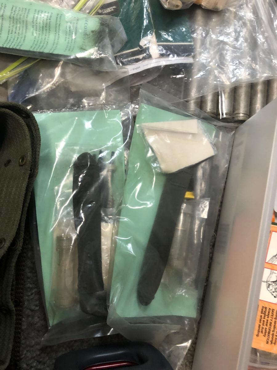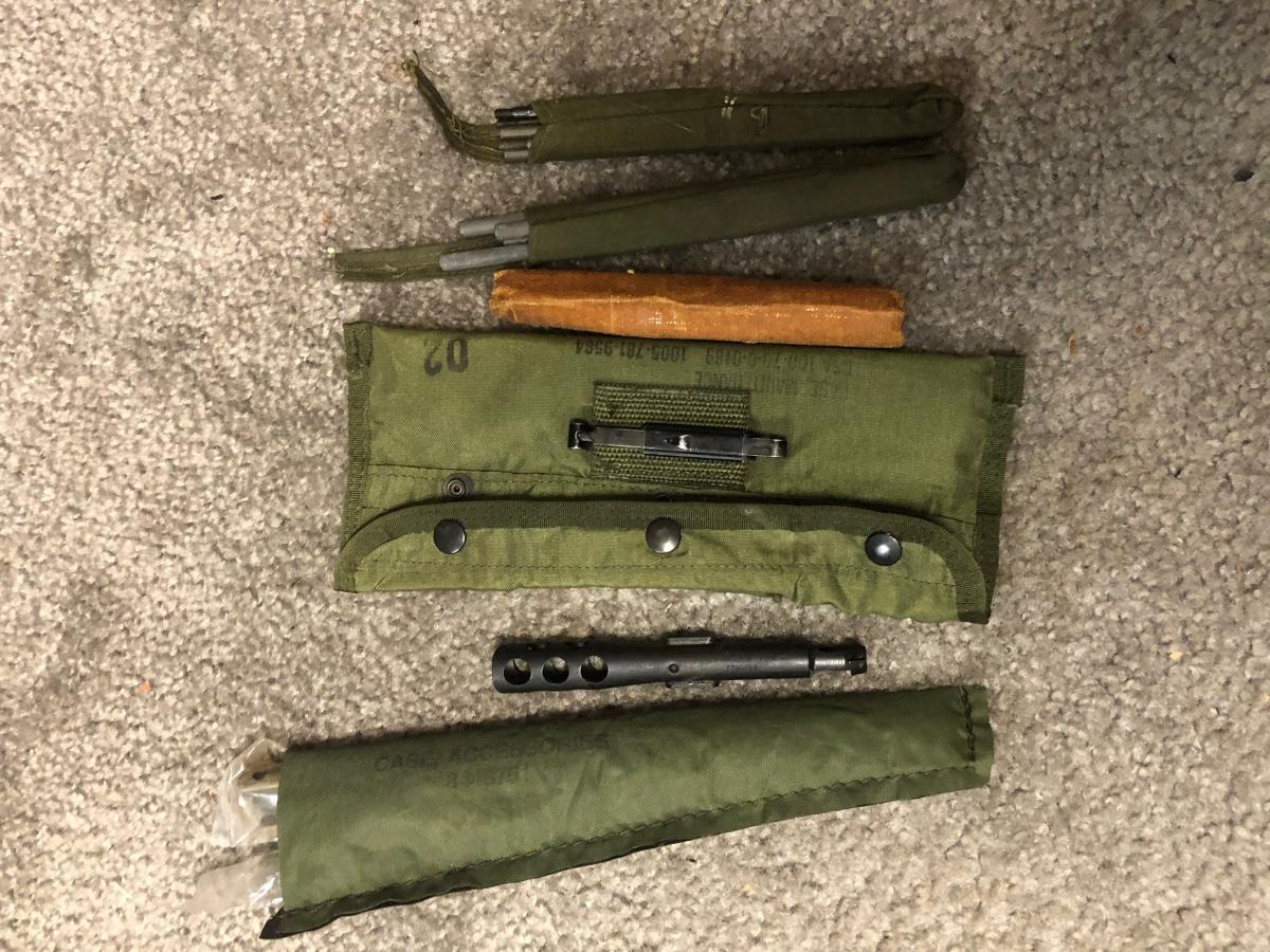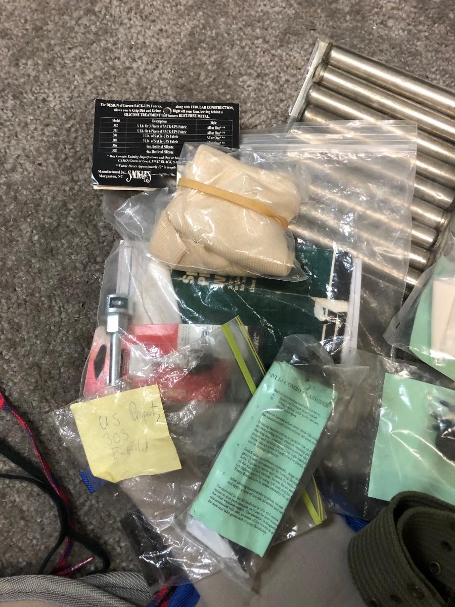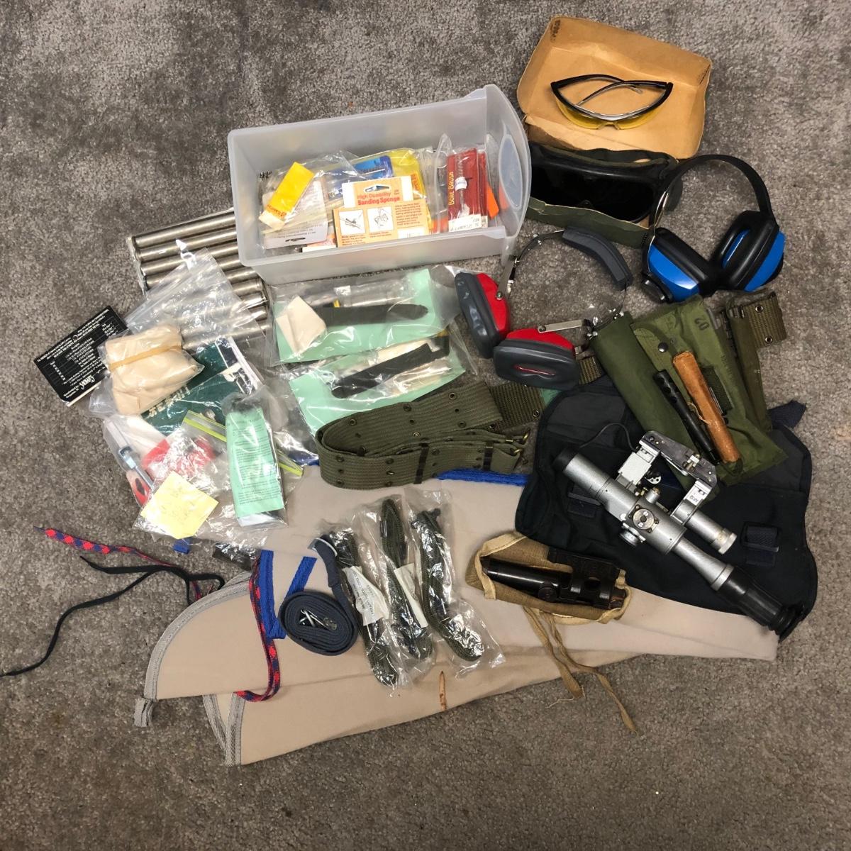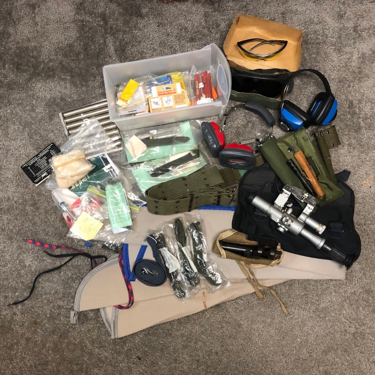 Includes a variety of gun cleaning accessories, an AK Sling, pistol cords and two scopes along with some safety gear.