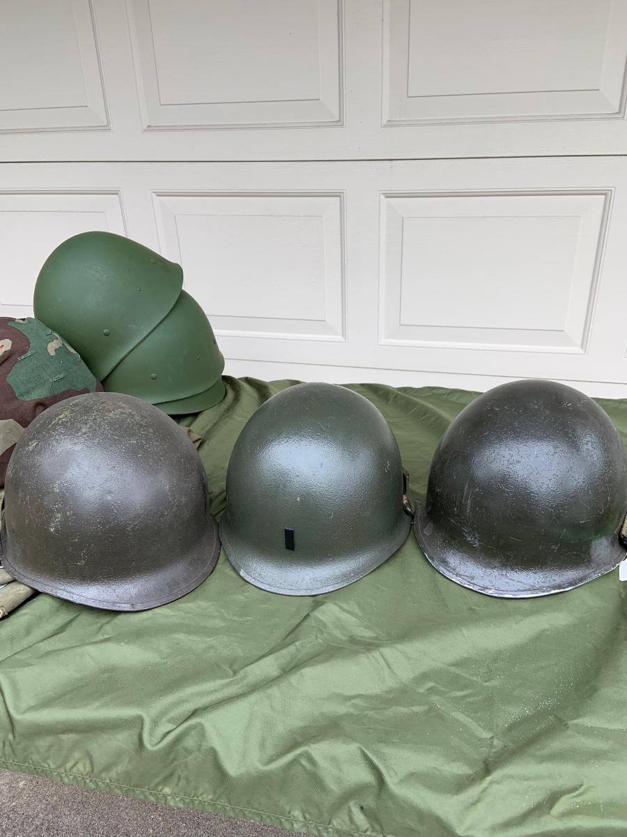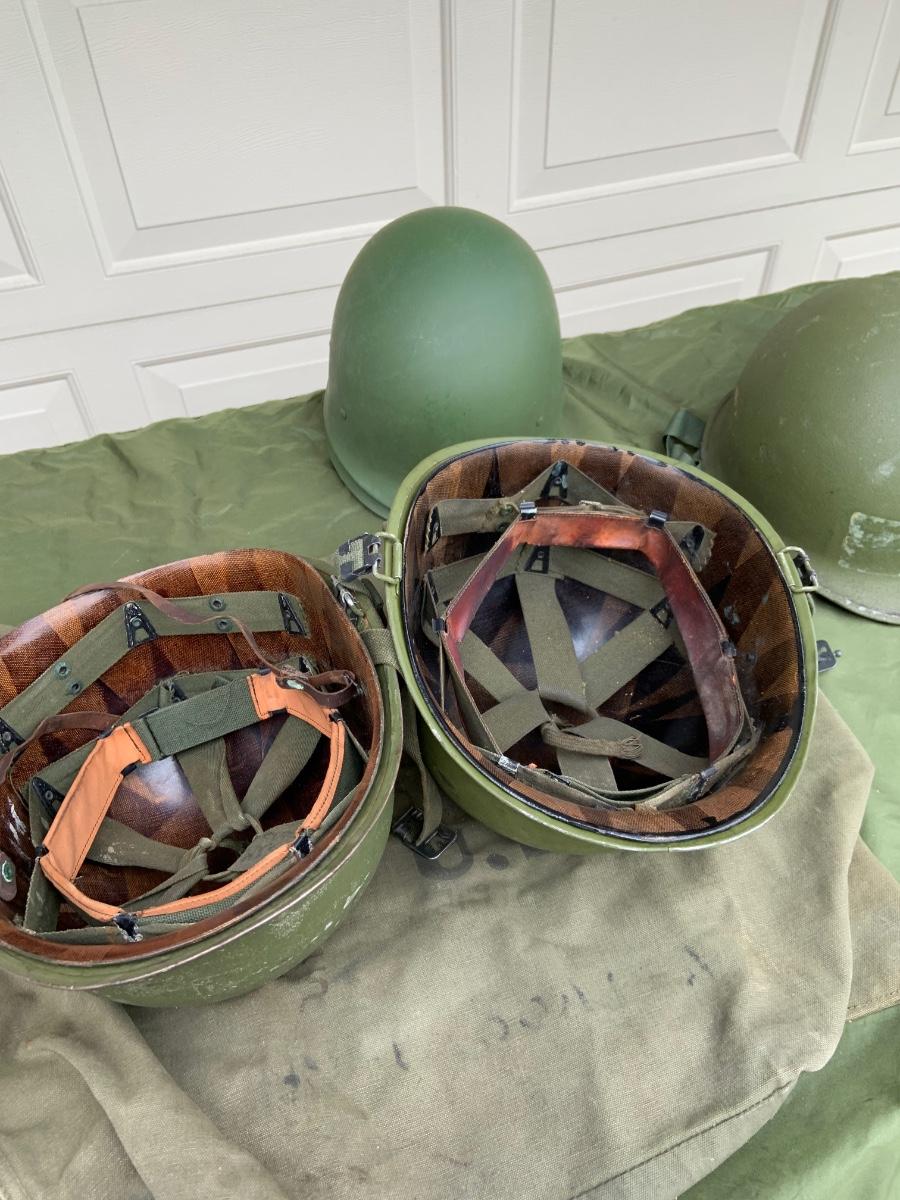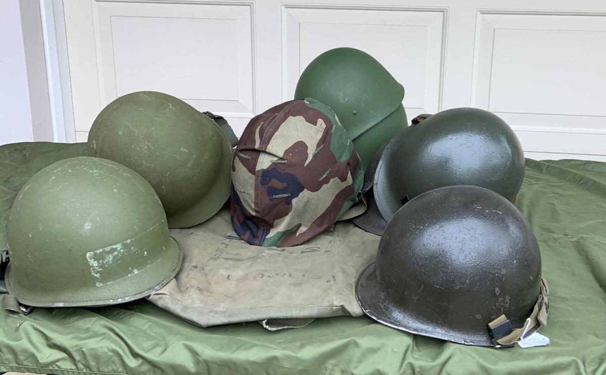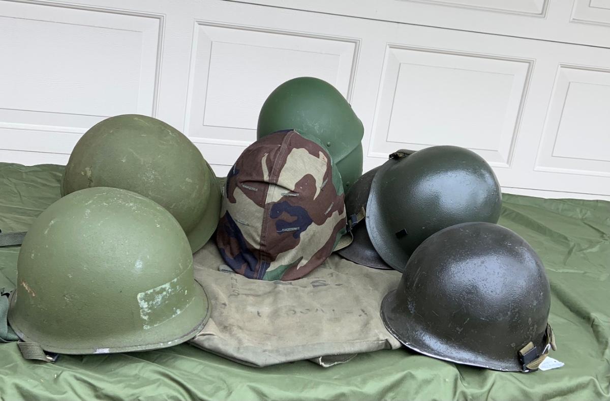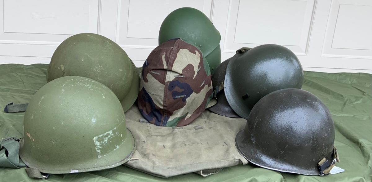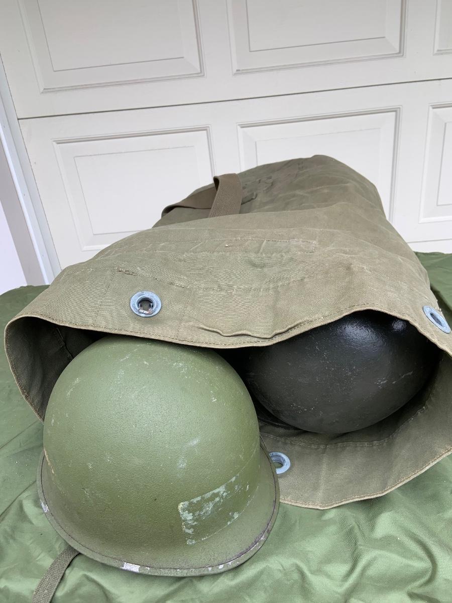 LOT:56G: Large Assortment of United State Military Helmets and liners from different branches of service and eras and duffel bag
