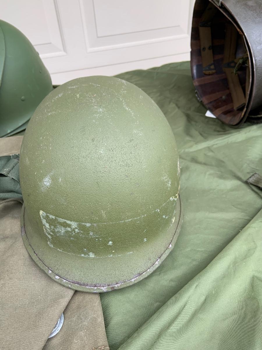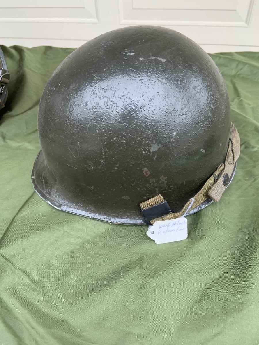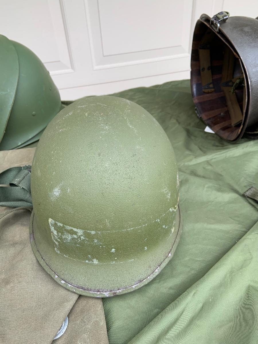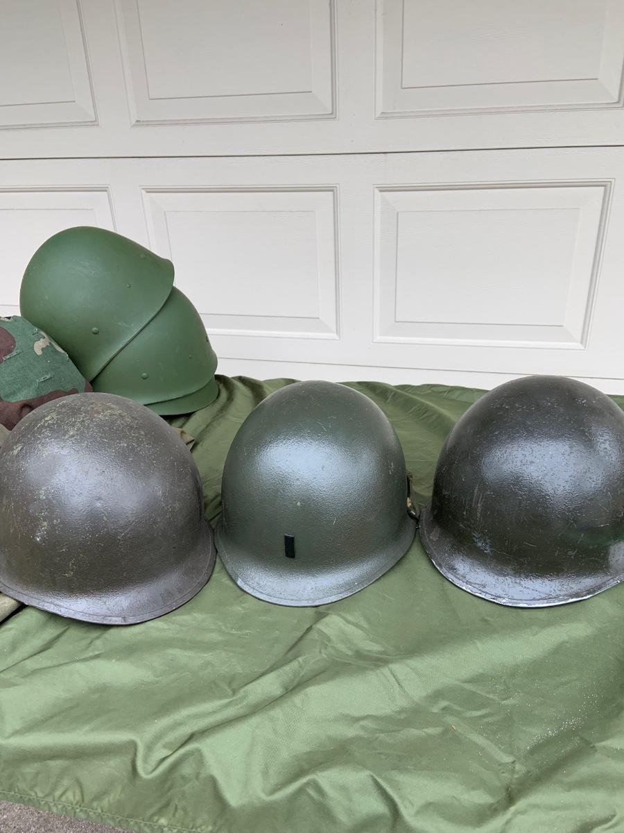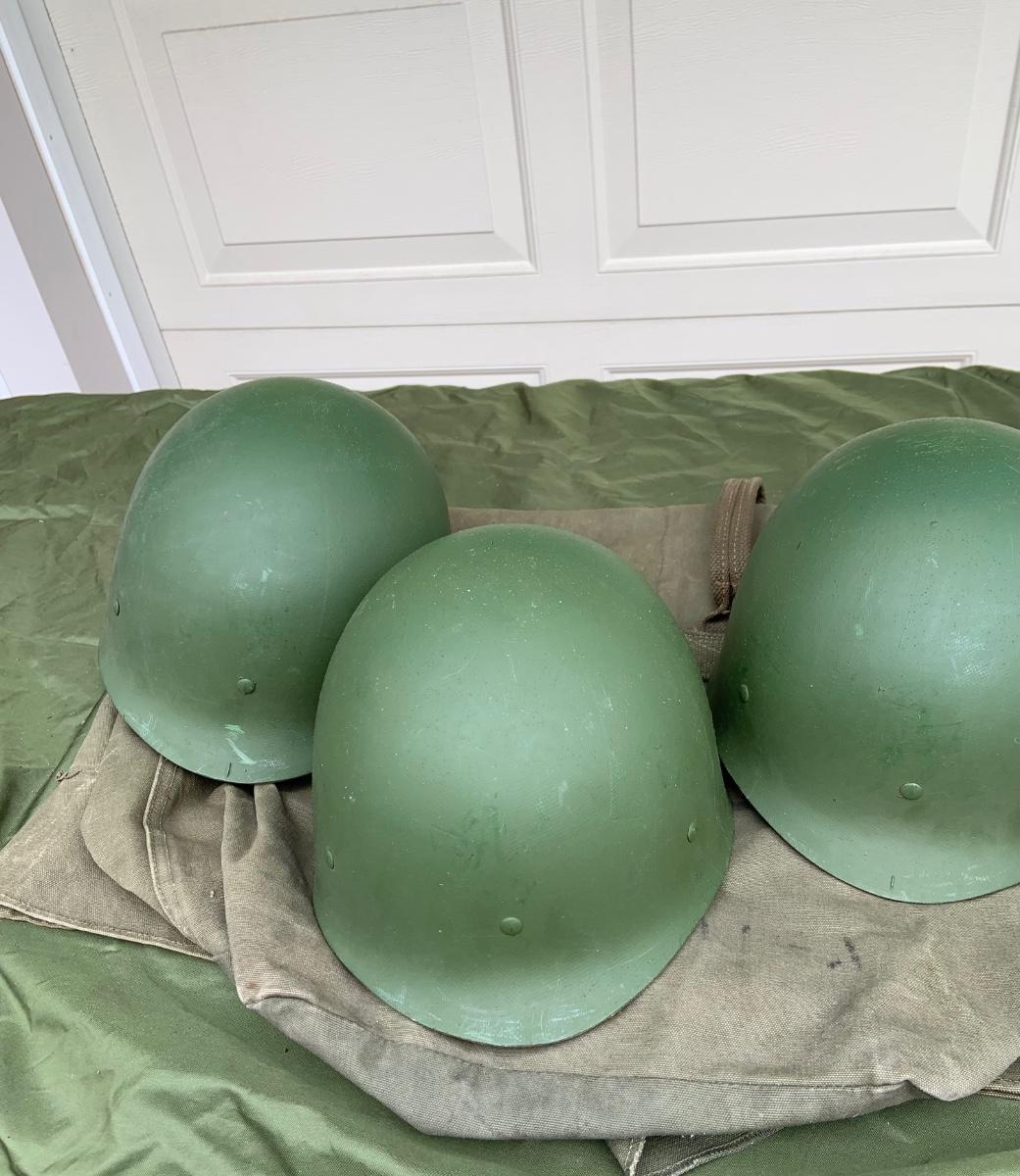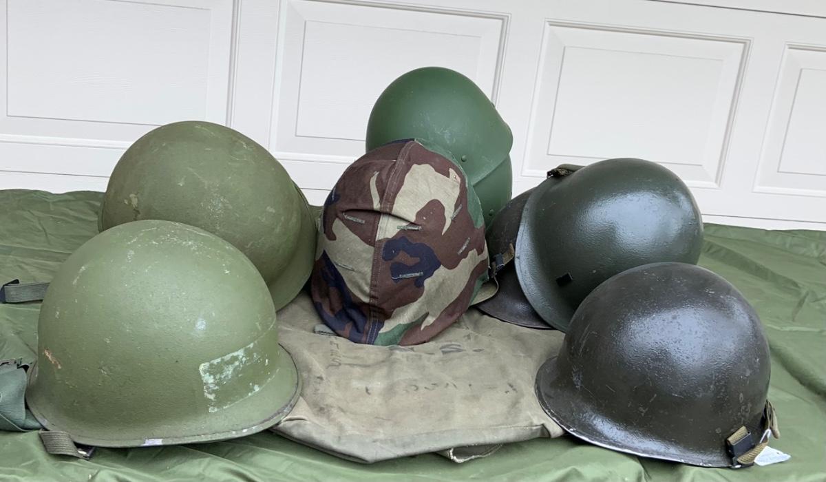 LOT:56G: Large Assortment of United State Military Helmets and liners from different branches of service and eras and duffel bag