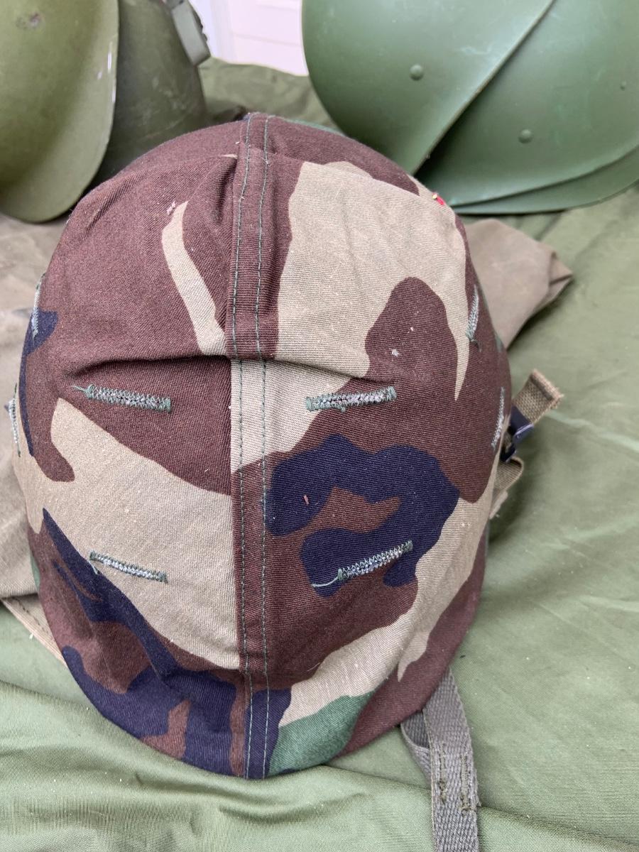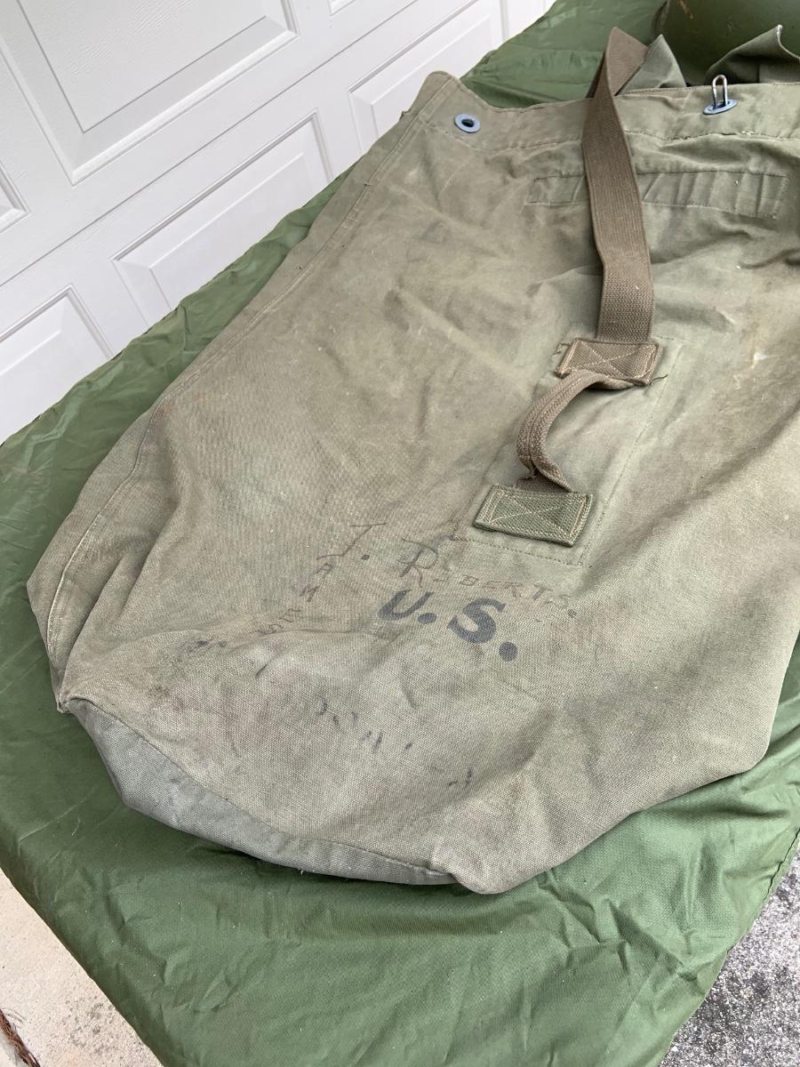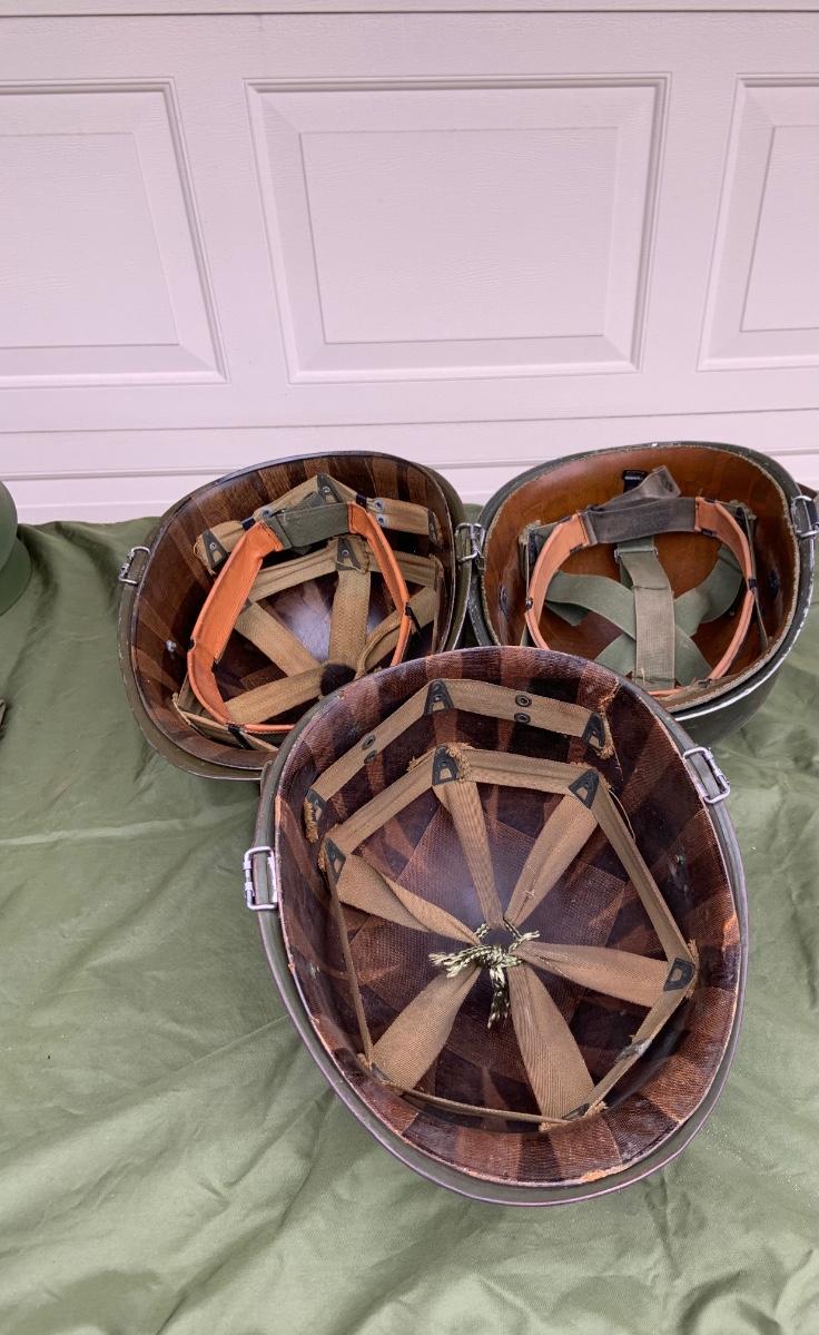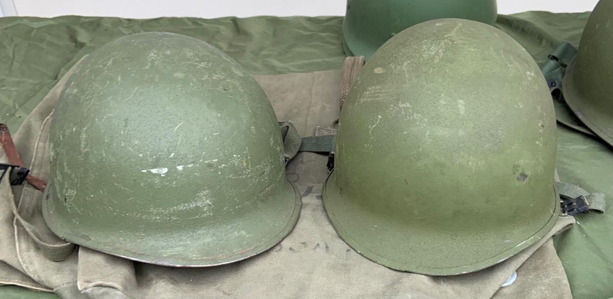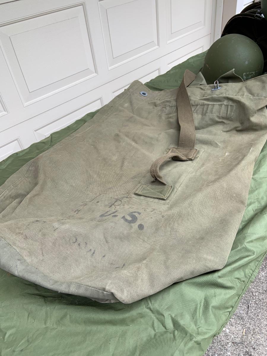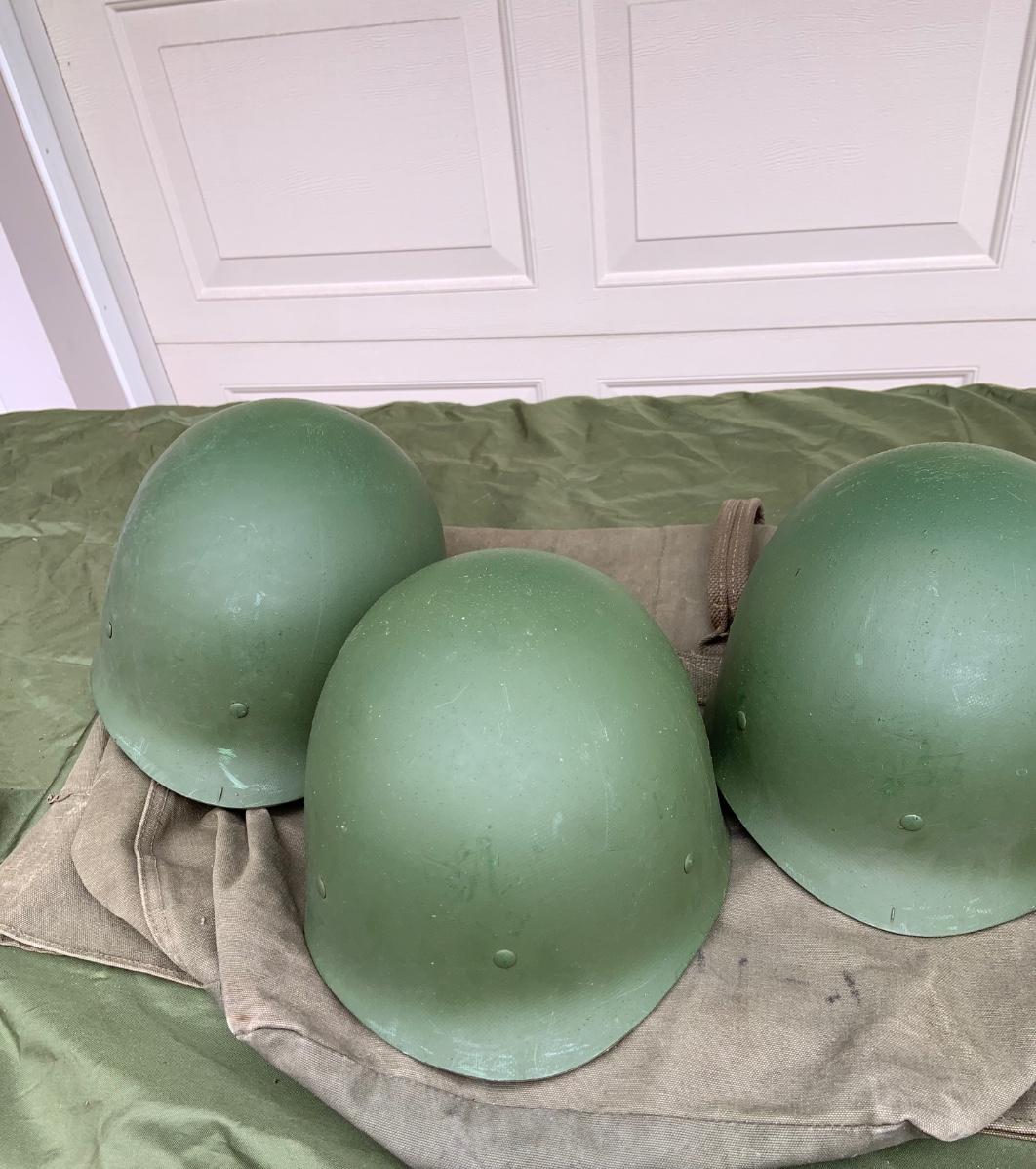 LOT:56G: Large Assortment of United State Military Helmets and liners from different branches of service and eras and duffel bag