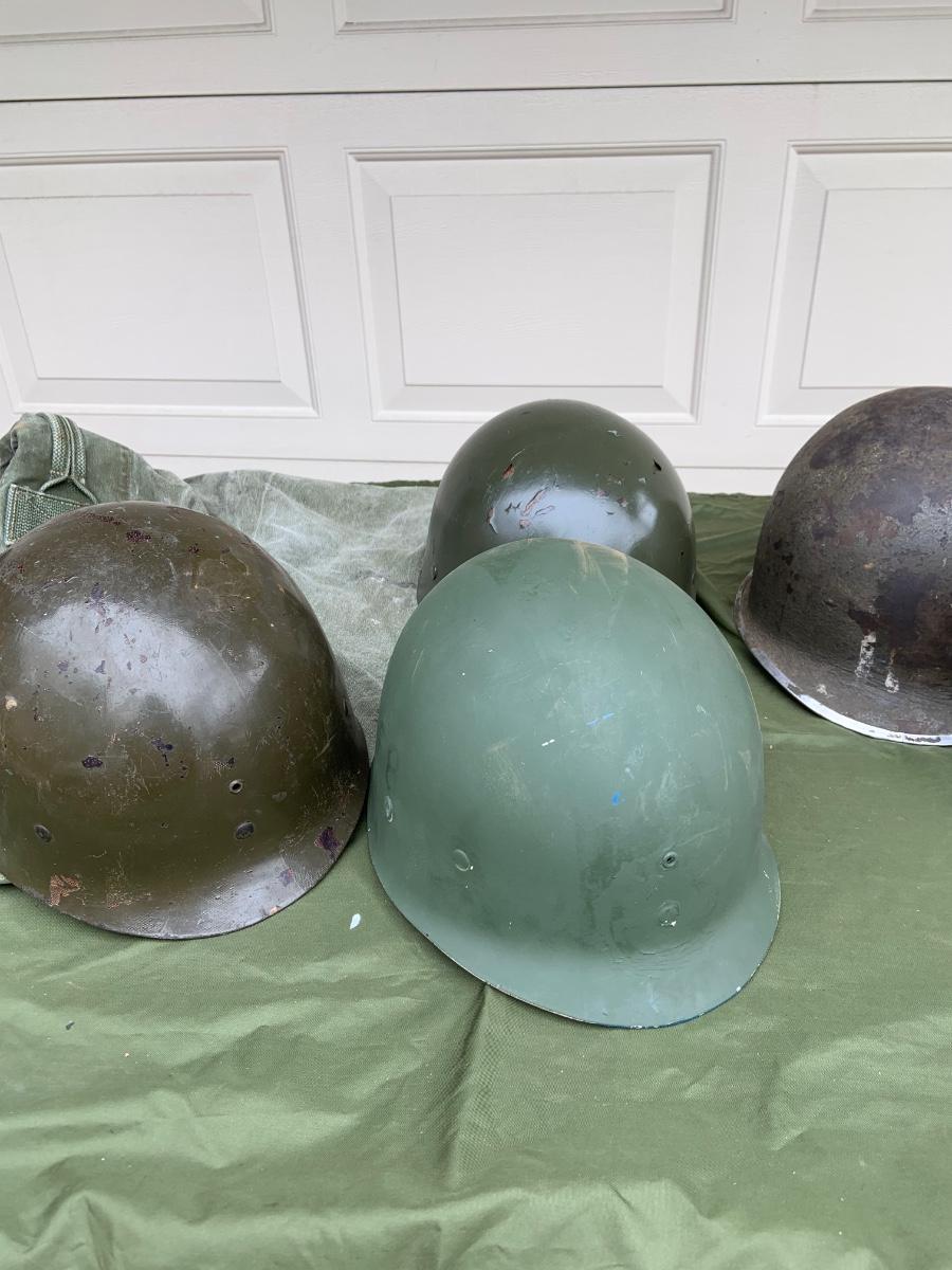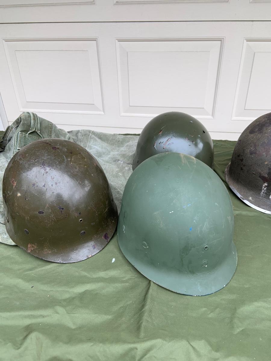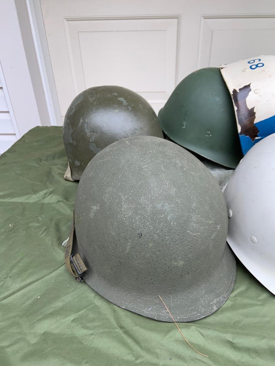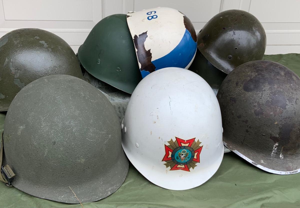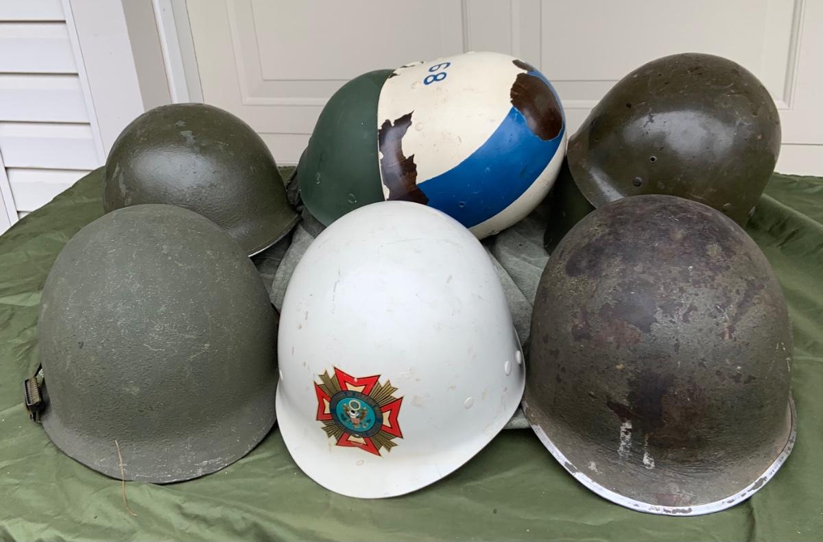 LOT:57G: Large Assortment of United State Military Helmets and liners from different branches of service and eras and duffel bag