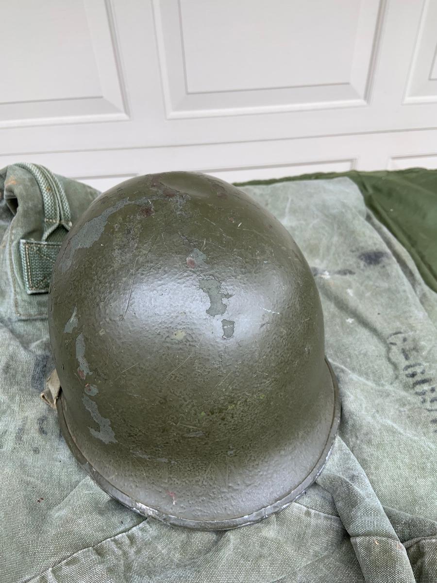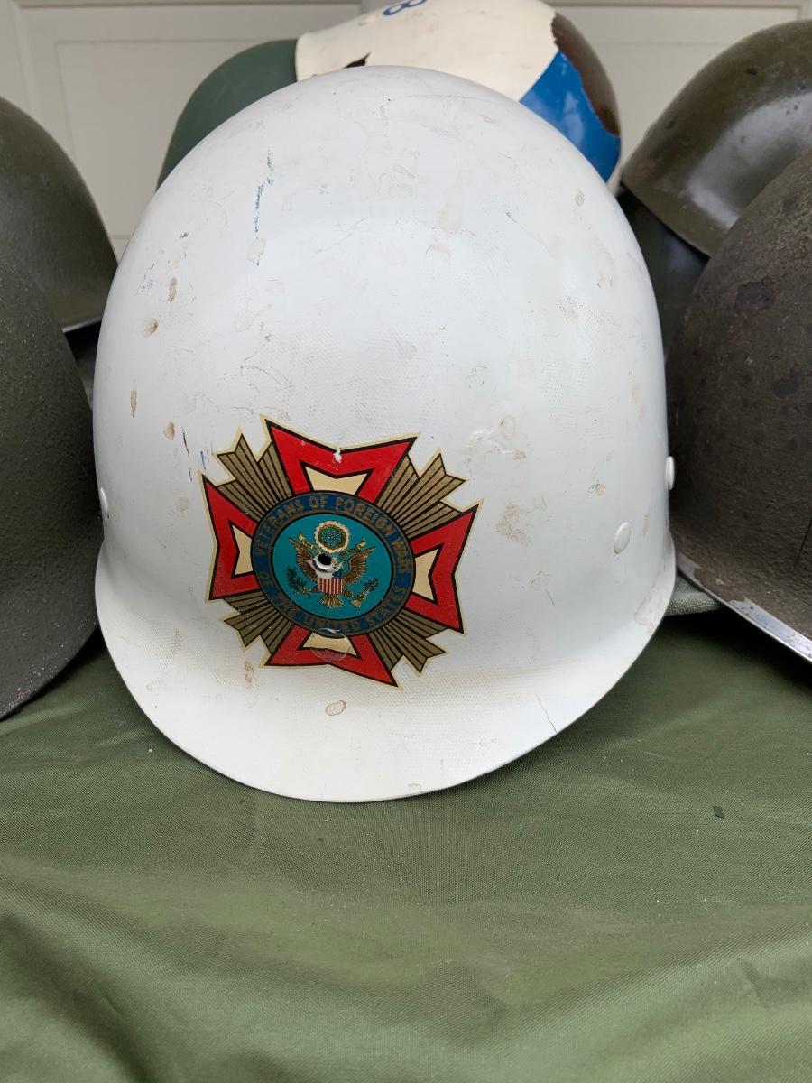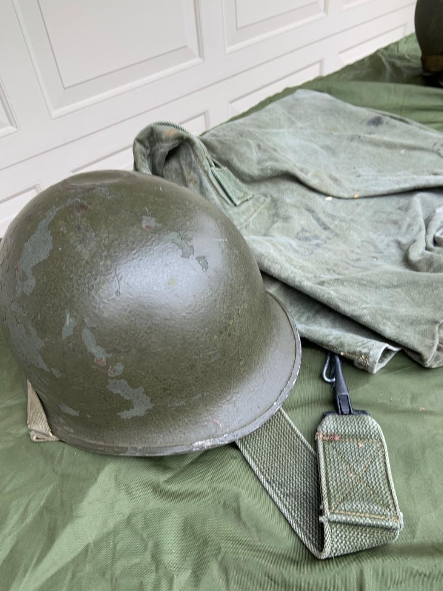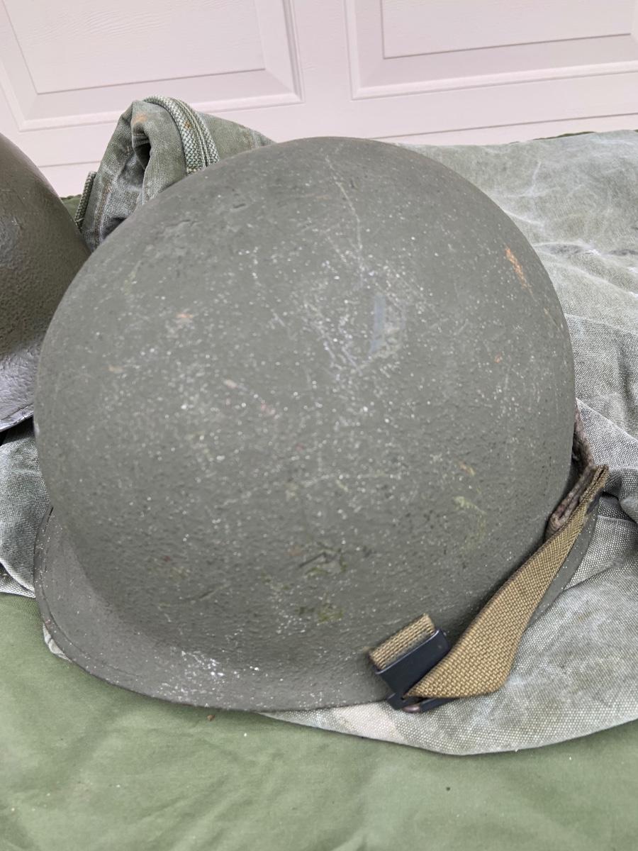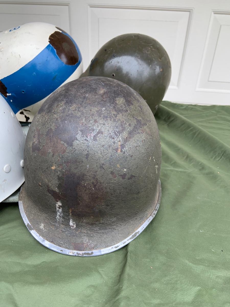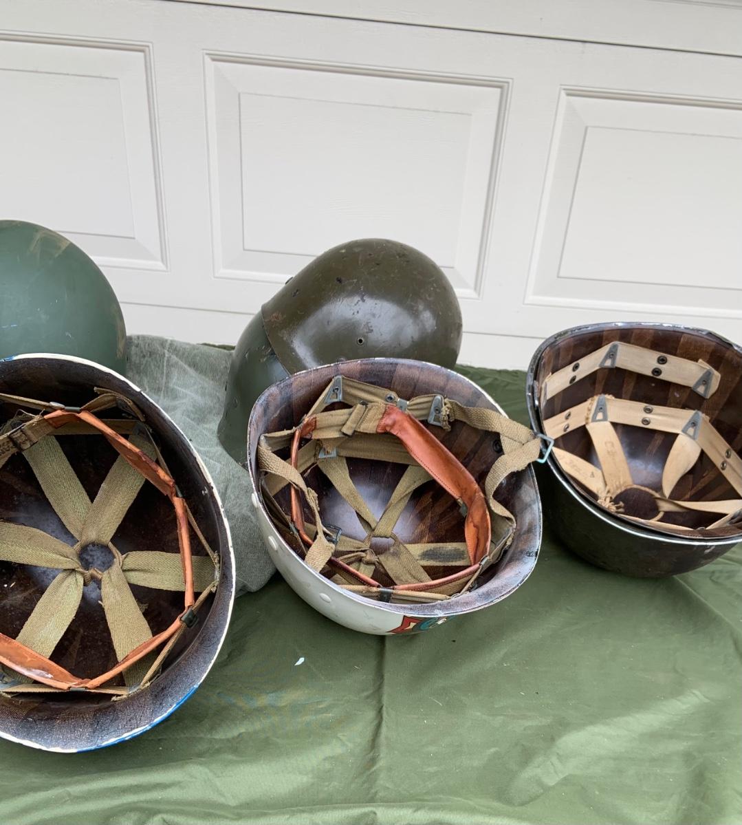 LOT:57G: Large Assortment of United State Military Helmets and liners from different branches of service and eras and duffel bag