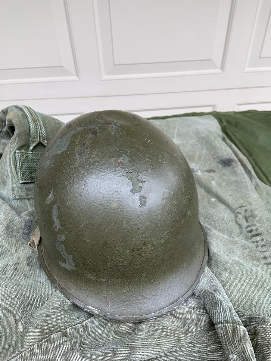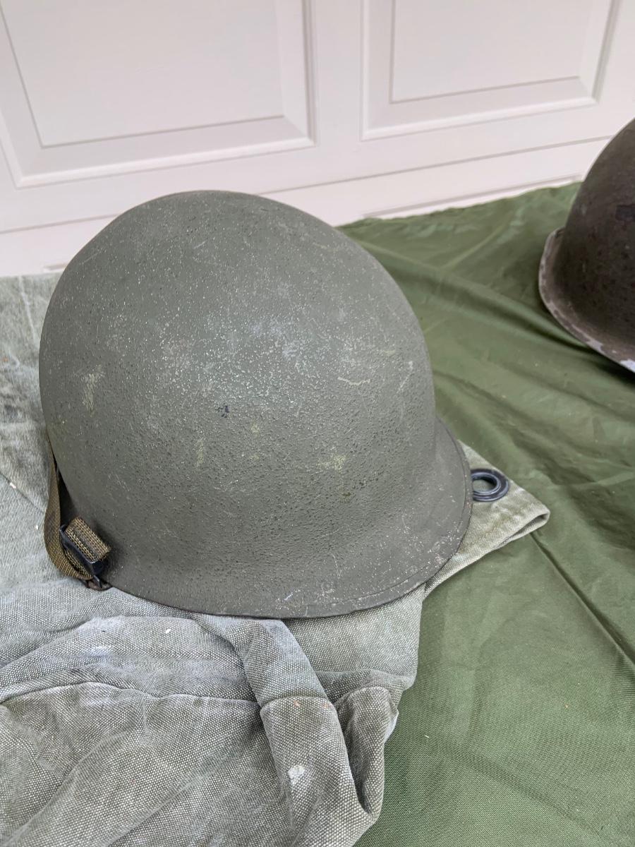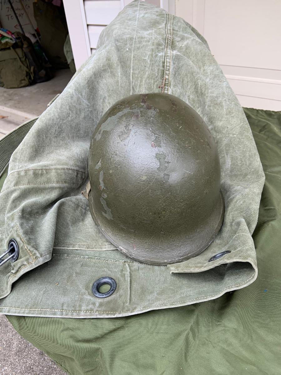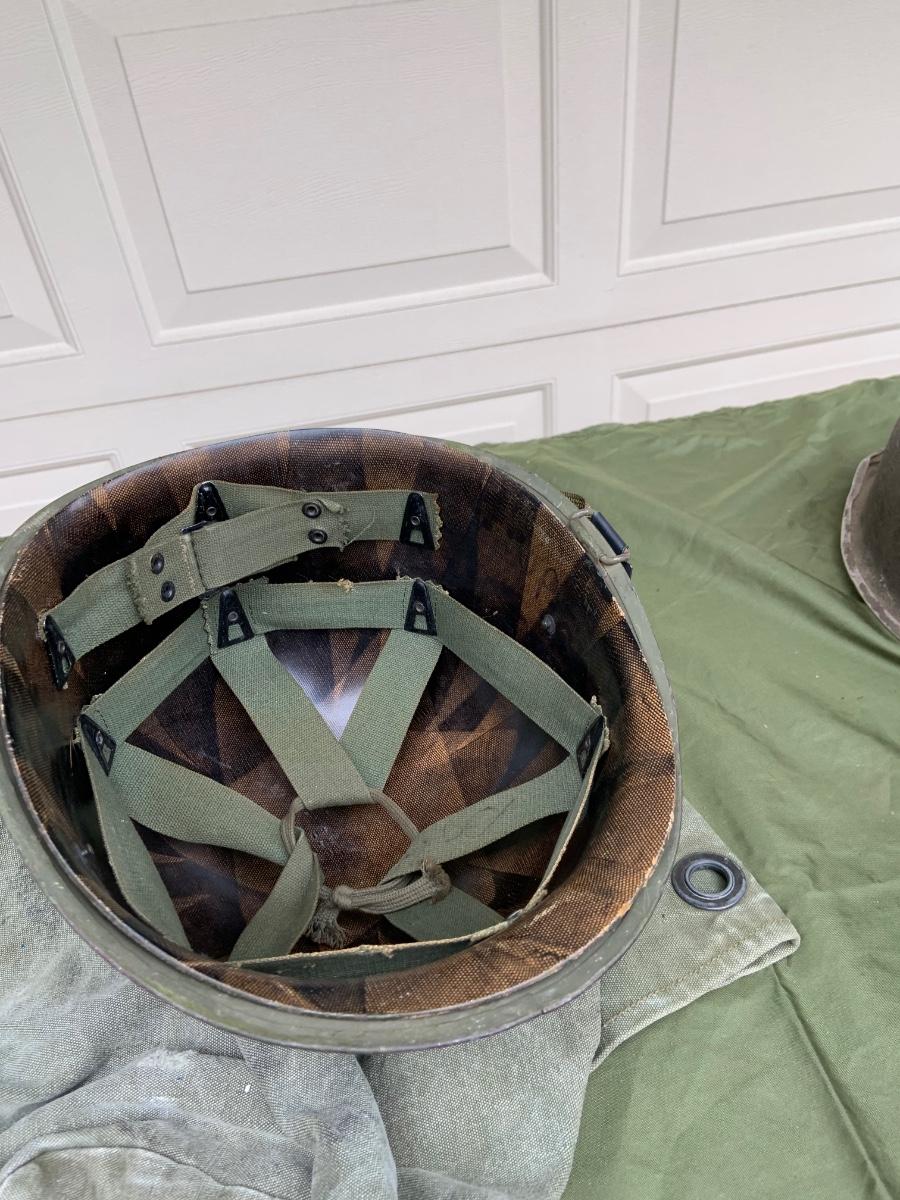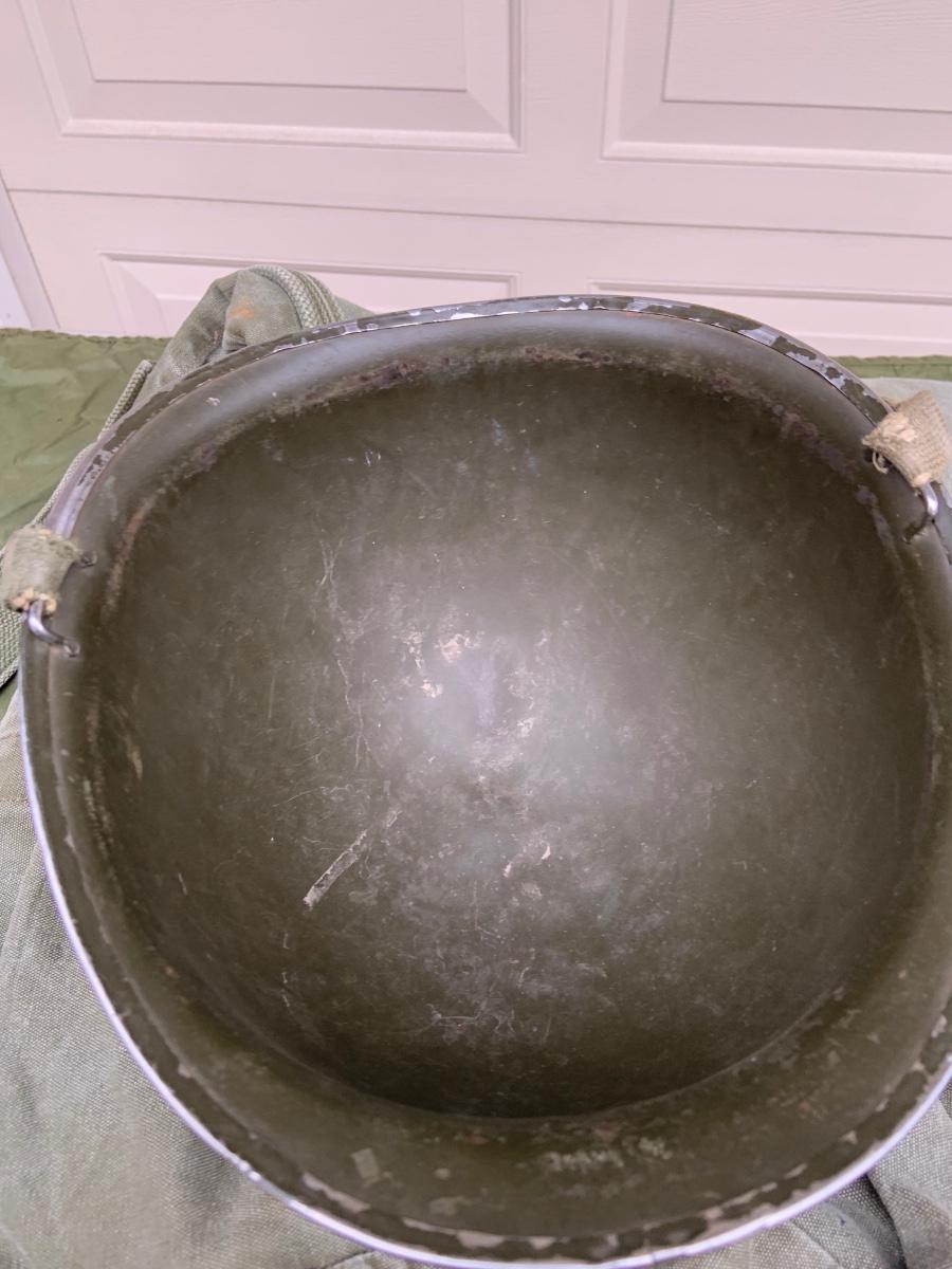 LOT:57G: Large Assortment of United State Military Helmets and liners from different branches of service and eras and duffel bag