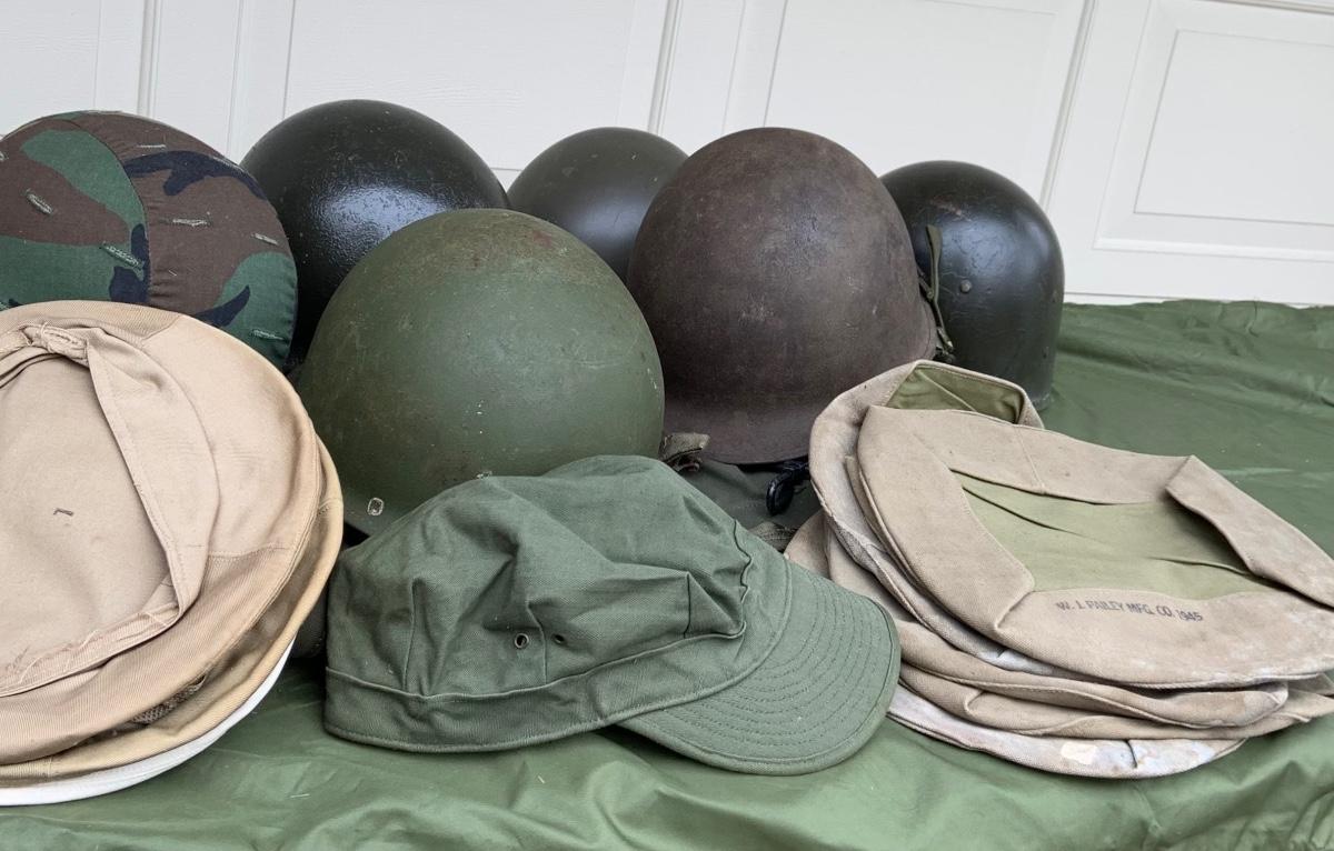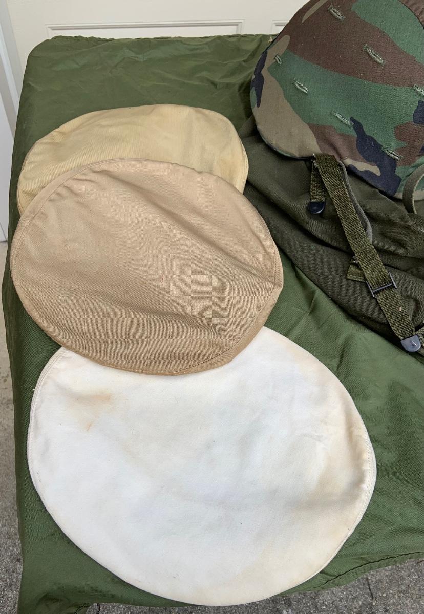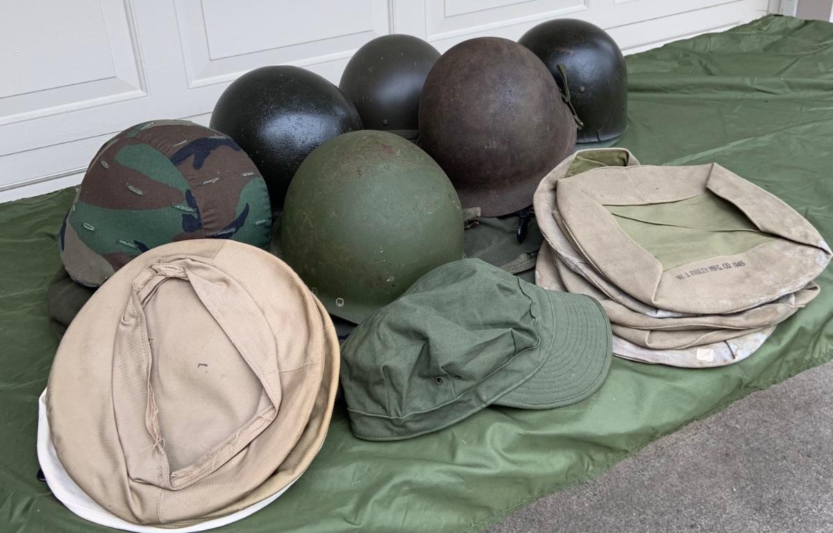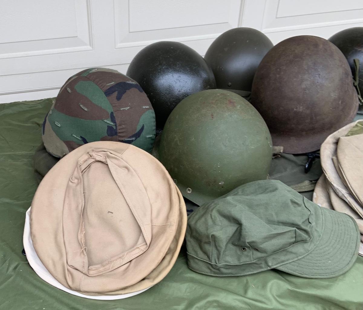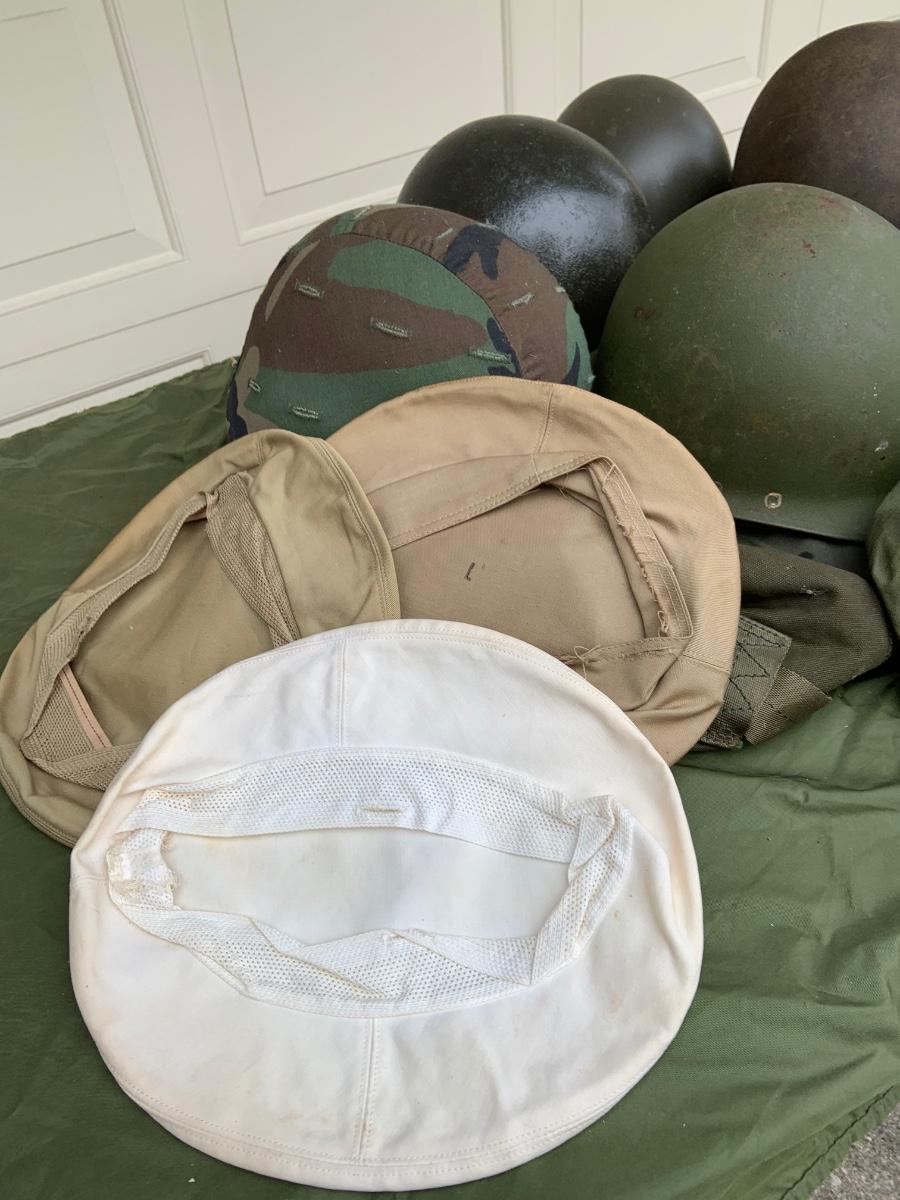 LOT:58G: Assortment of United State Military Helmets and liners, peak hat covers and canvas field wash basins from different branches of service and eras, cap and a duffel bag
