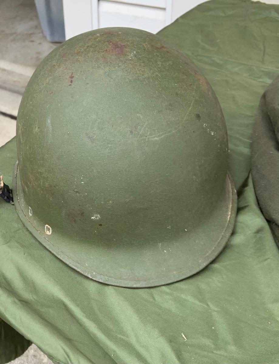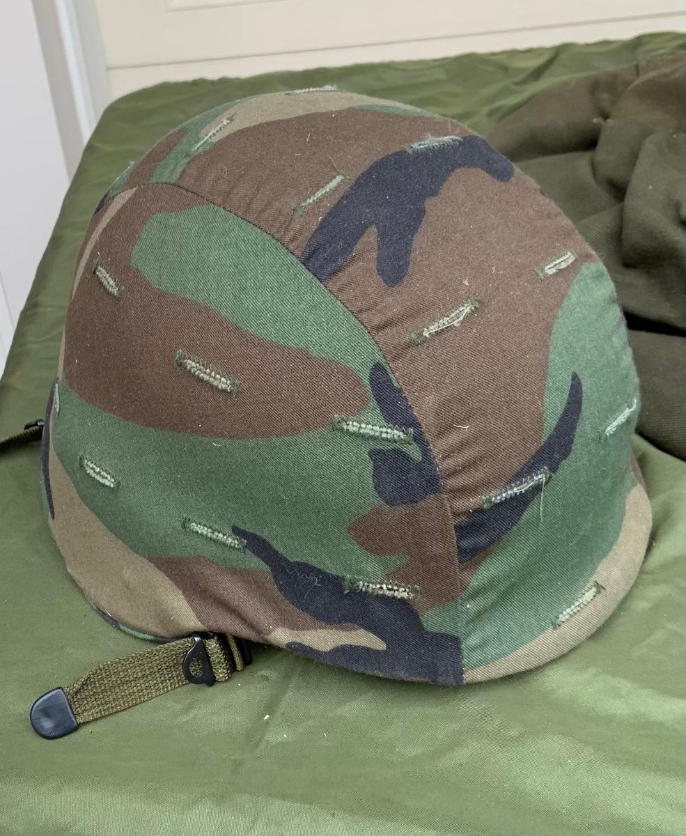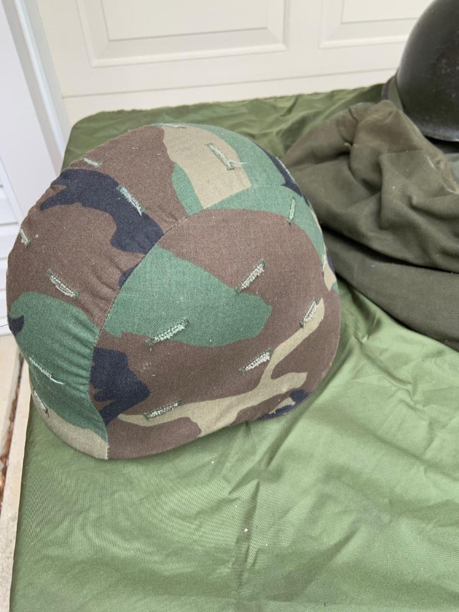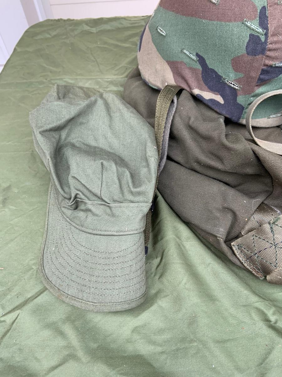 LOT:58G: Assortment of United State Military Helmets and liners, peak hat covers and canvas field wash basins from different branches of service and eras, cap and a duffel bag