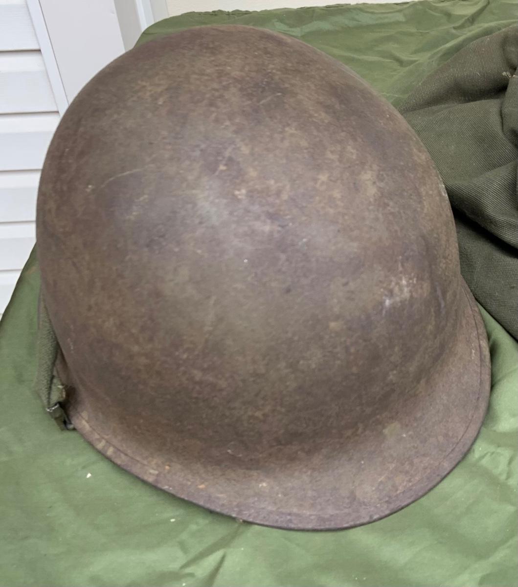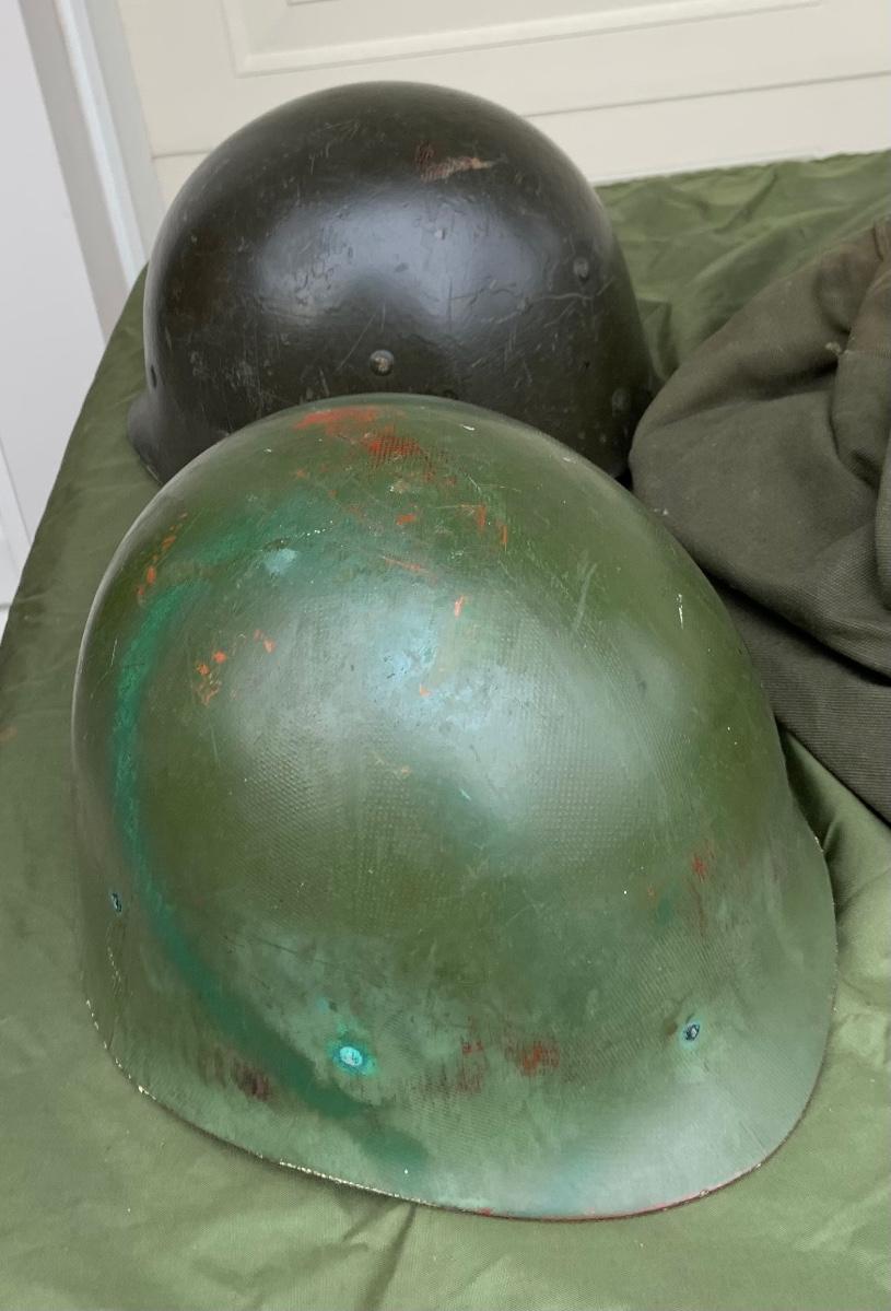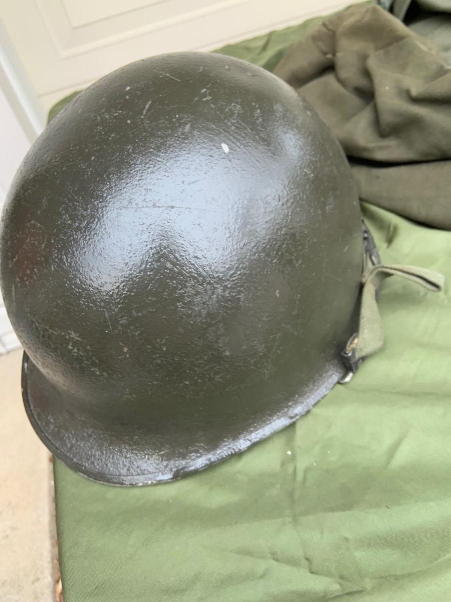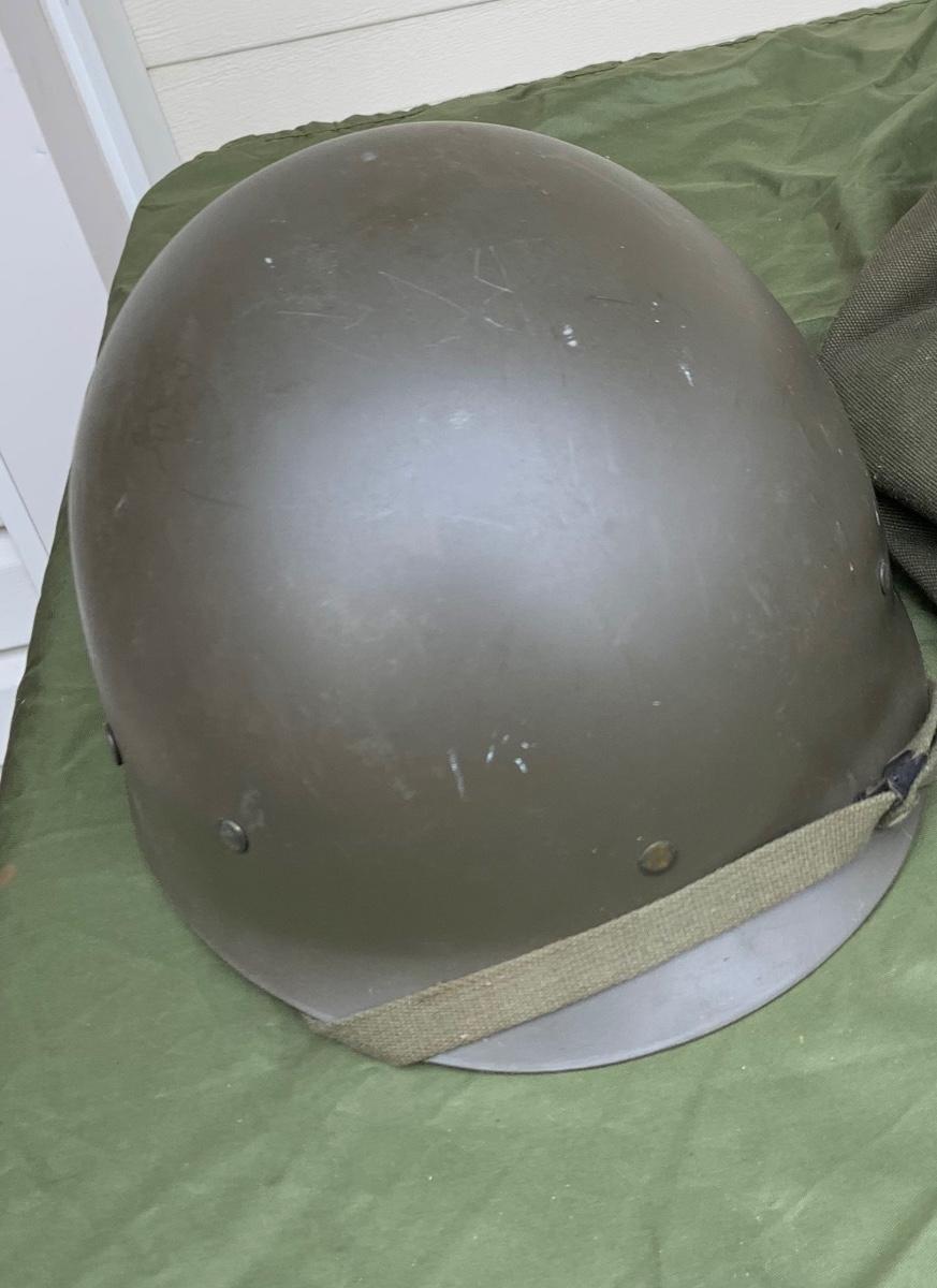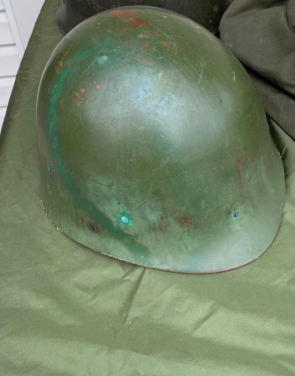 LOT:58G: Assortment of United State Military Helmets and liners, peak hat covers and canvas field wash basins from different branches of service and eras, cap and a duffel bag