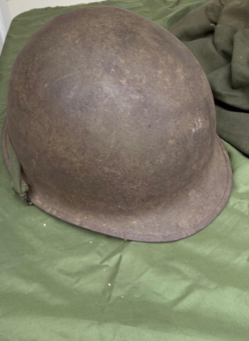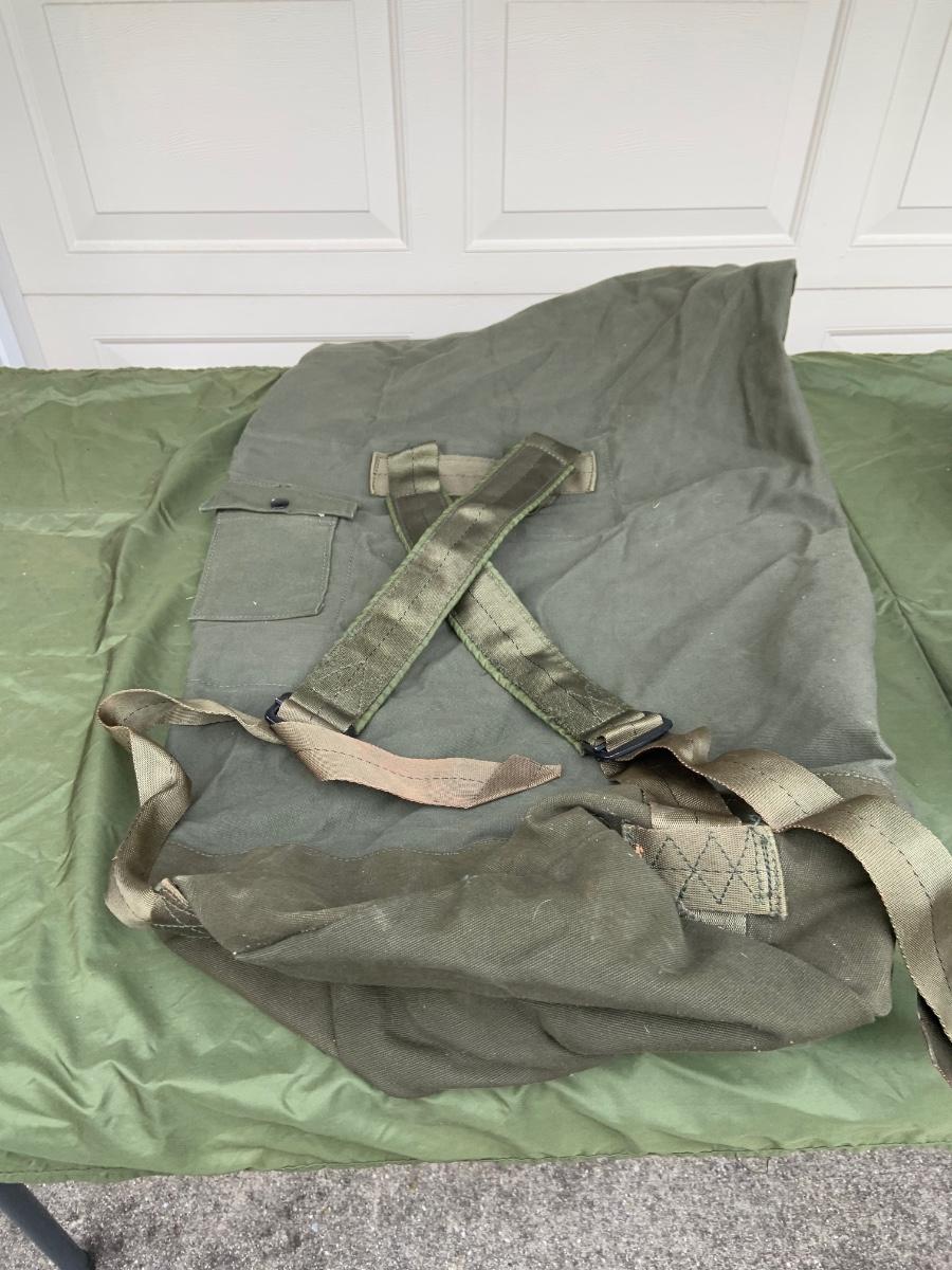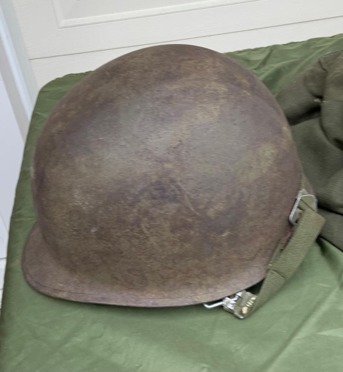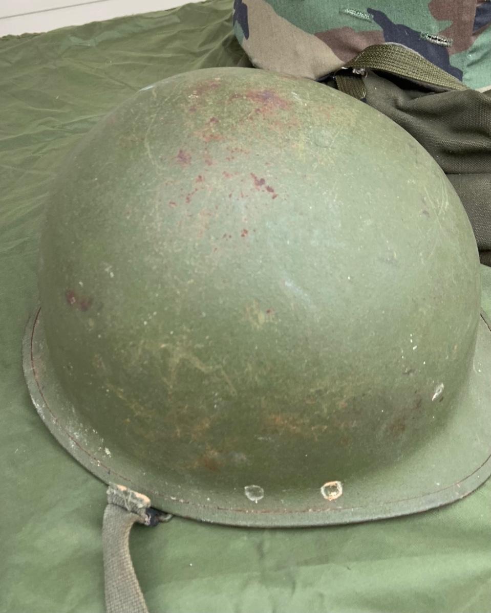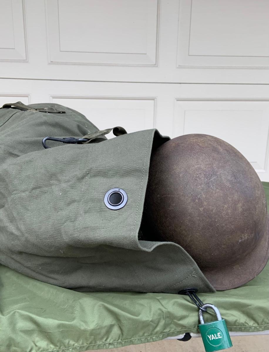 LOT:58G: Assortment of United State Military Helmets and liners, peak hat covers  and canvas field wash basins from different branches of service and eras, cap and a duffel bag