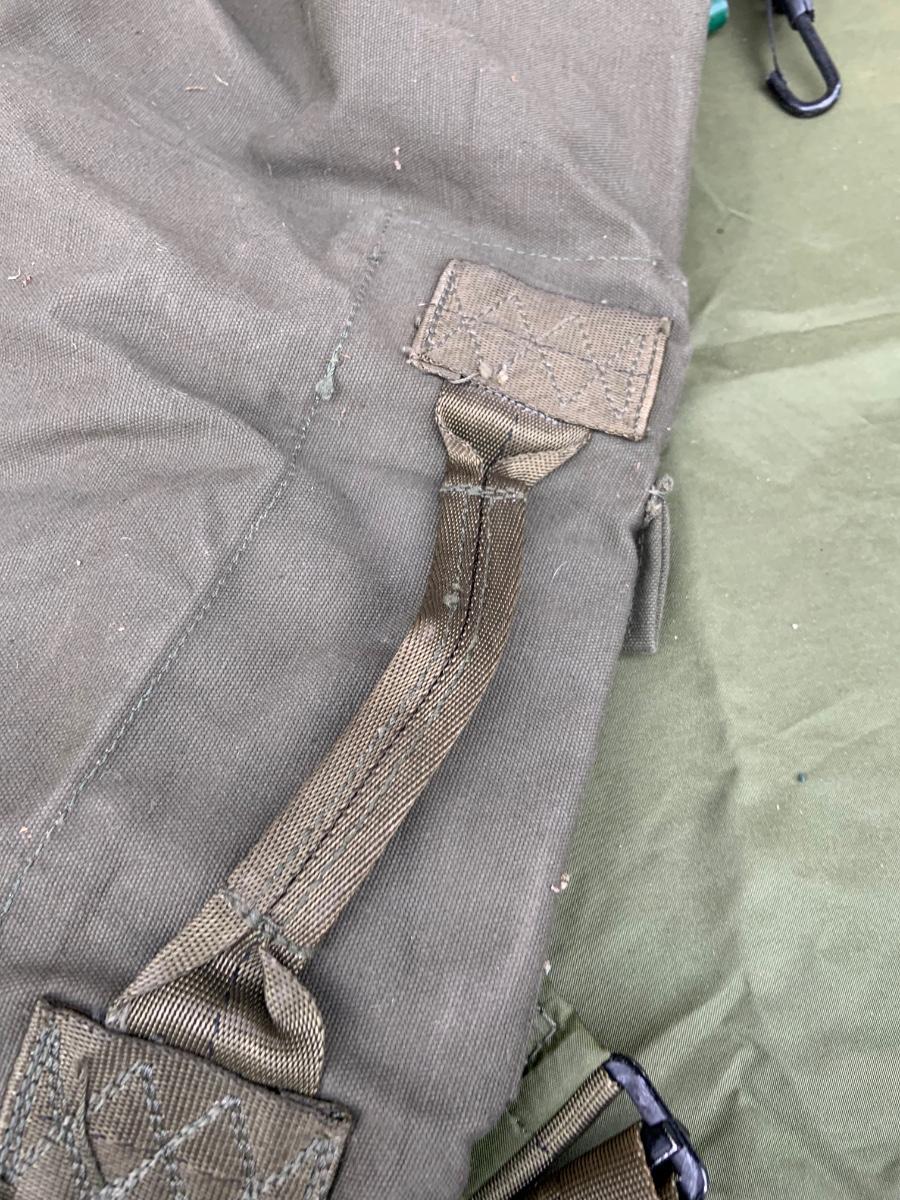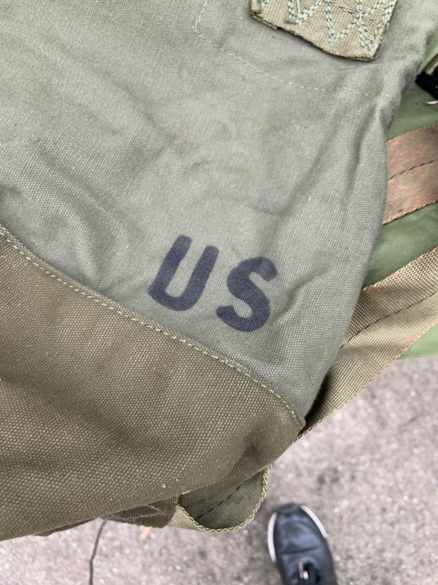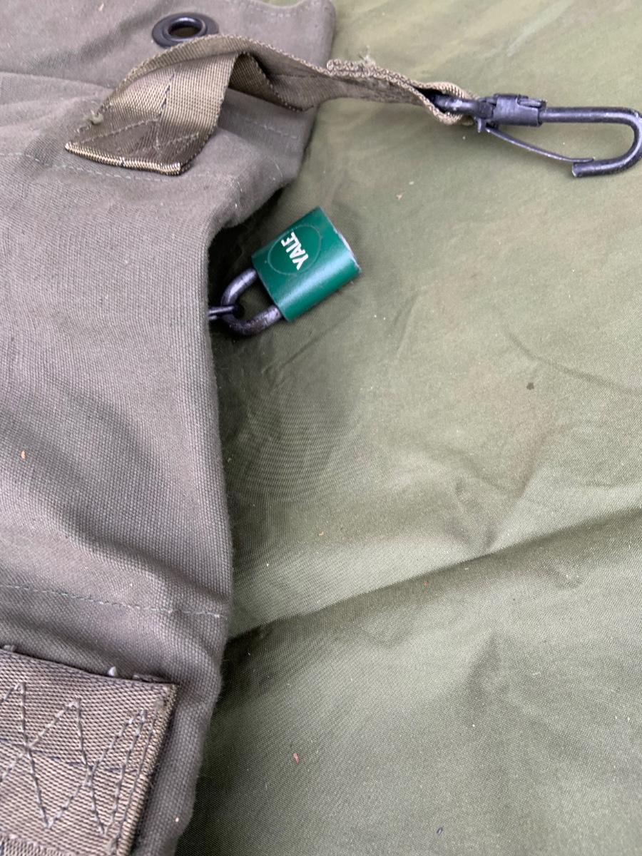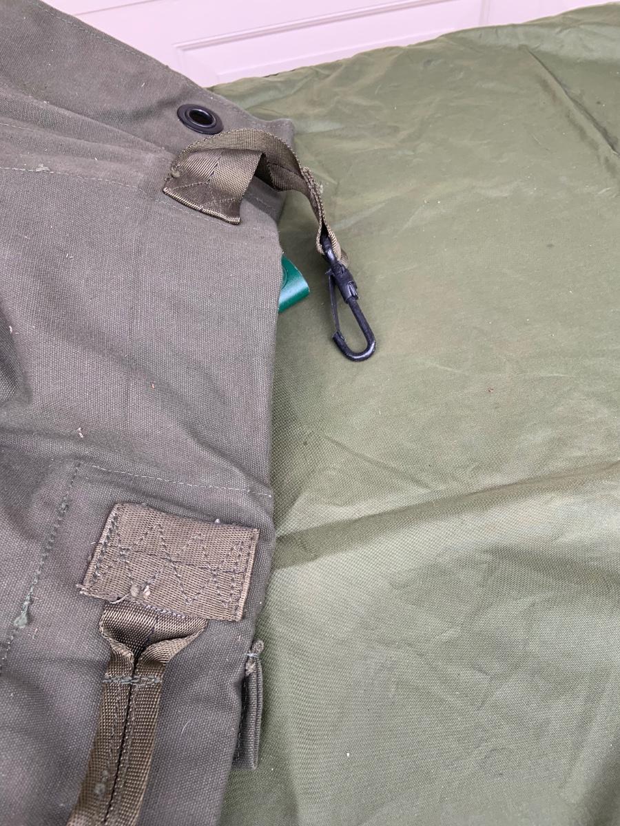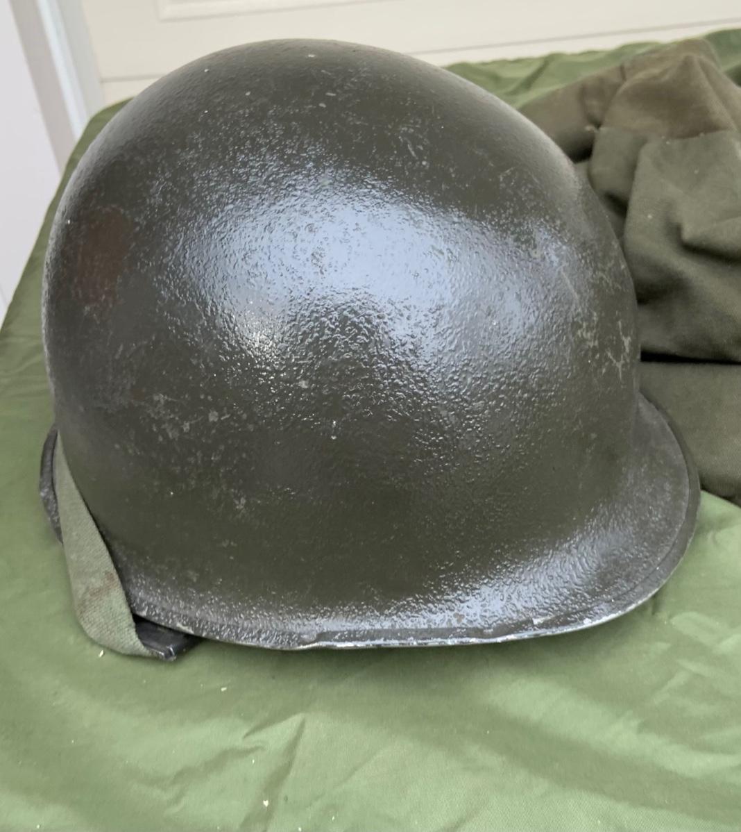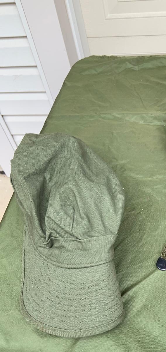 LOT:58G: Assortment of United State Military Helmets and liners, peak hat covers  and canvas field wash basins from different branches of service and eras, cap and a duffel bag