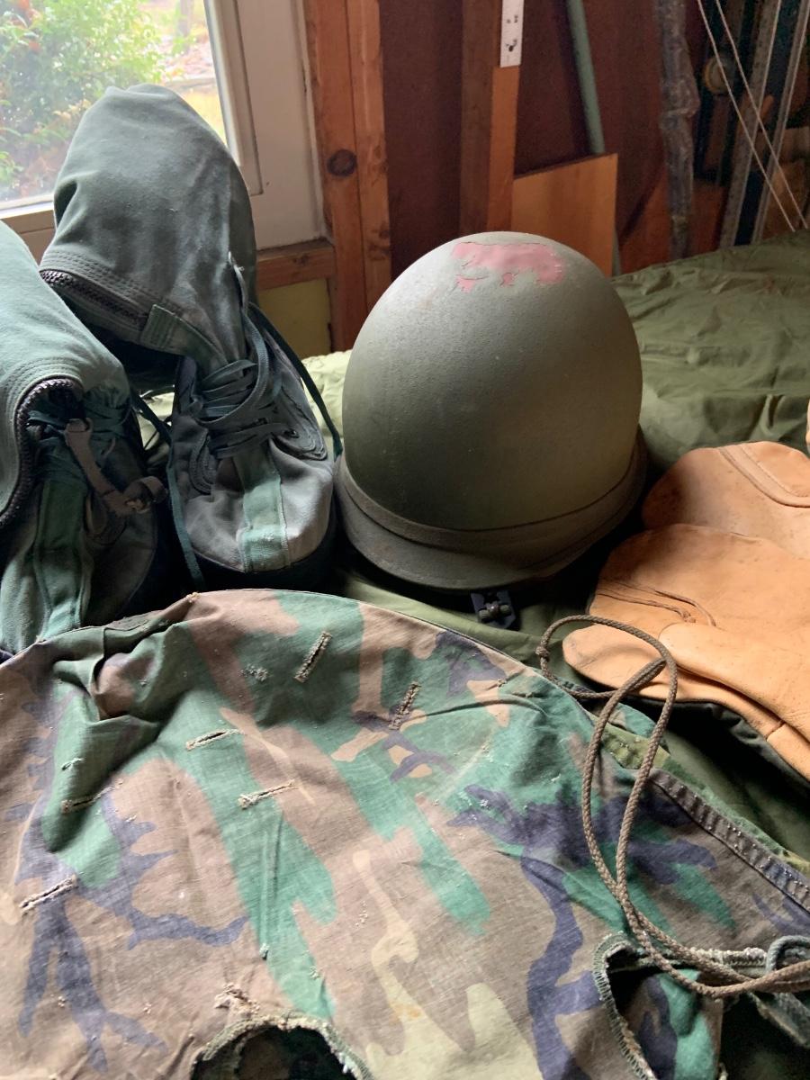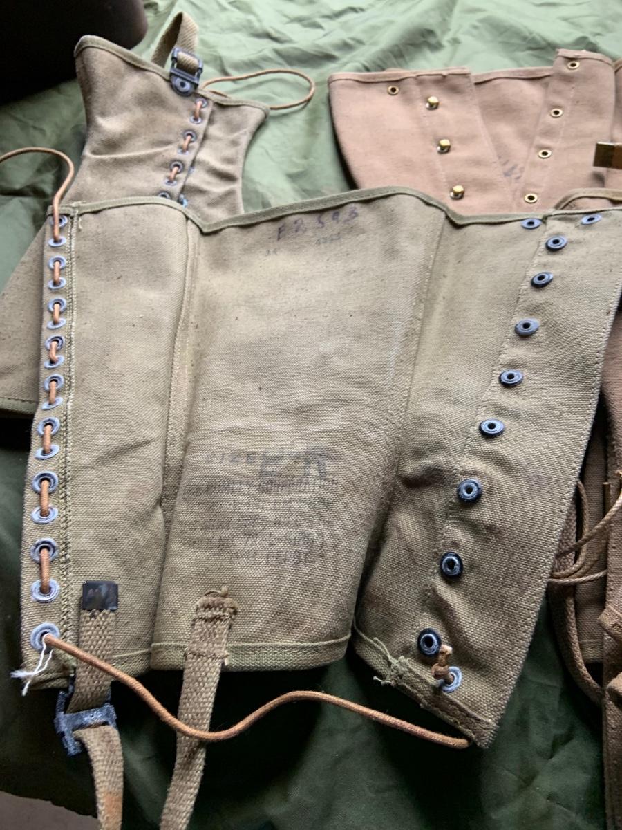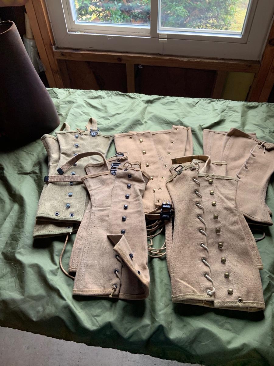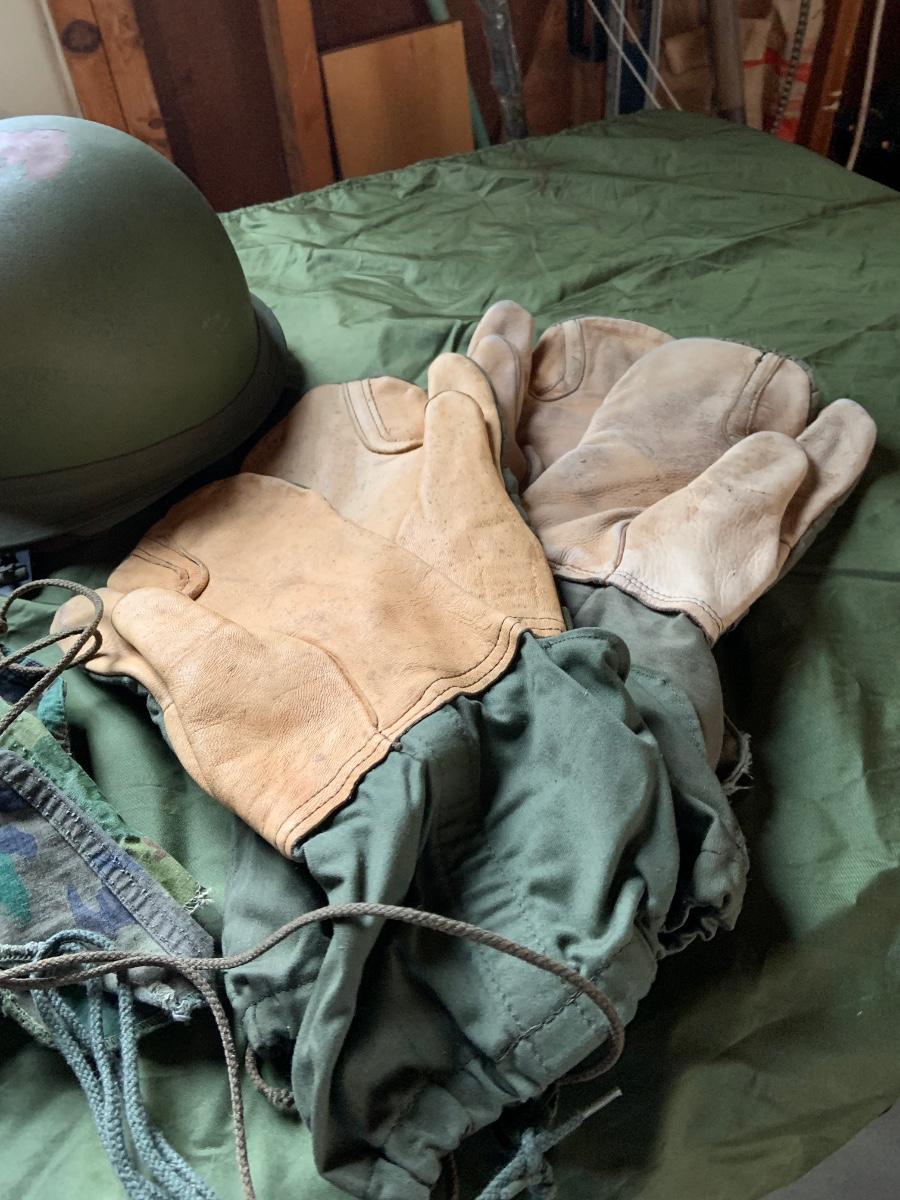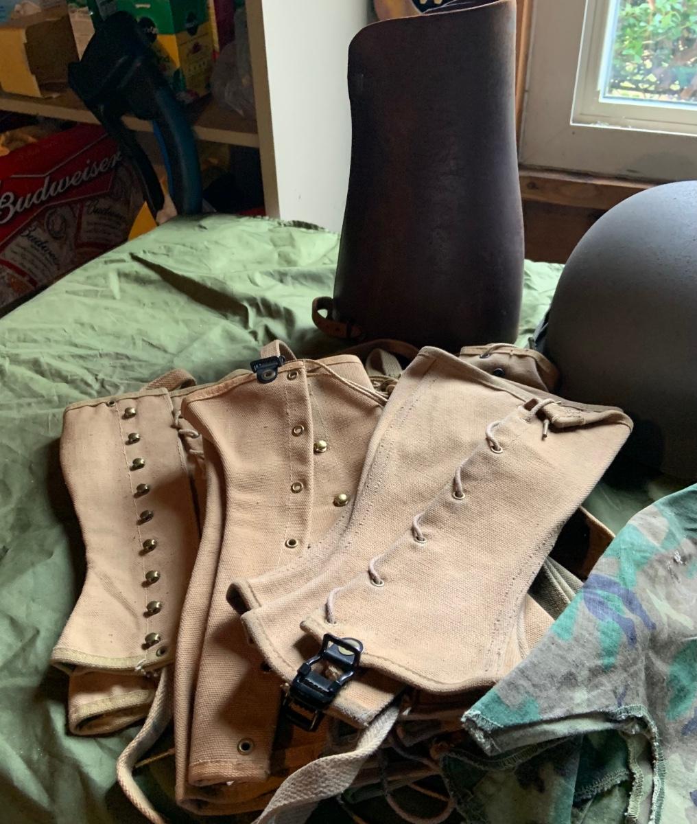 LOT:60G: Large assortment of US Military Garments including Helmets Helmet Covers, Boots, Gloves and canvas and leather Gaiters