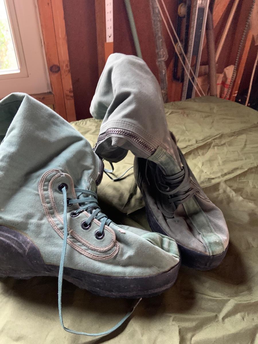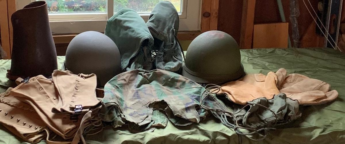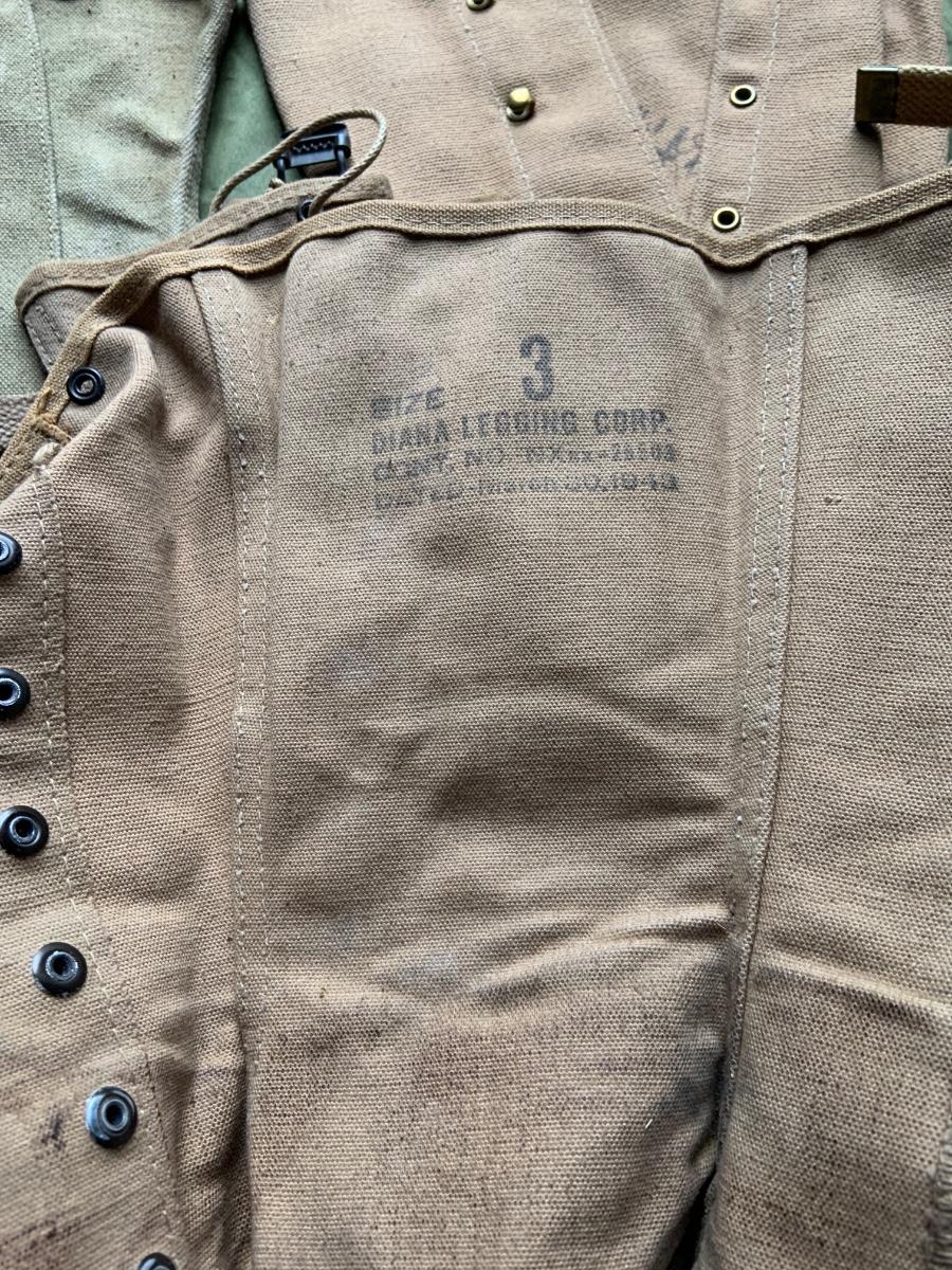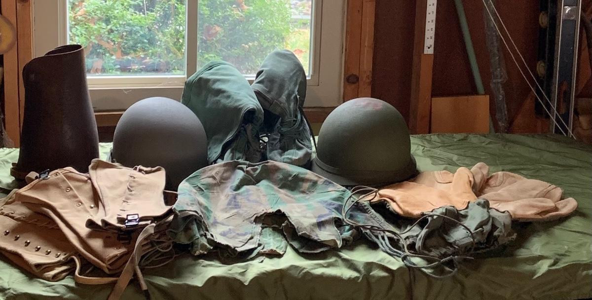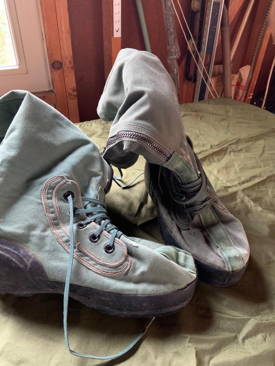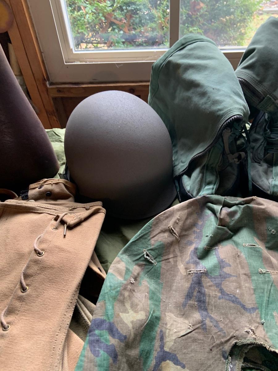 LOT:60G: Large assortment of US Military Garments including Helmets Helmet Covers, Boots, Gloves and canvas and leather Gaiters