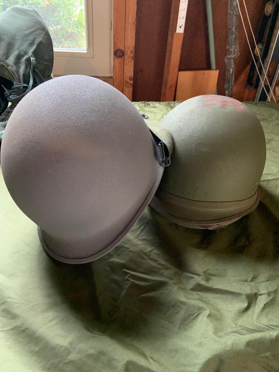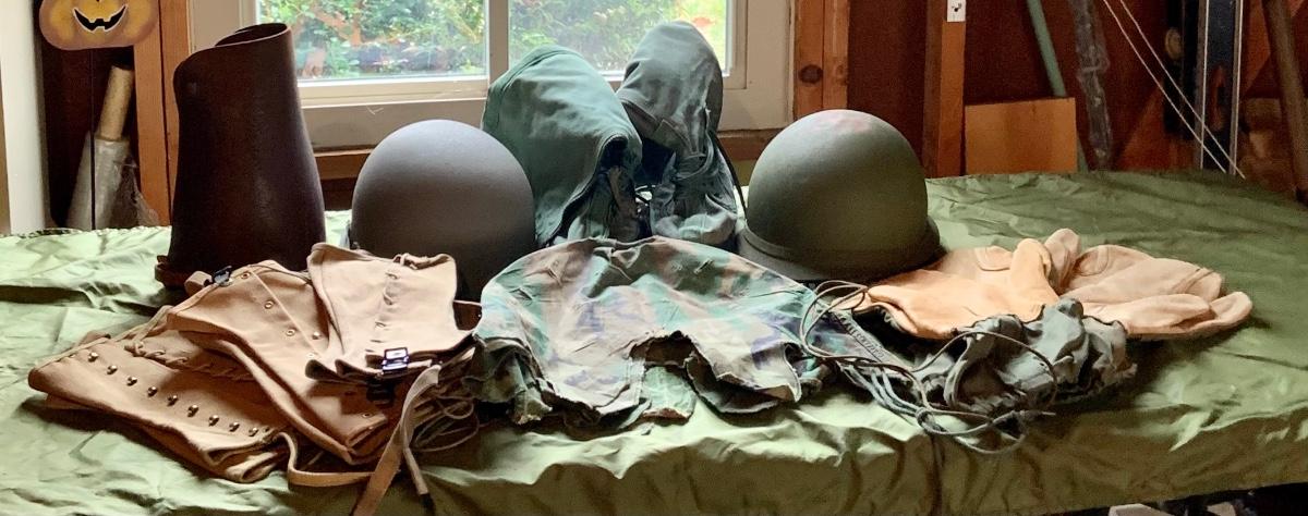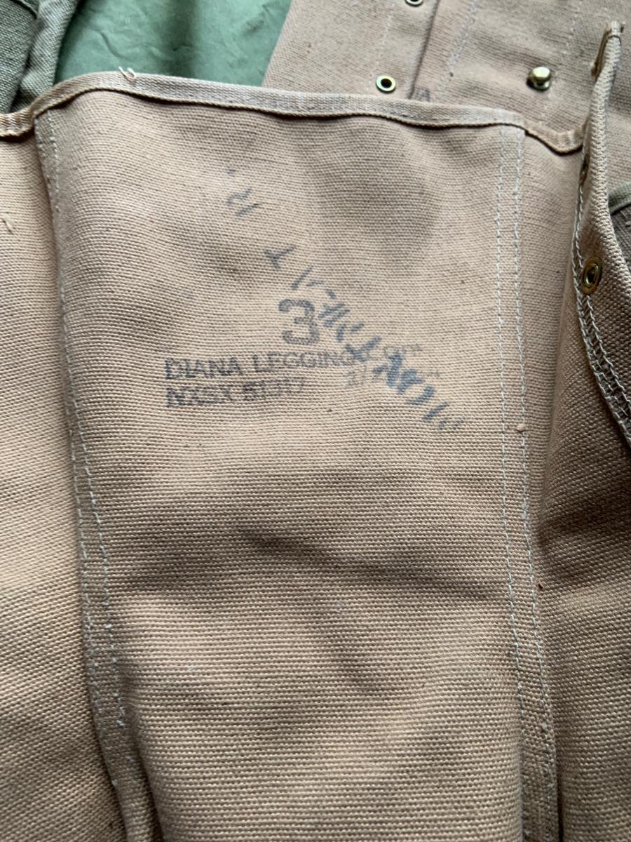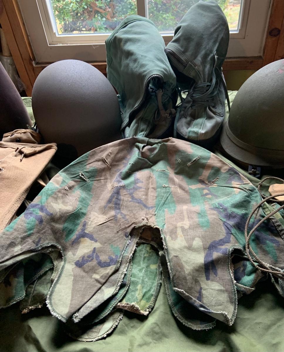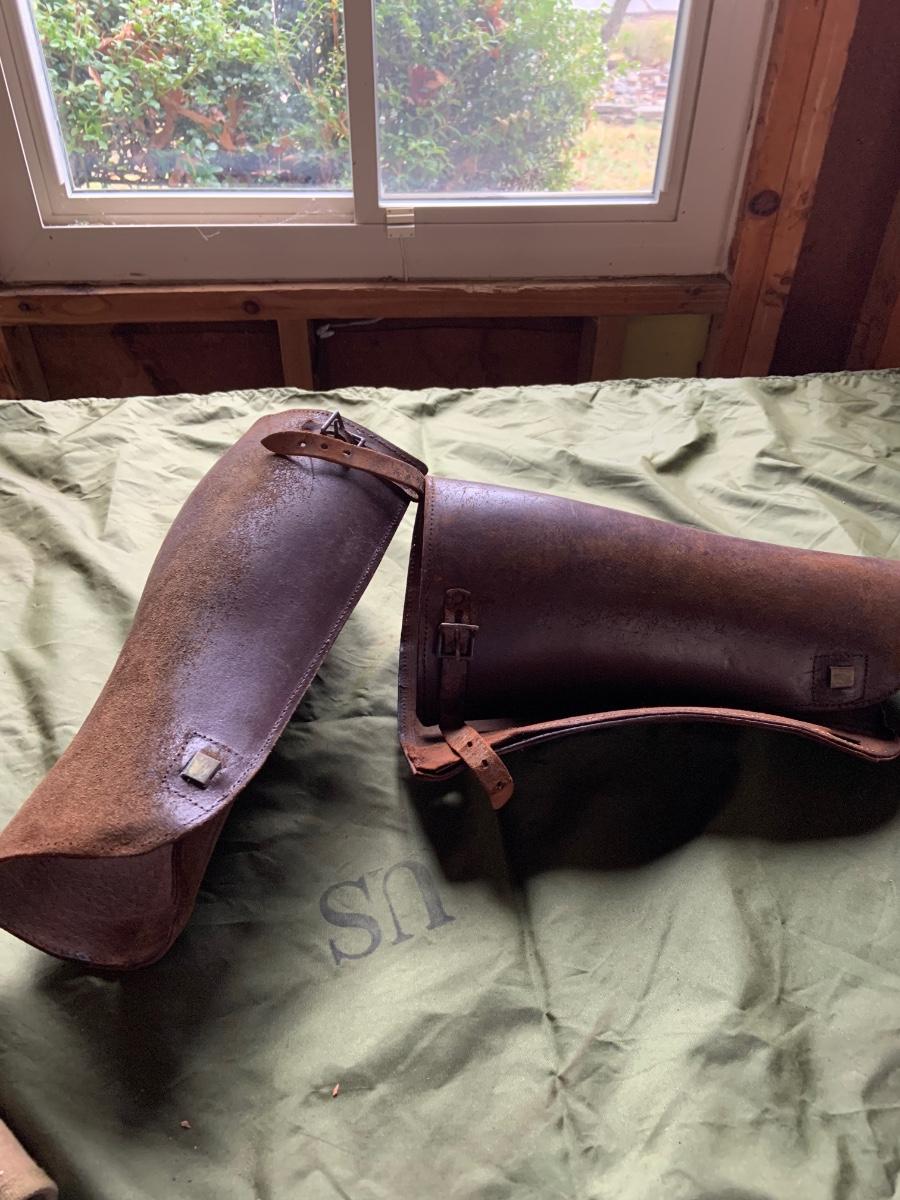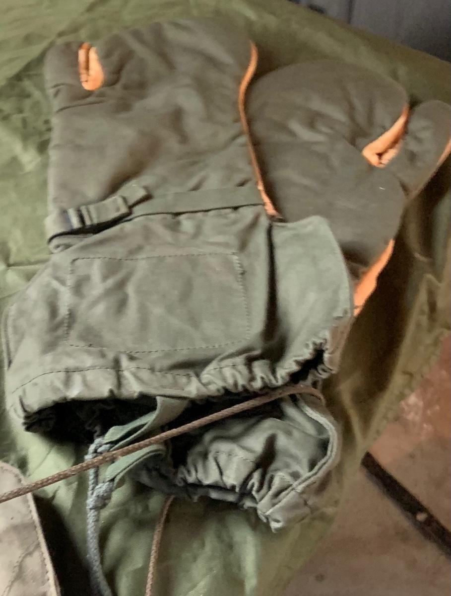 LOT:60G: Large assortment of US Military Garments including Helmets Helmet Covers, Boots, Gloves and canvas and leather Gaiters