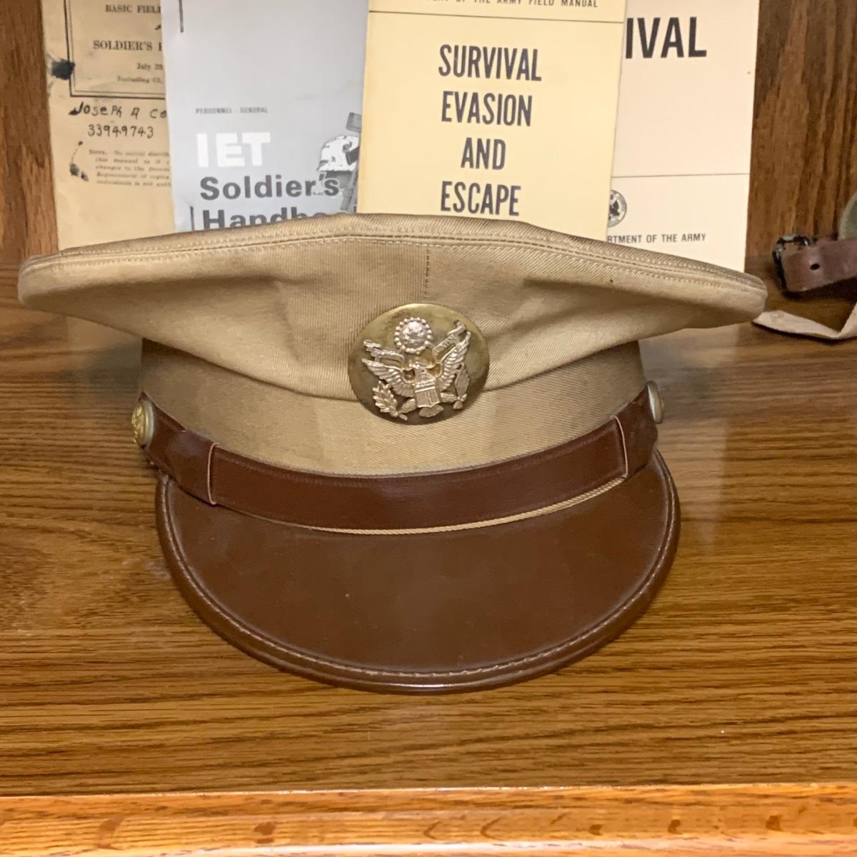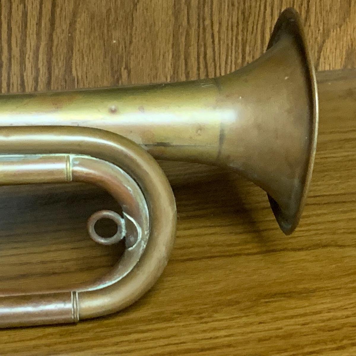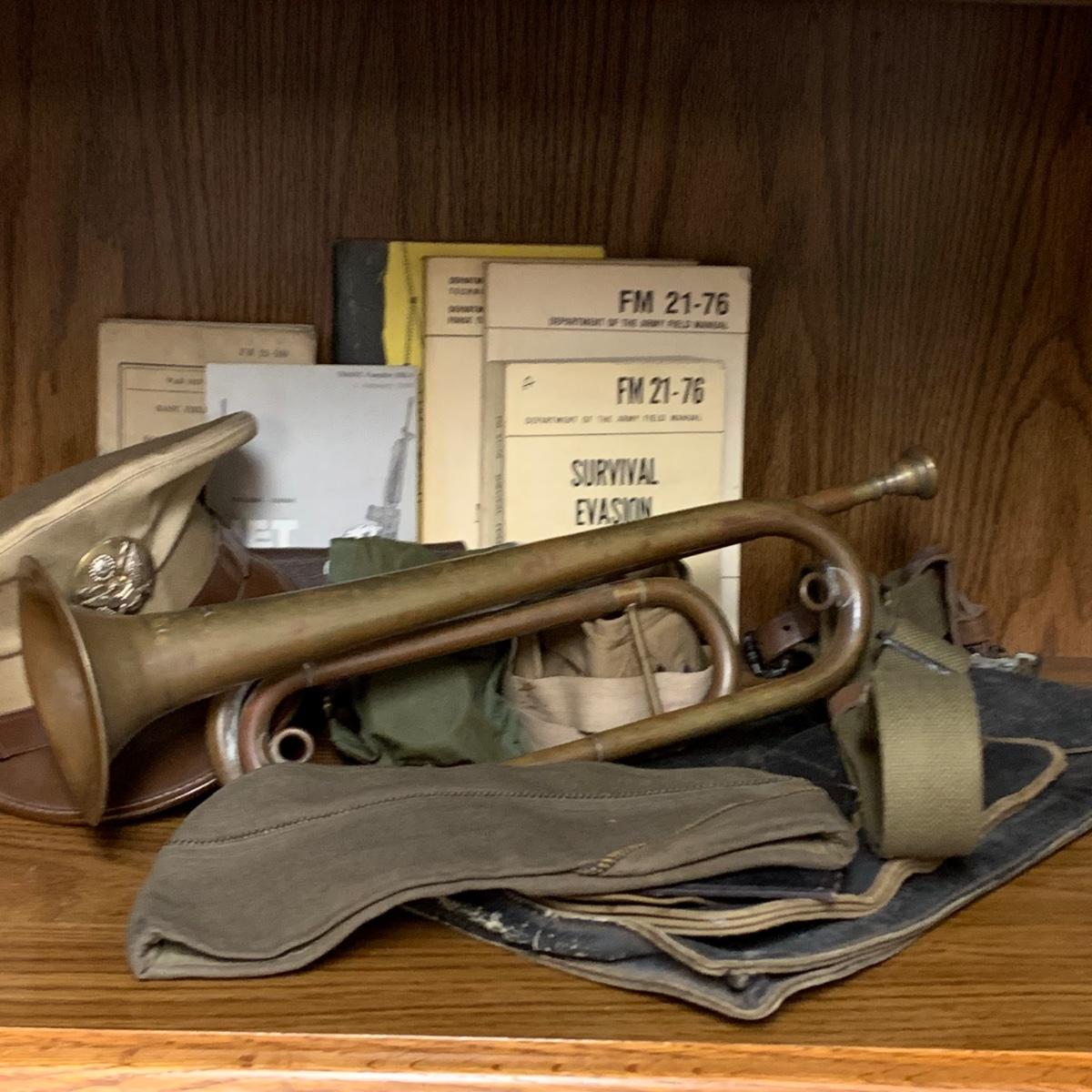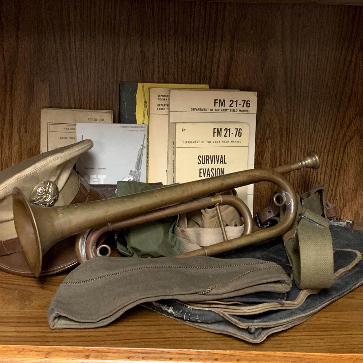 LOT 88R: Vintage US Regulation Military Bugle Trumpet Horn Brass, Leather Pouches, Uniform Hats & More