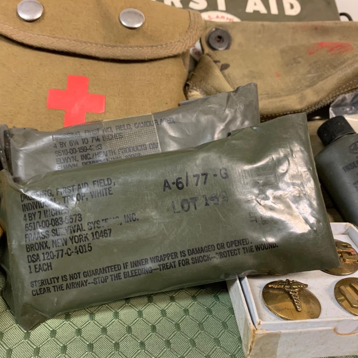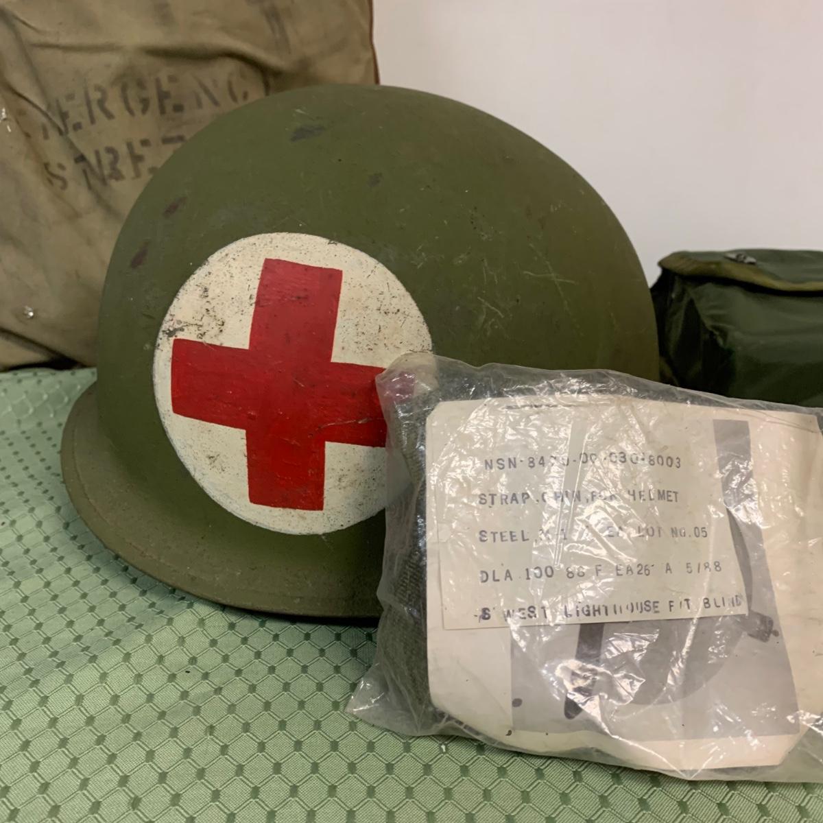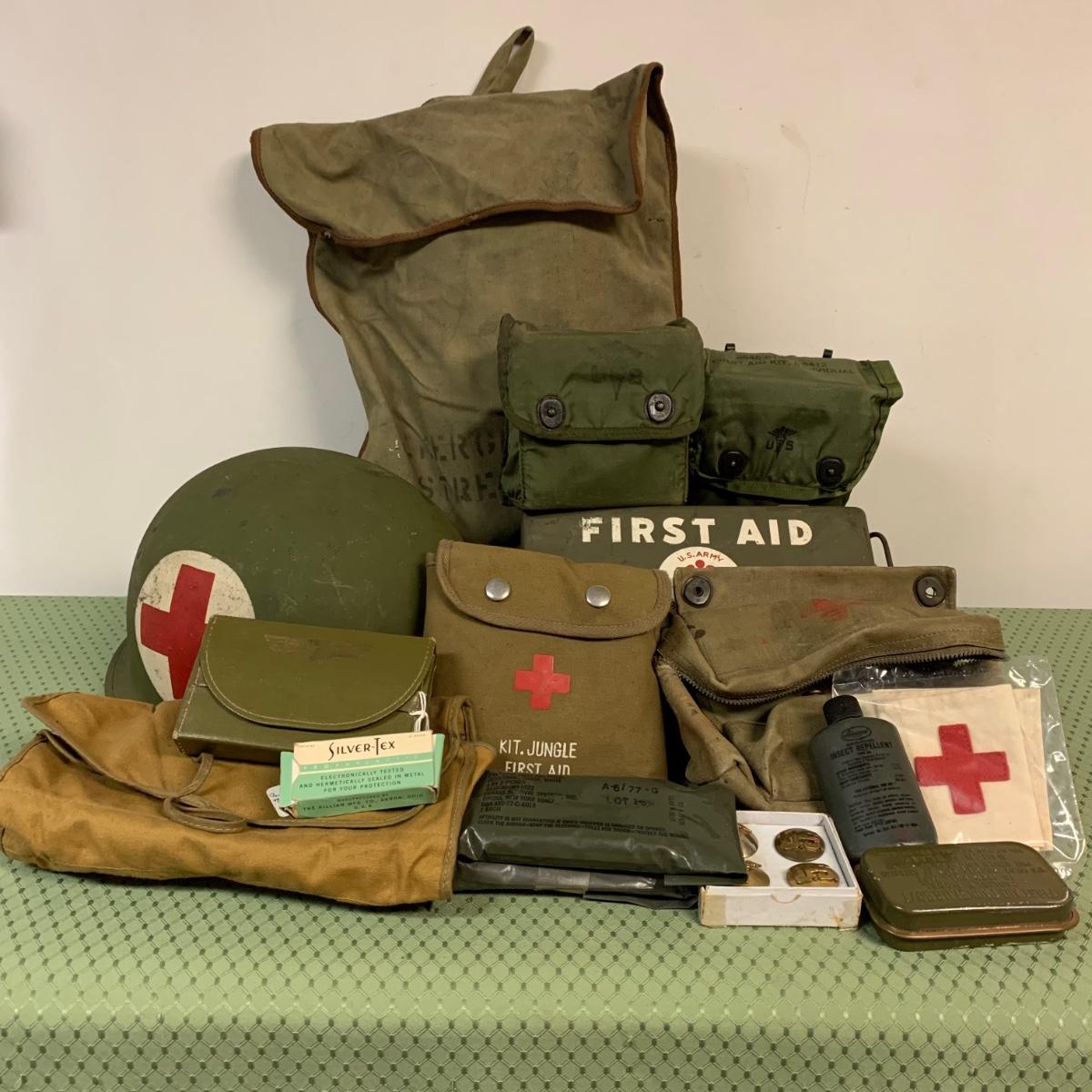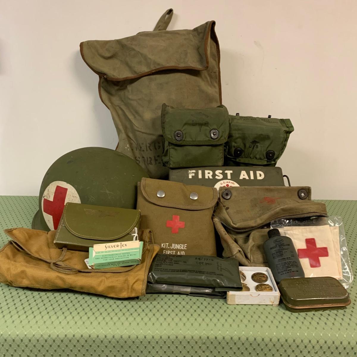 LOT 100R: Vintage Military First Aid: Pins, WWLL Medic Arm Band, Emergency Stretcher, Helmet & More