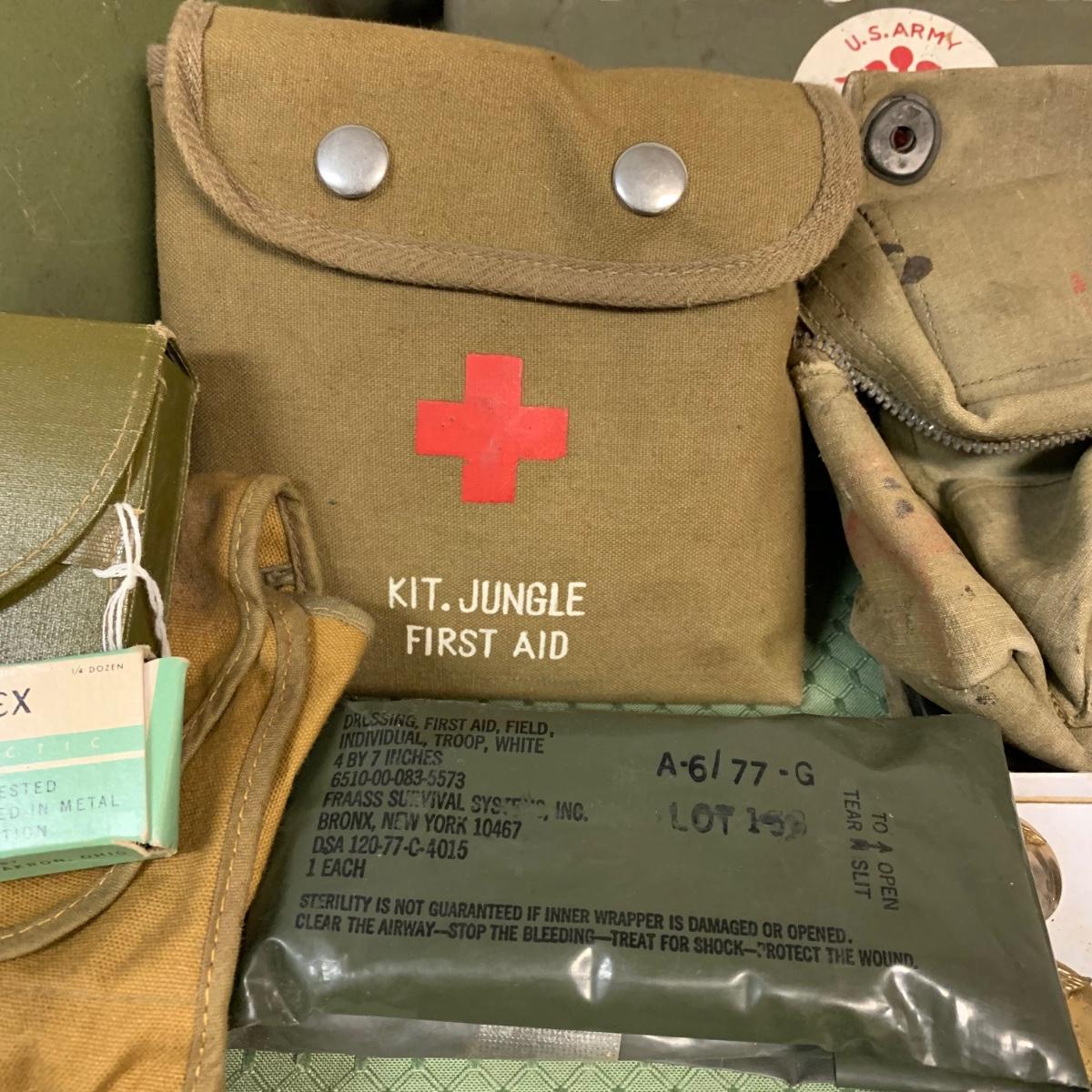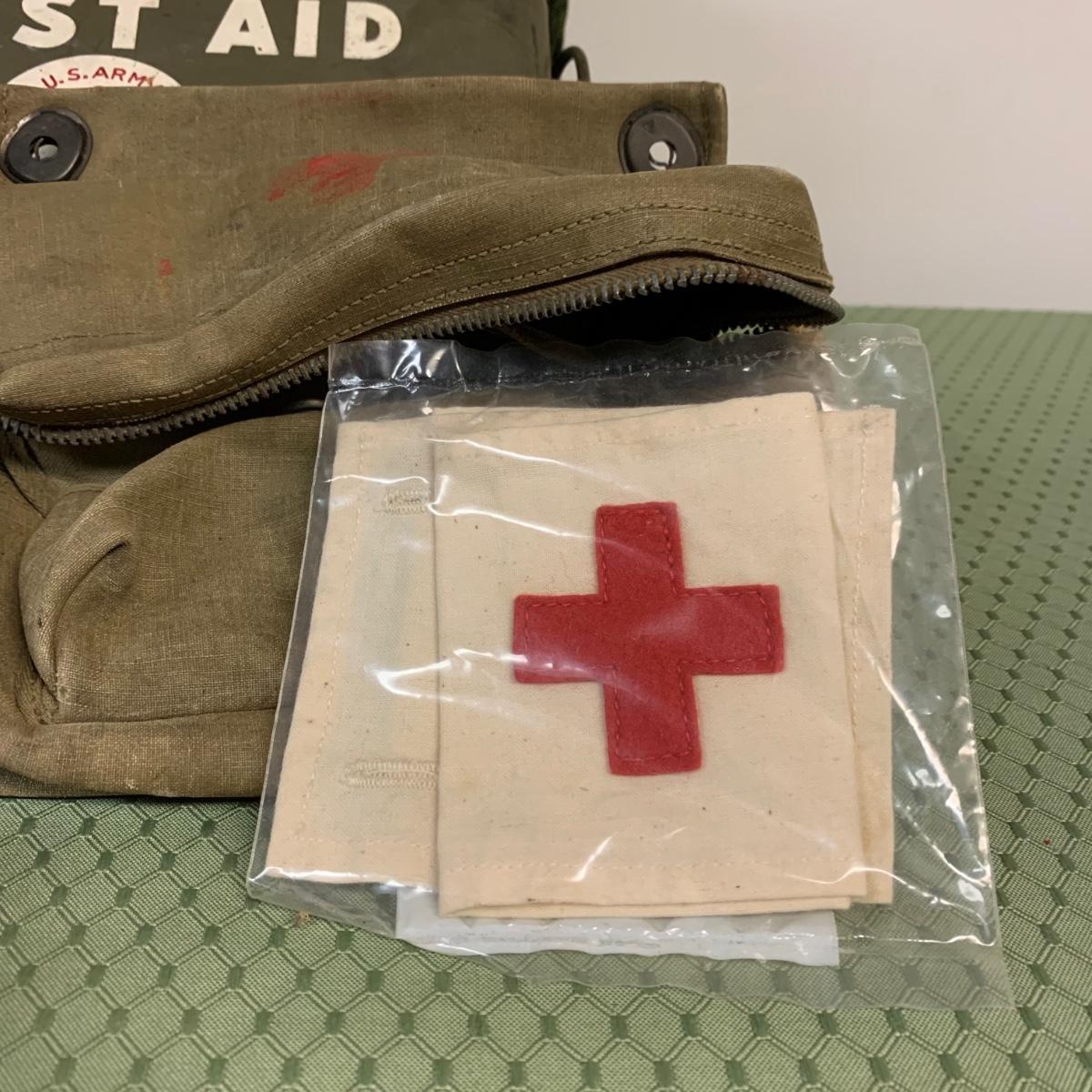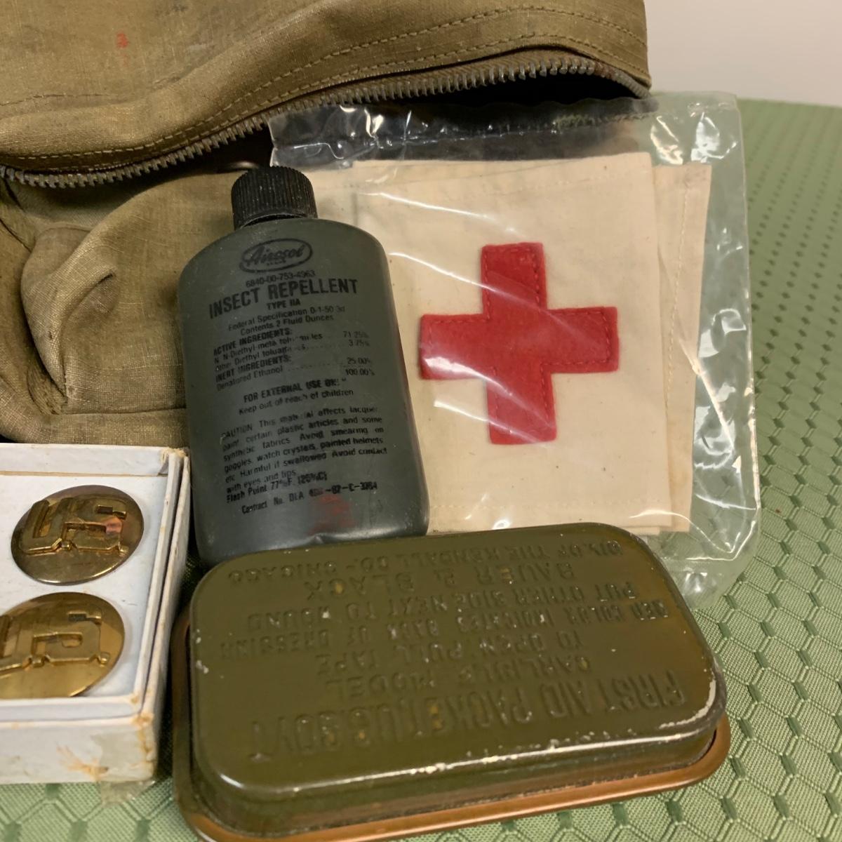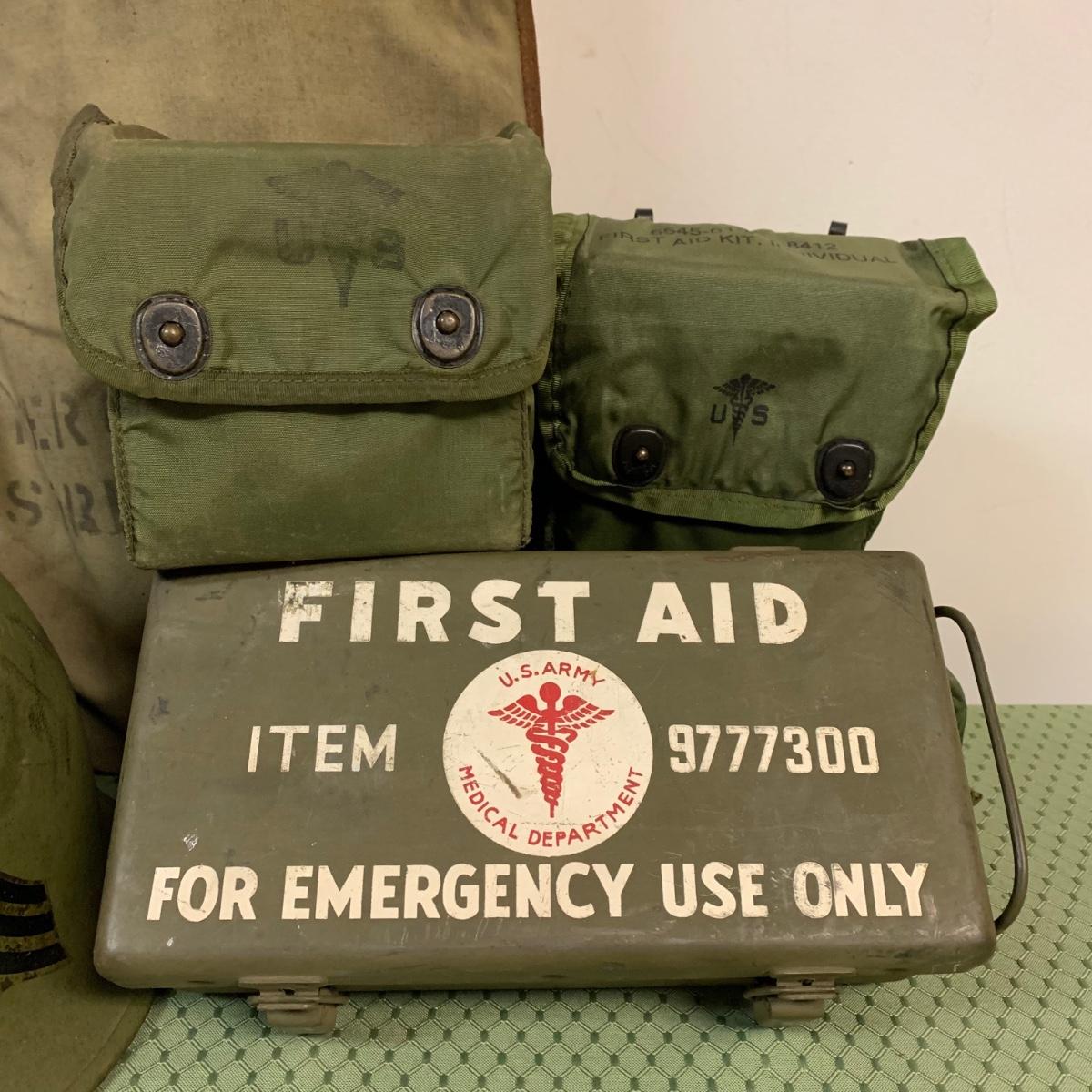 LOT 100R: Vintage Military First Aid: Pins, WWLL Medic Arm Band, Emergency Stretcher, Helmet & More