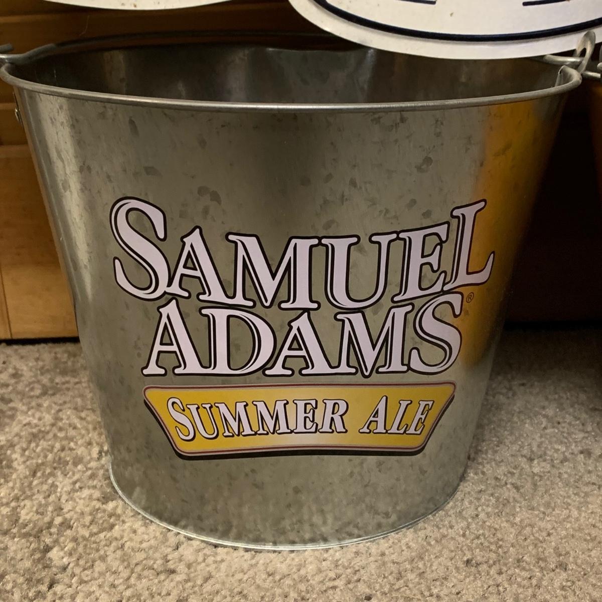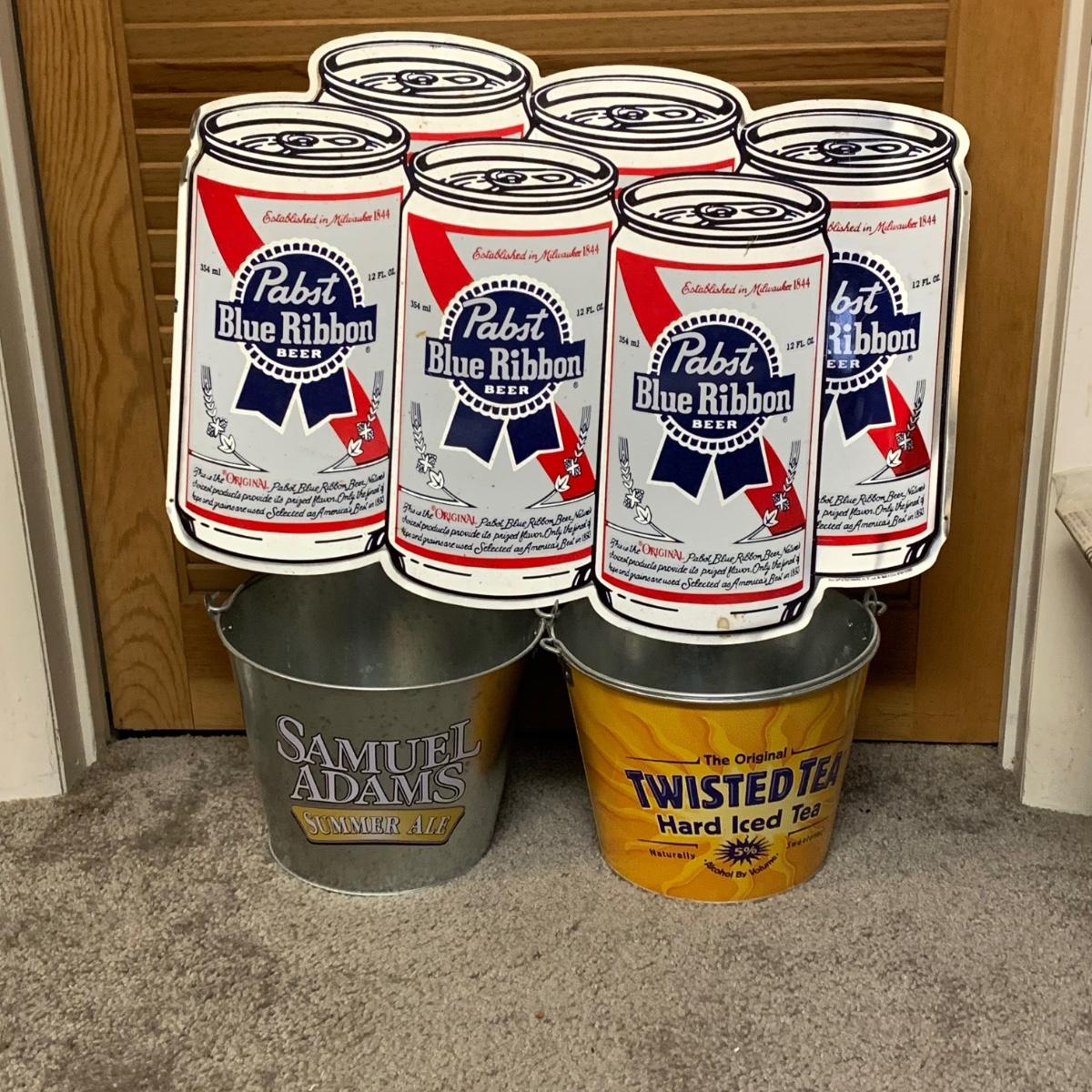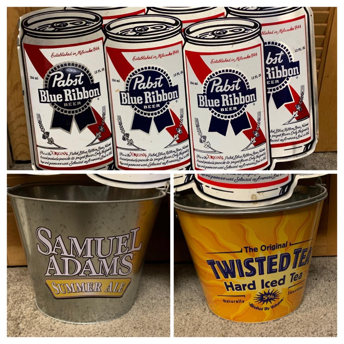 LOT 104R: Metal Pabst Blue Ribbon Sign, Twisted Iced & Samuel Adams Buckets