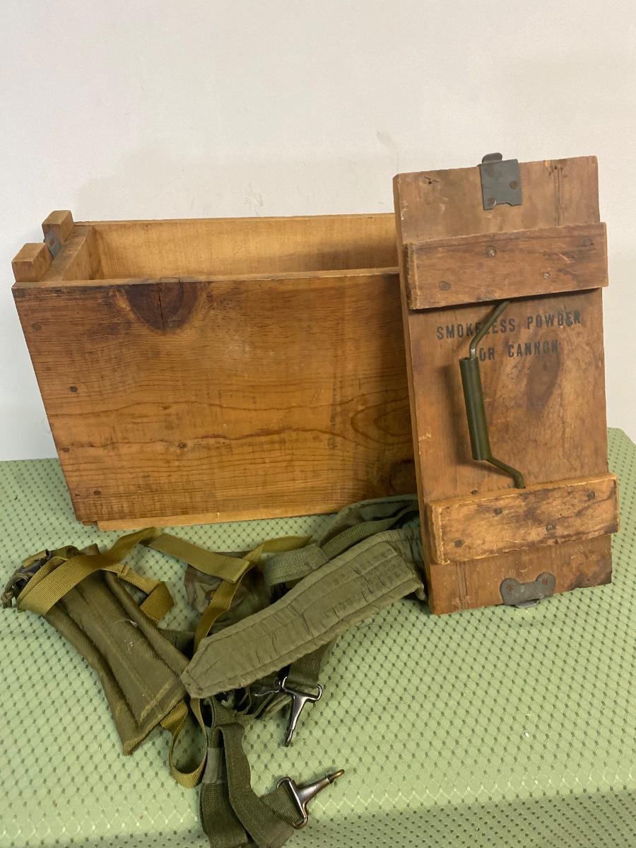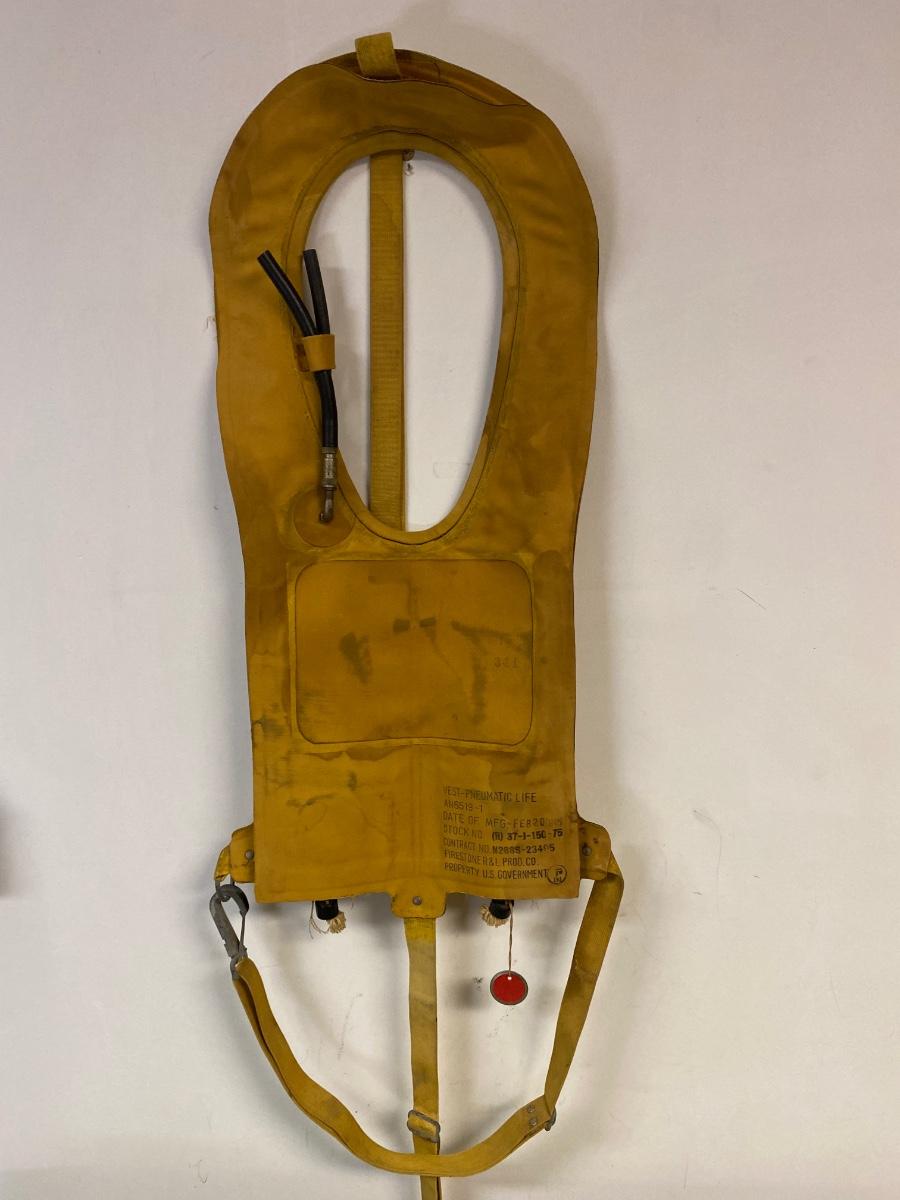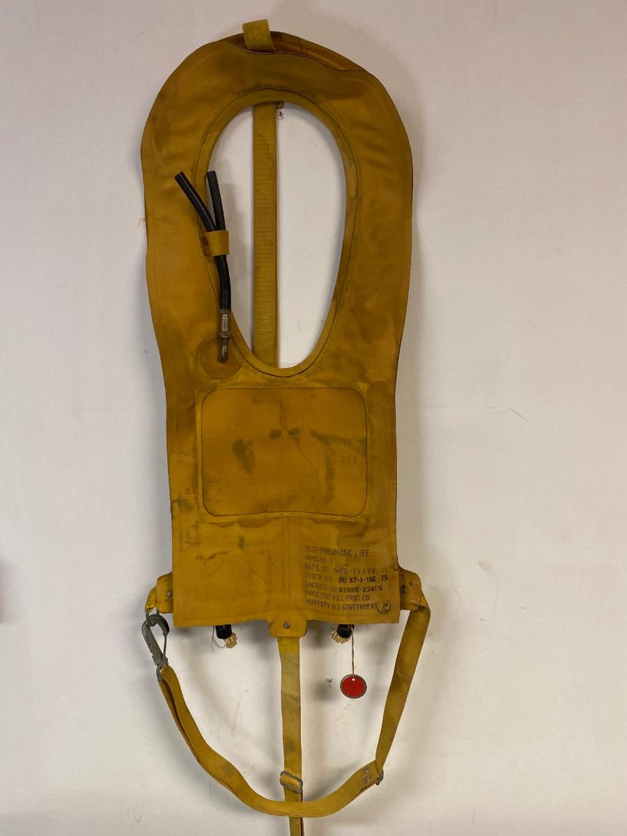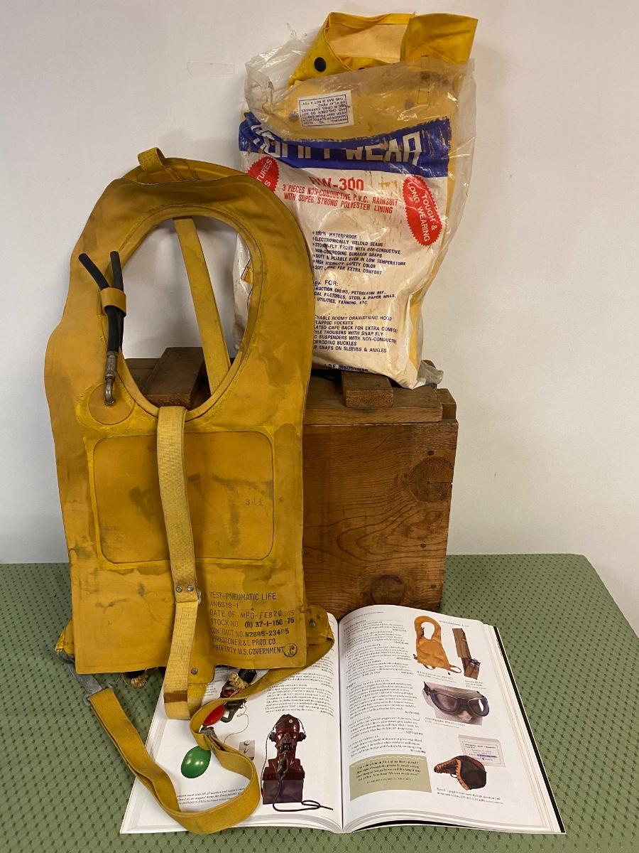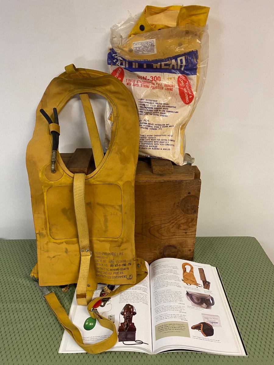 LOT 123: Vintage WWII Pneumatic Life Vest, Vintage Rain Gear, Vintage smokeless Powered Box