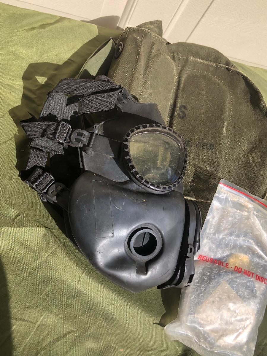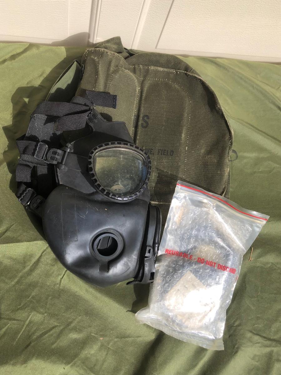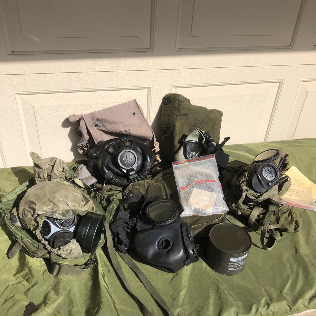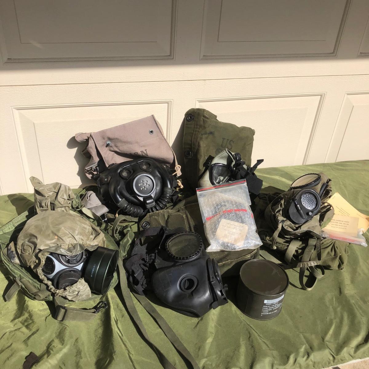 Includes 5 gas masks with bags and a canister with a biological mask in it.