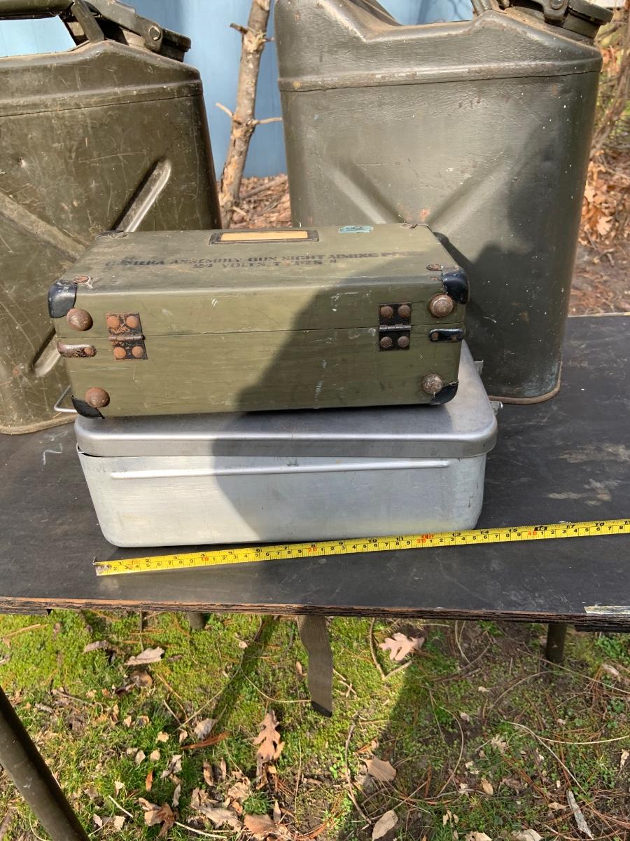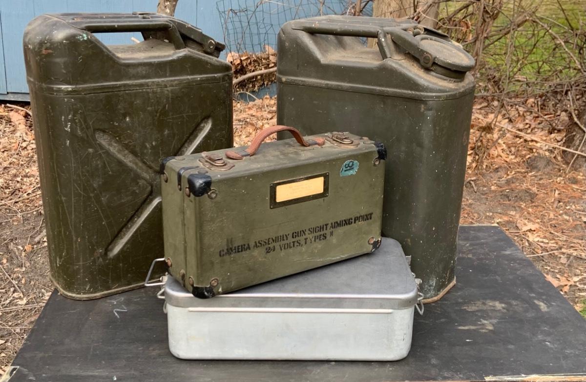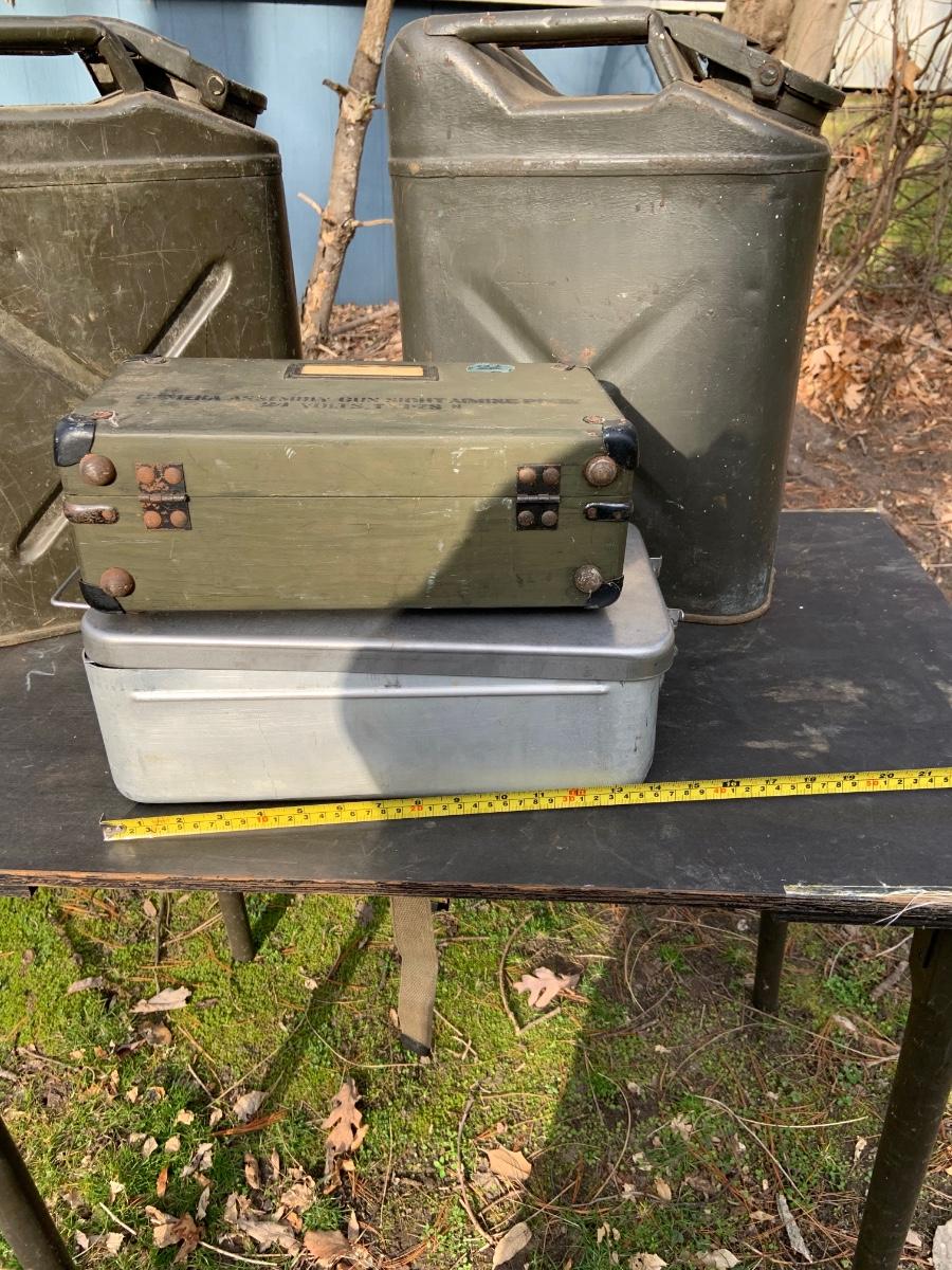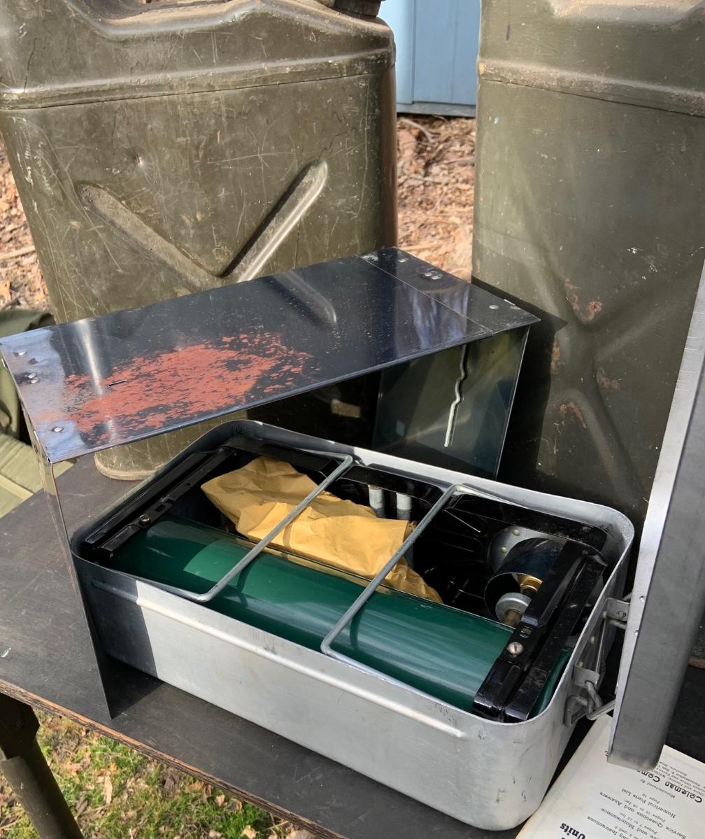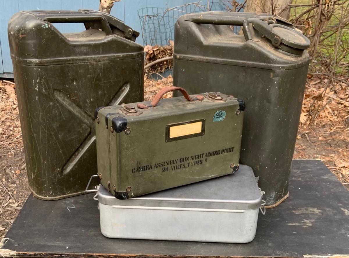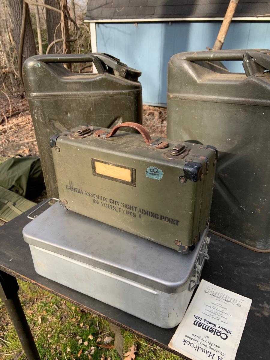 LOT:158G: US Military Water Cans, Camera Box and Coleman Stove