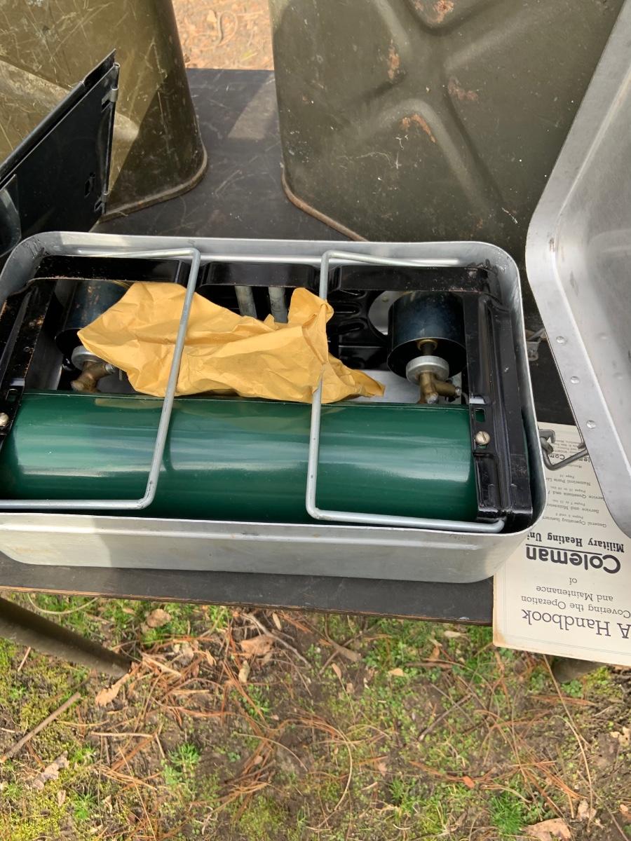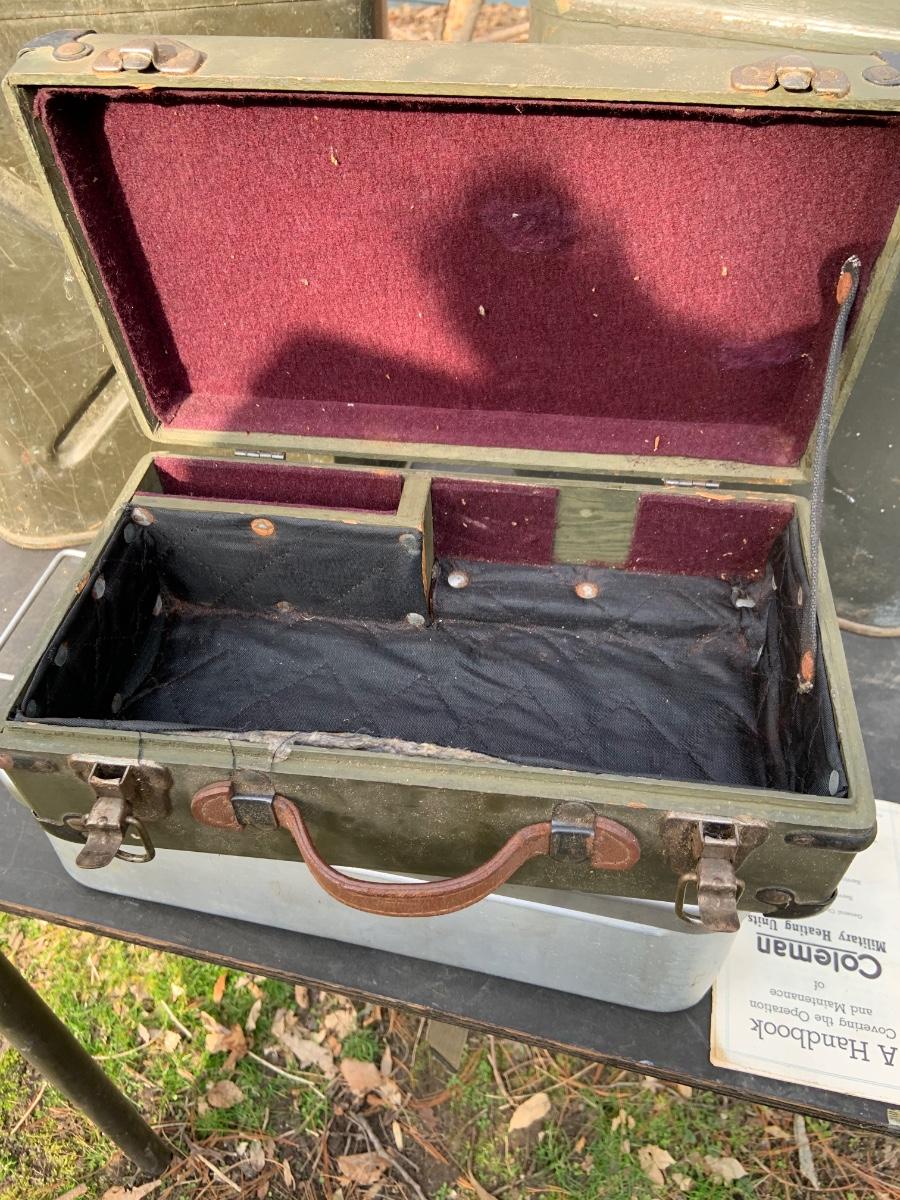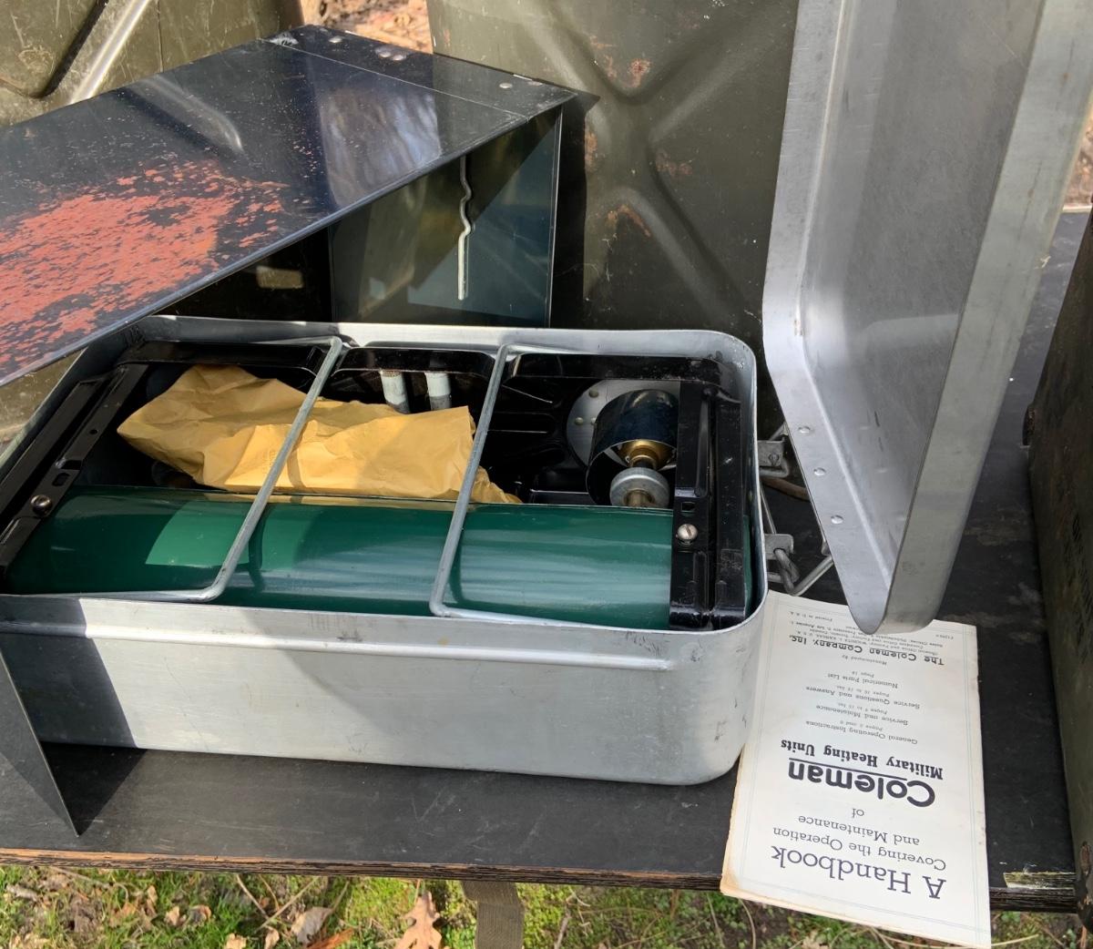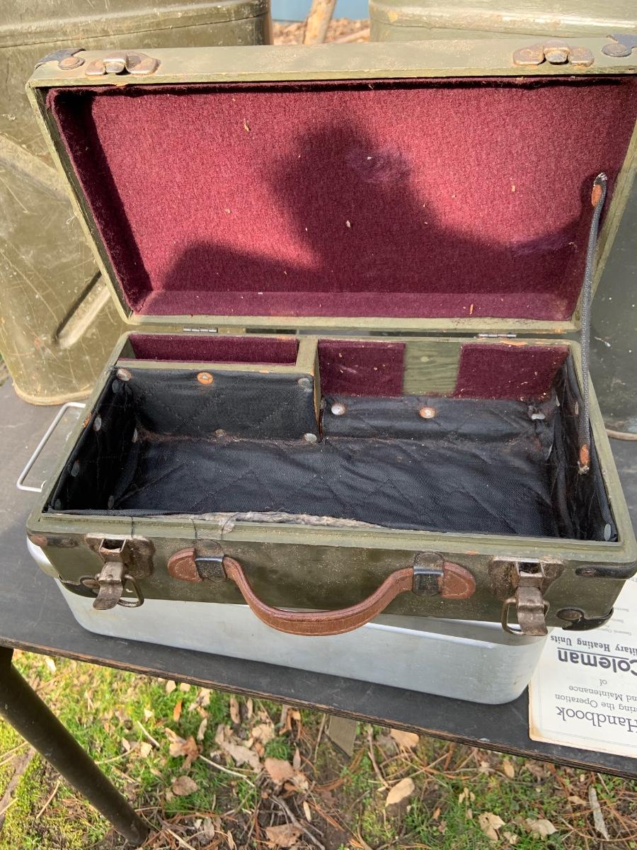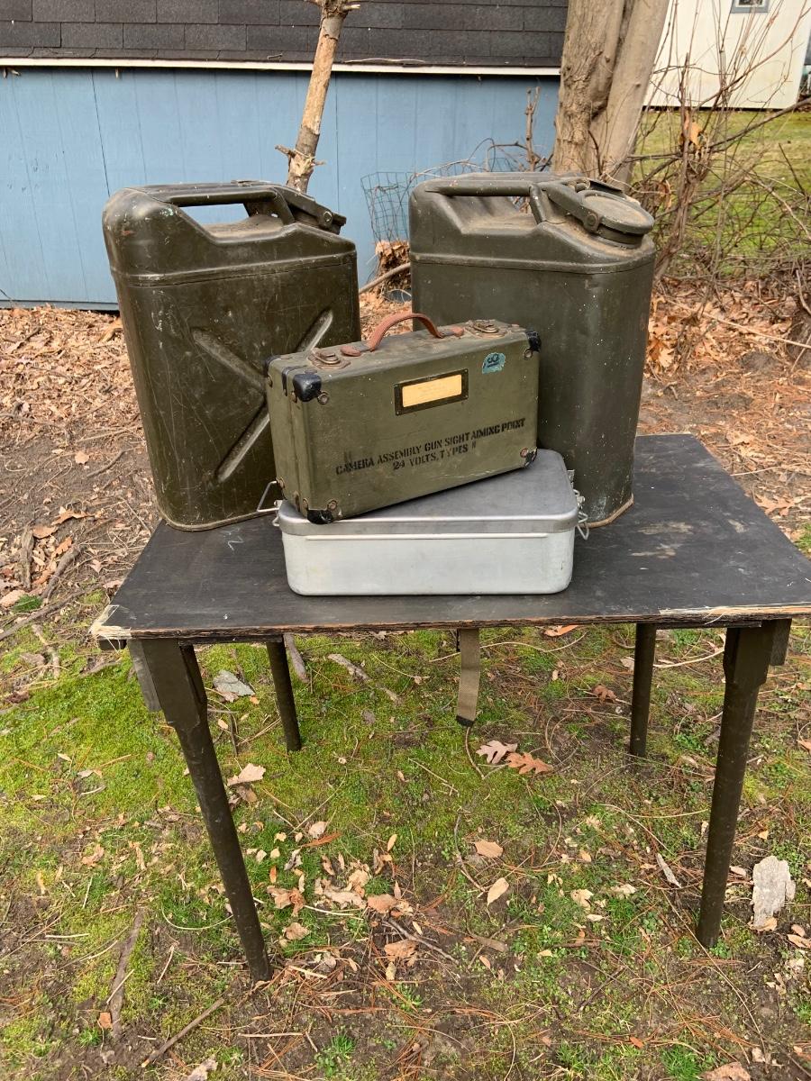 LOT:158G: US Military Water Cans, Camera Box and Coleman Stove