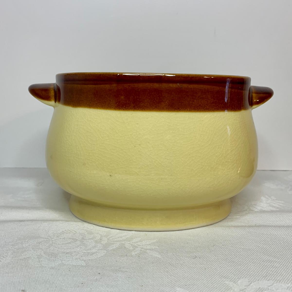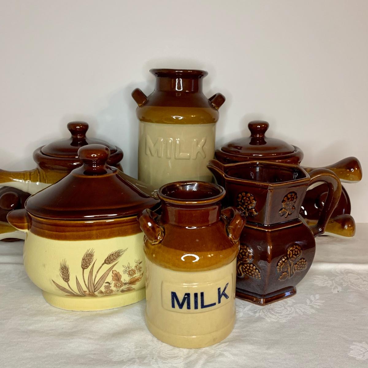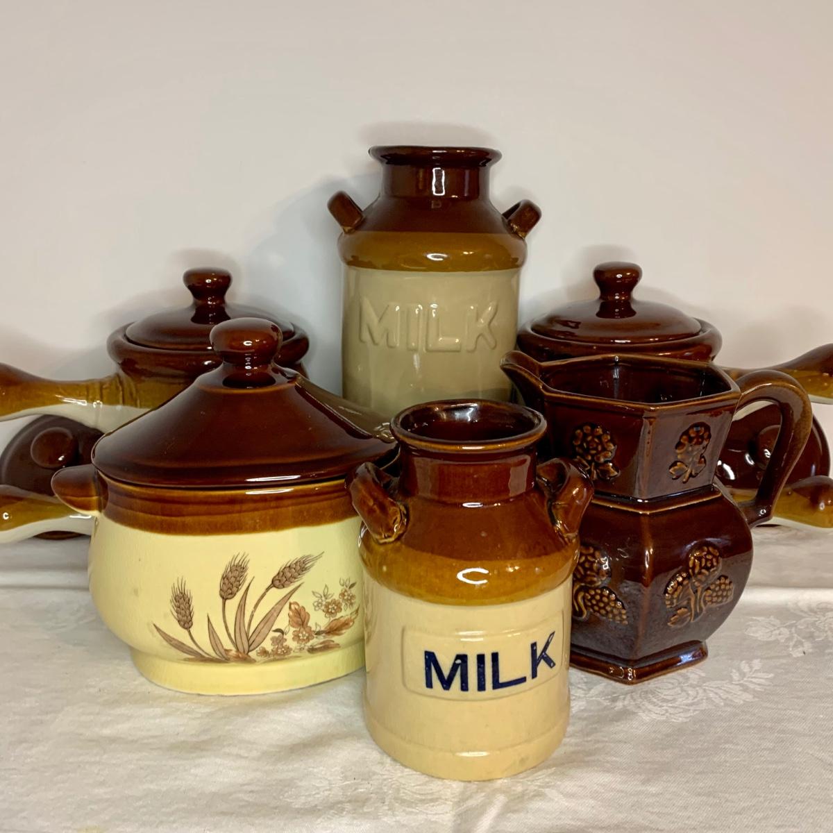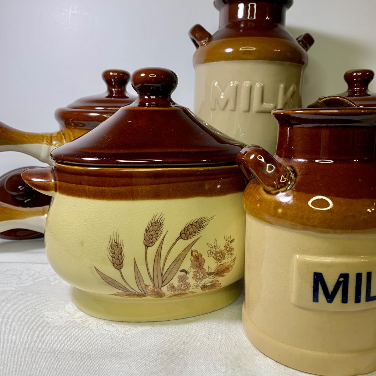 LOT 21: Country Crocks in Browns, Yellows & Tan: Soup Bowls, Pitcher Utensil Holders