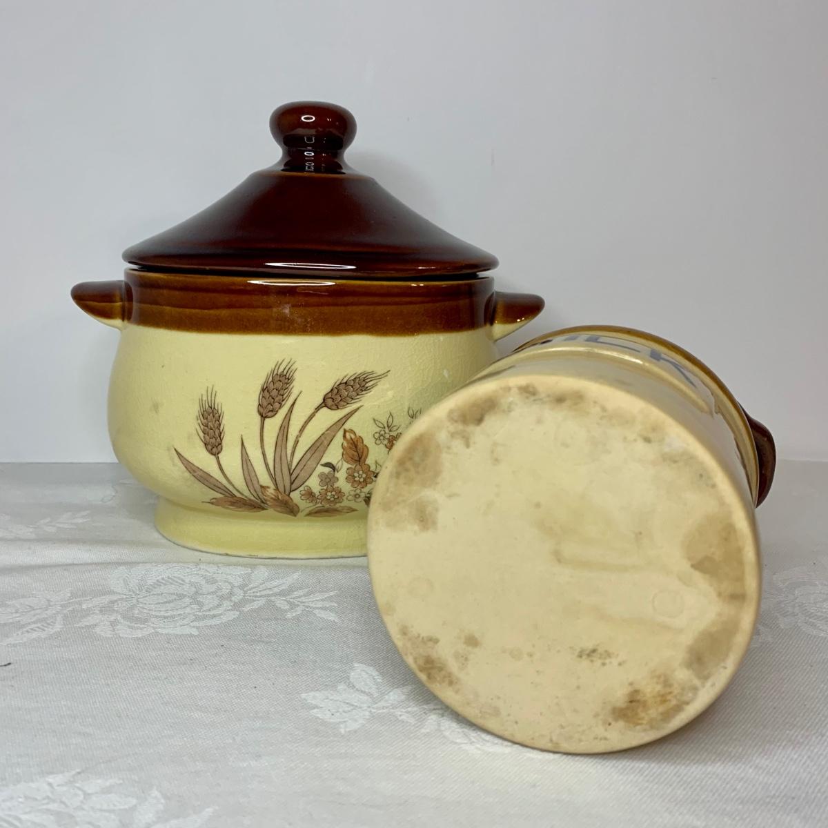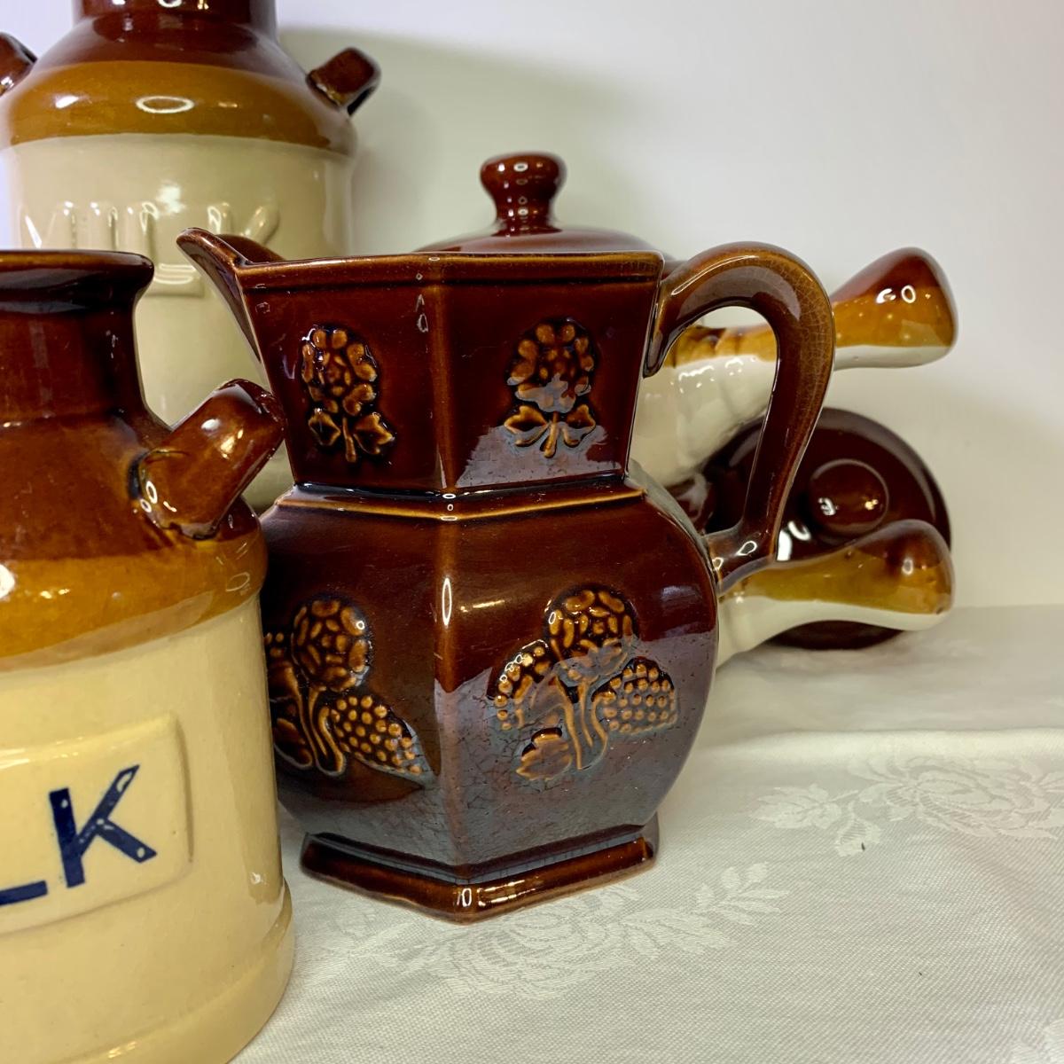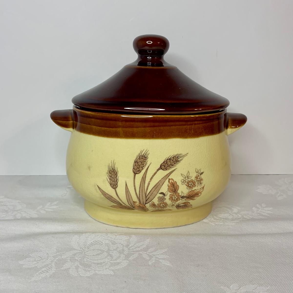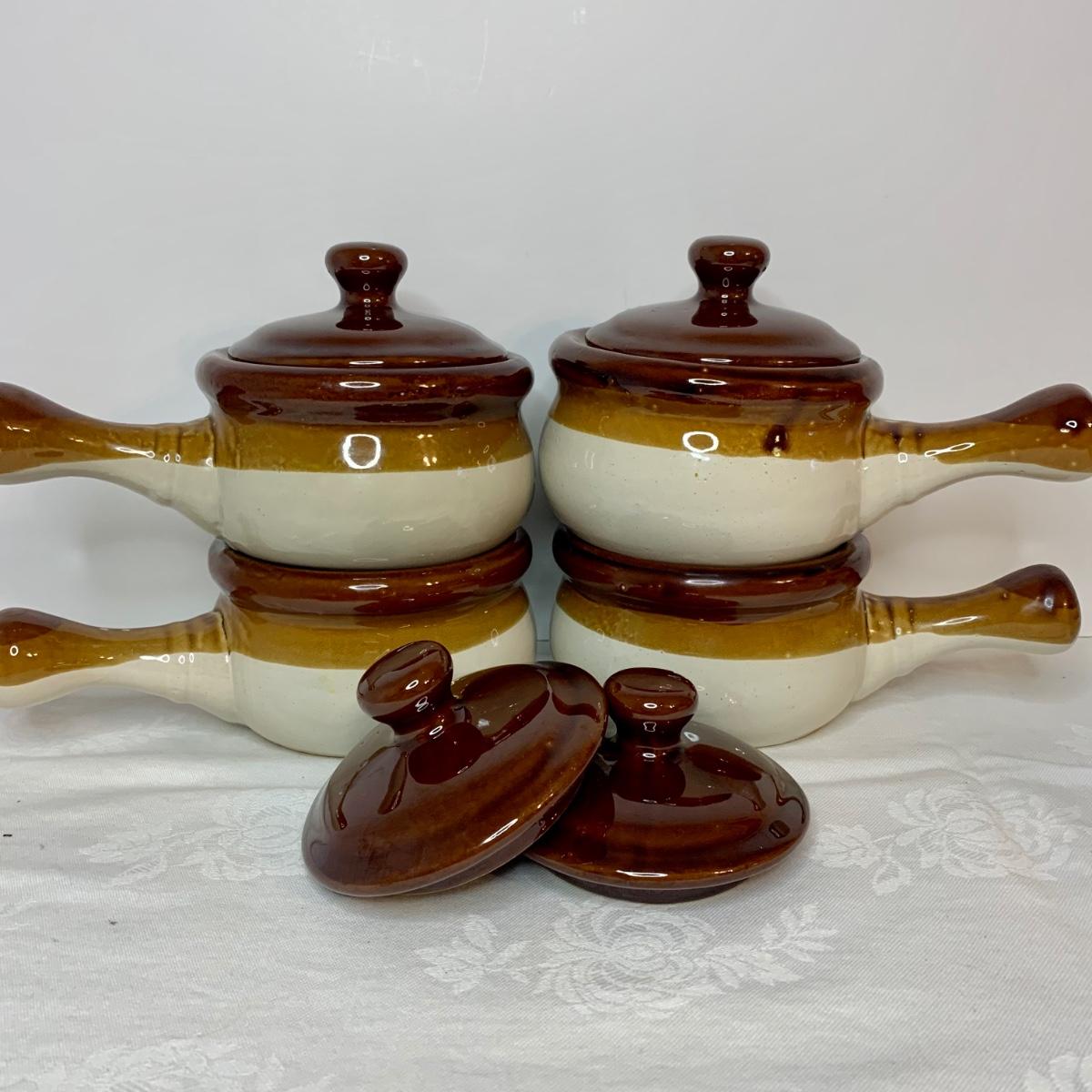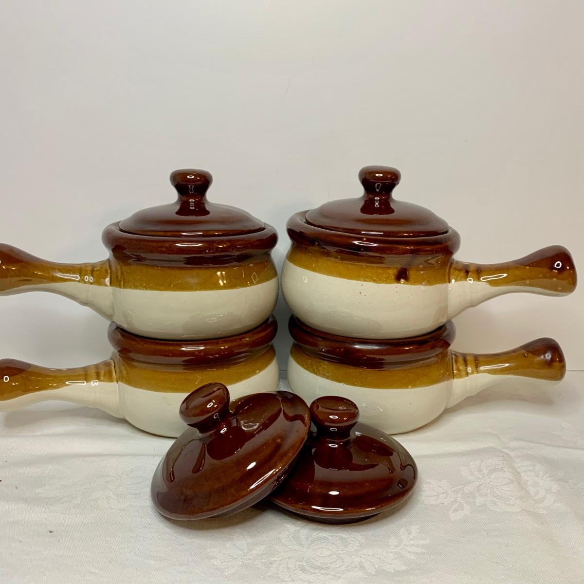 LOT 21: Country Crocks in Browns, Yellows & Tan: Soup Bowls, Pitcher Utensil Holders